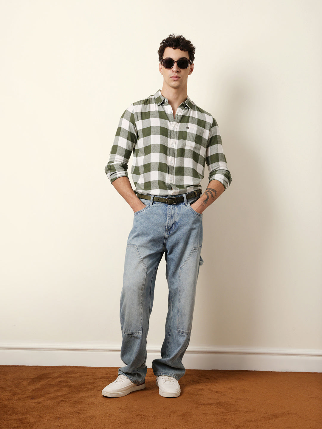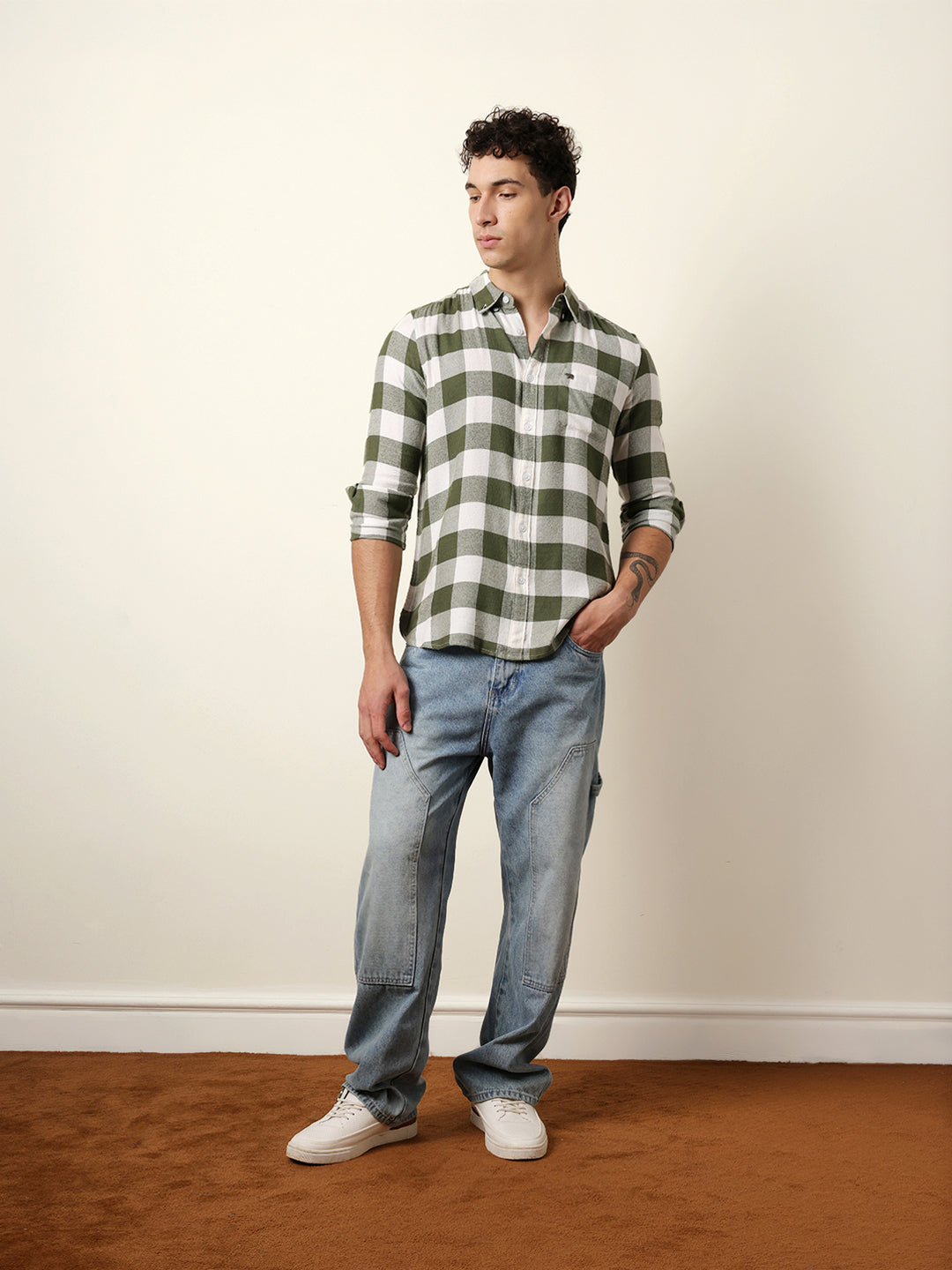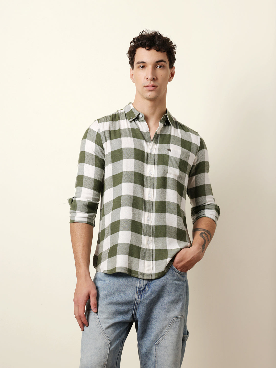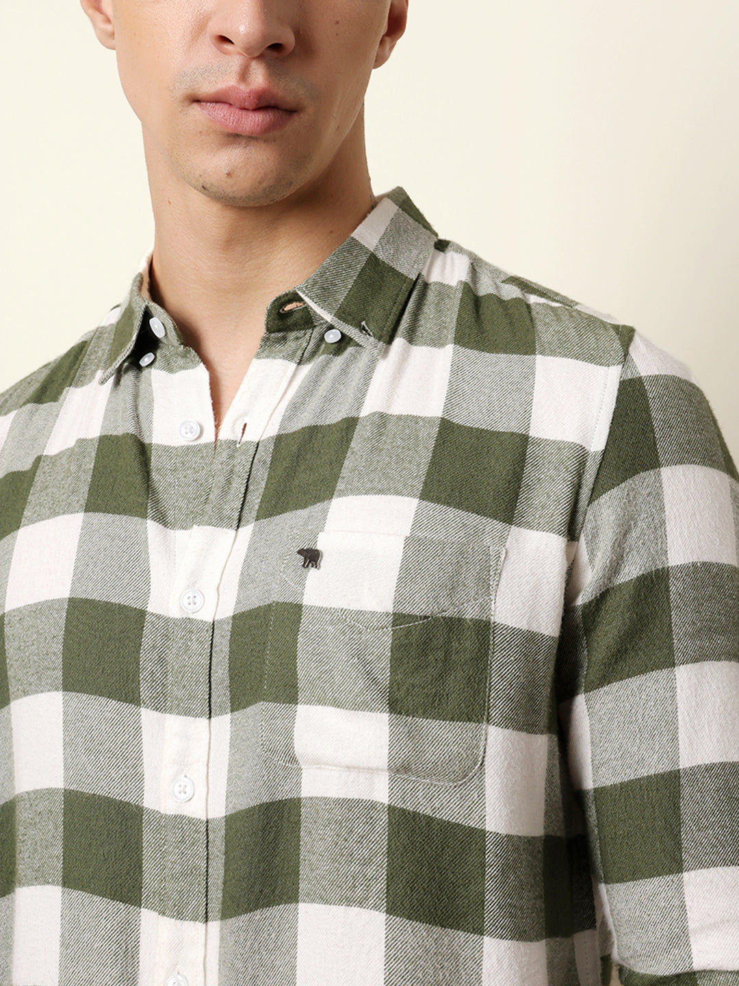Olive & White Flannel Check Slim Fit Casual Shirt