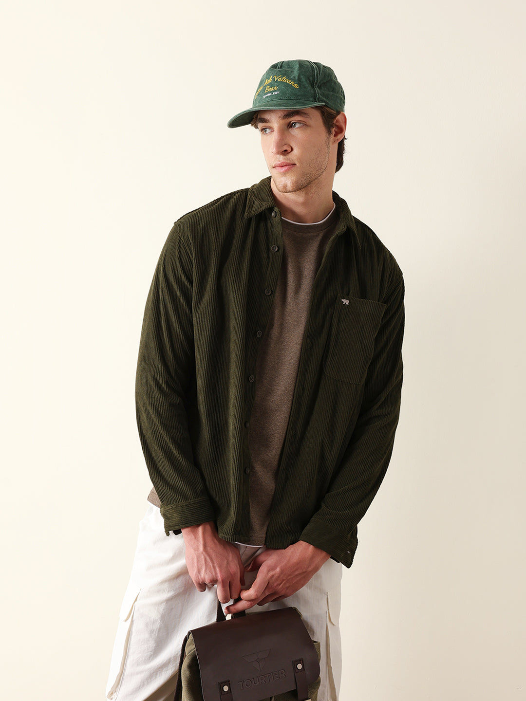 Dark Green Corduroy Relaxed Fit Textured Overshirt