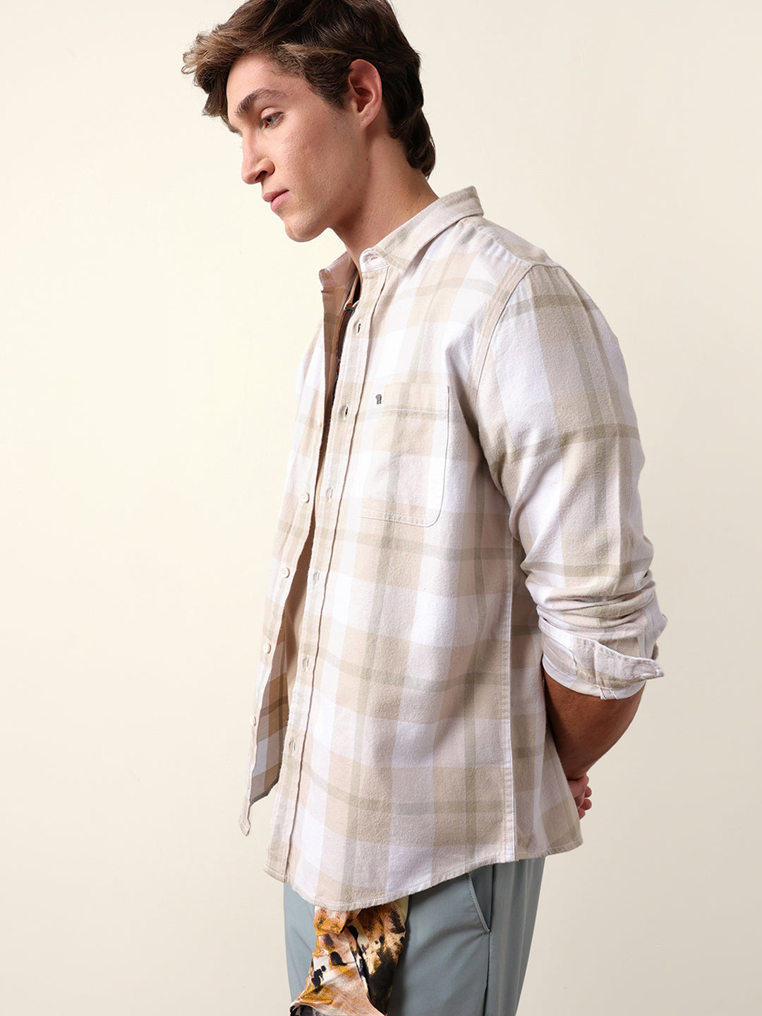 Beige & Green Checked Flannel Regular Fit Casual Shirt