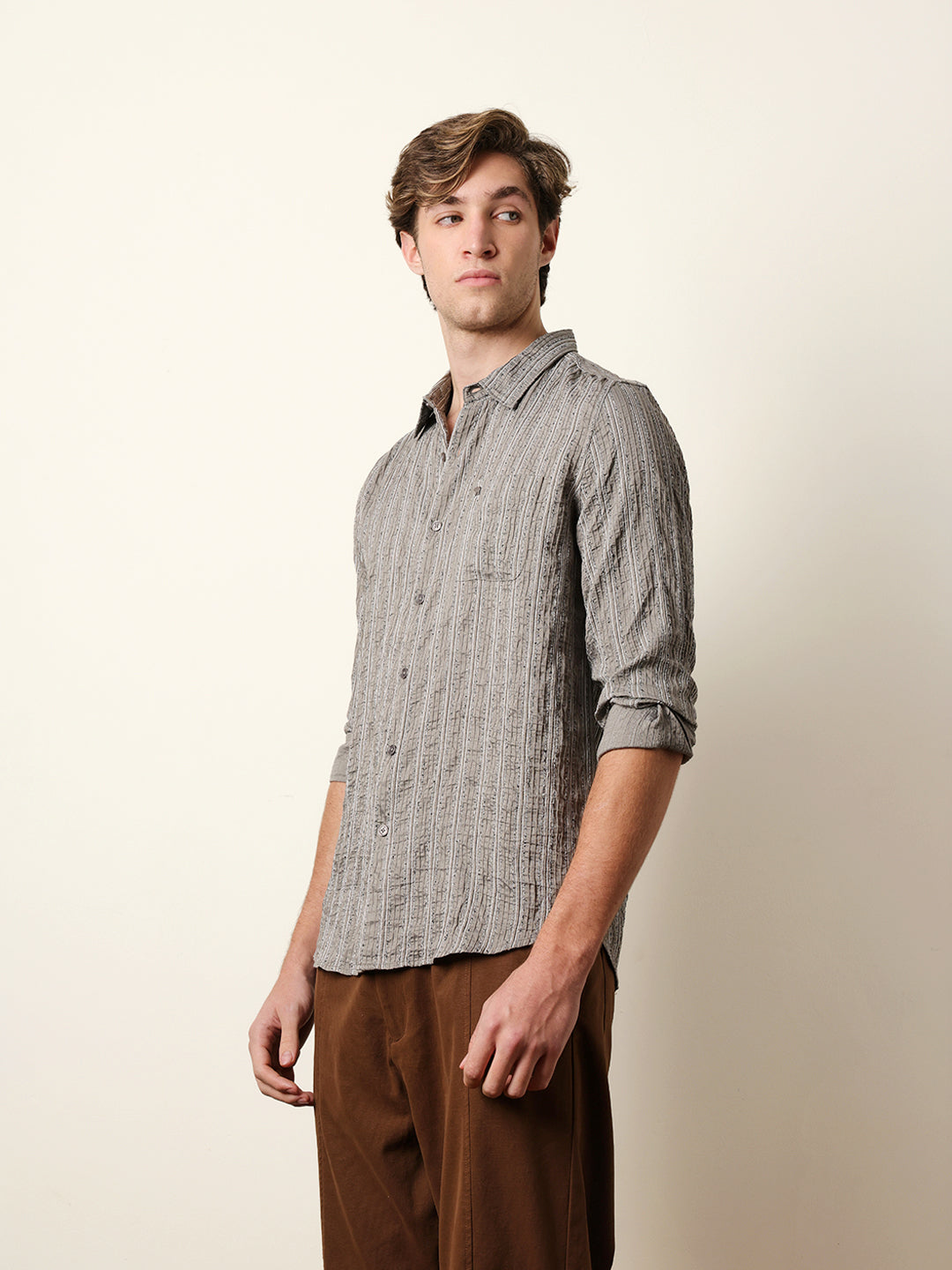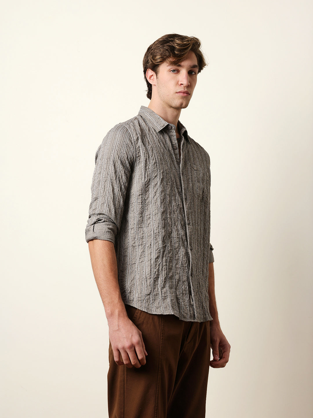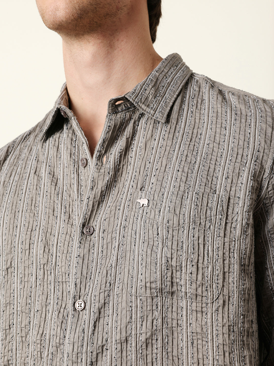 Grey Vertical Seersucker Pinstripe Slim Fit Casual Shirt