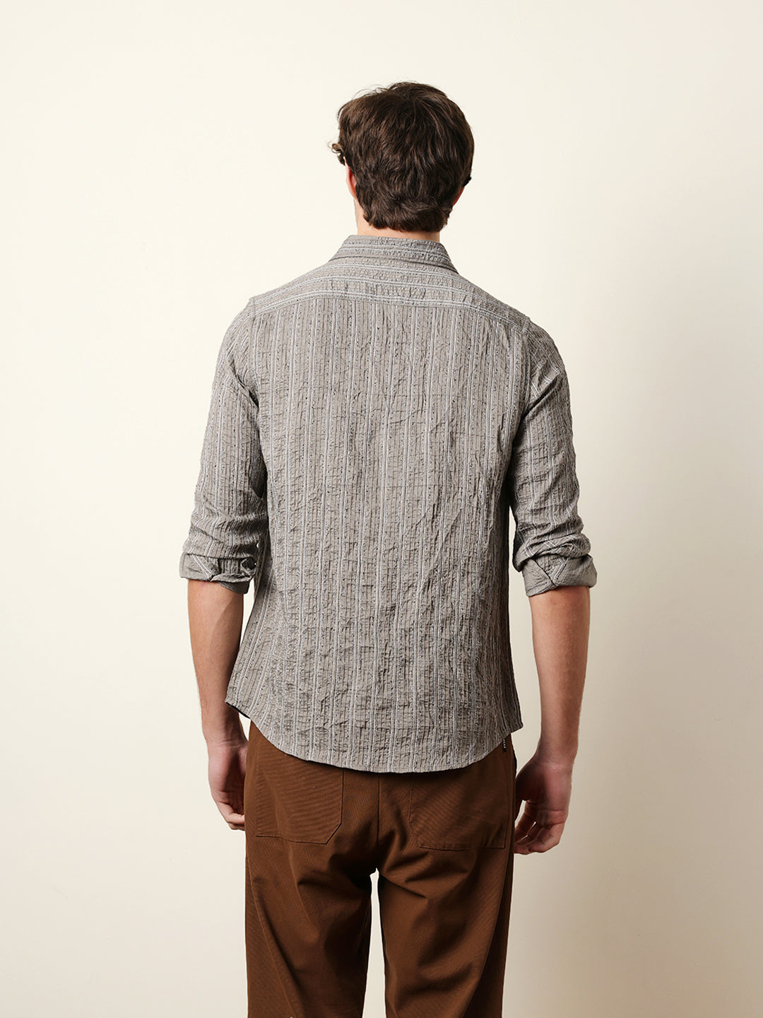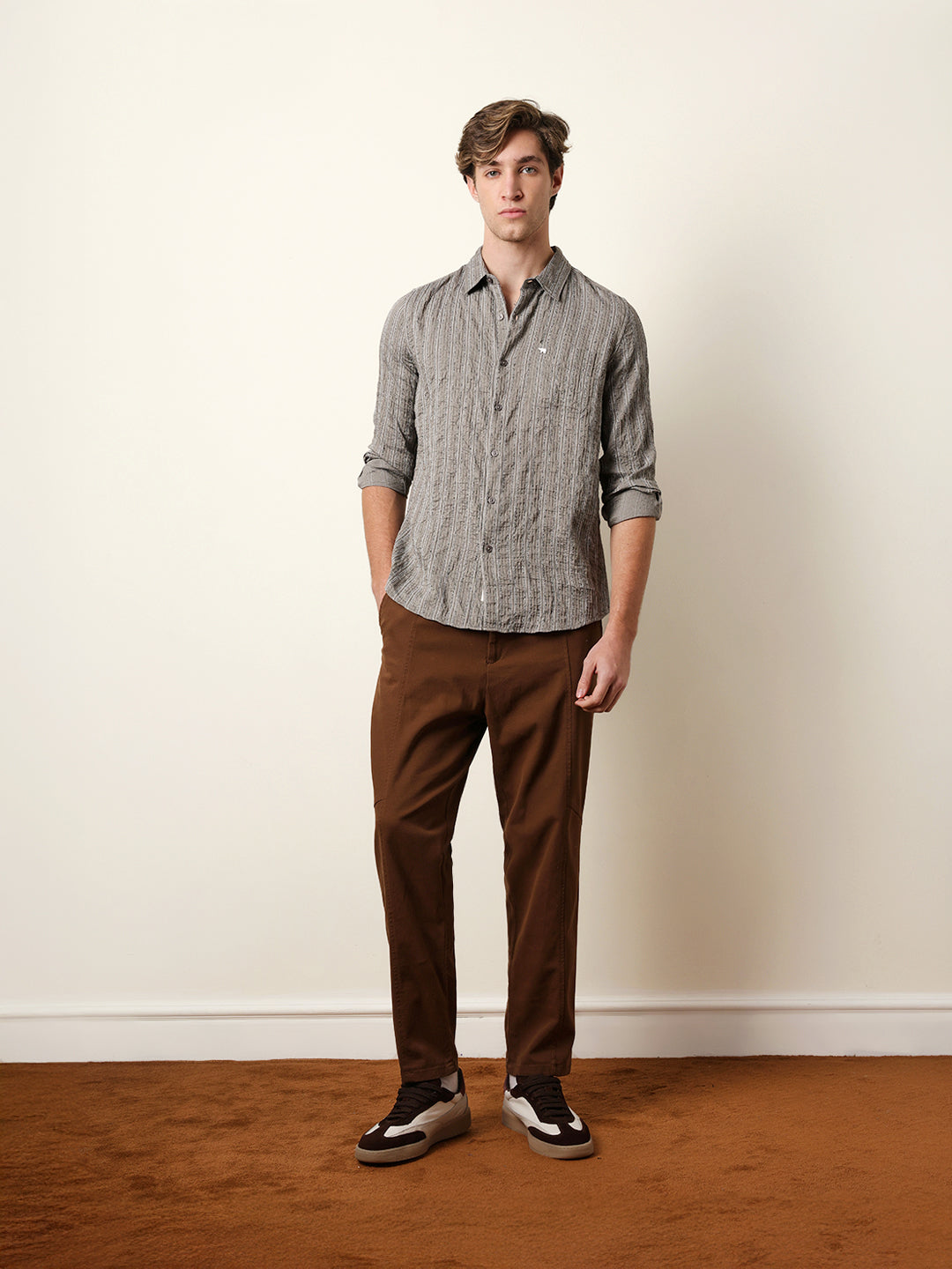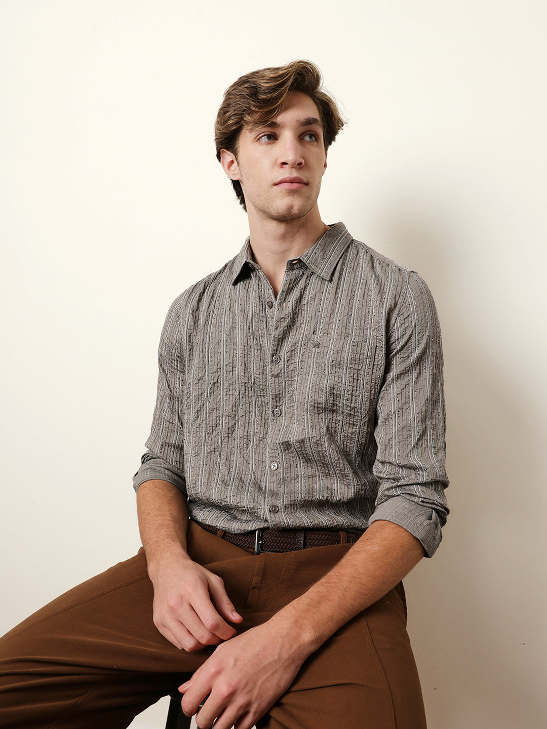 Grey Vertical Seersucker Pinstripe Slim Fit Casual Shirt