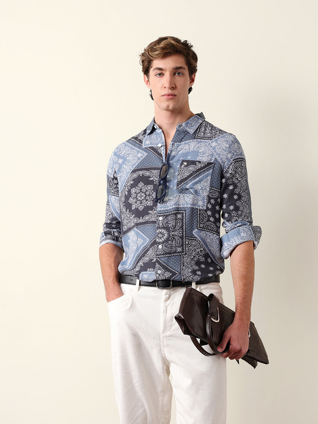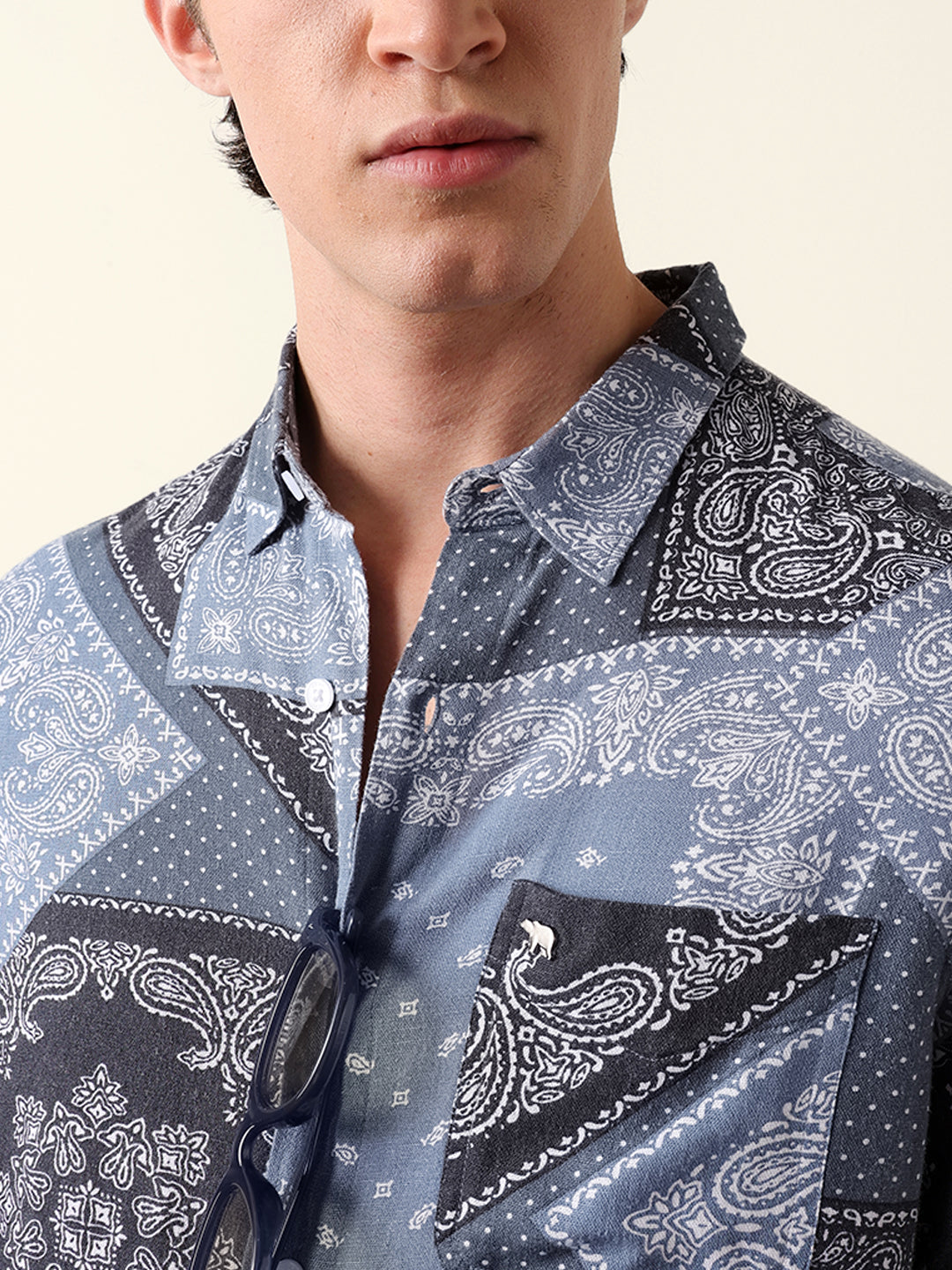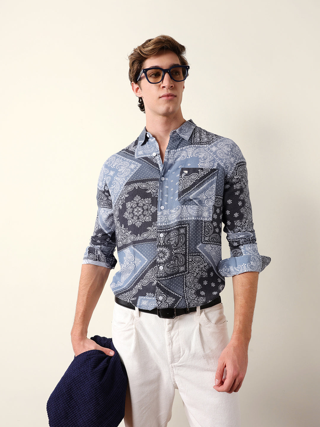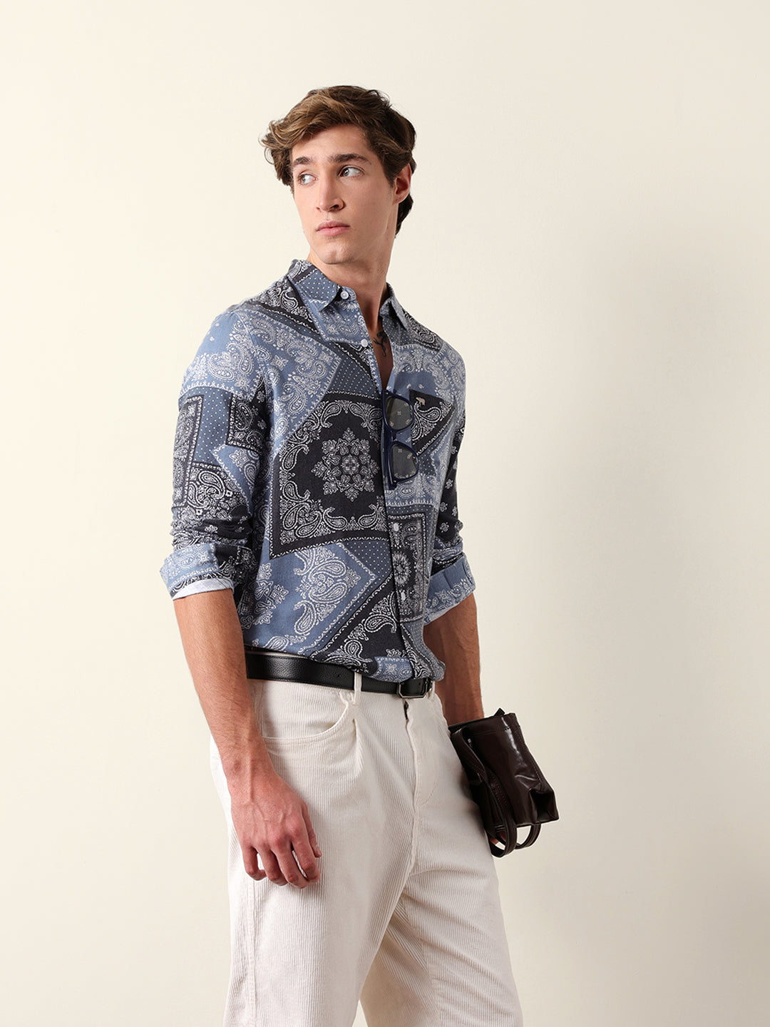 Blue Paisley Patchwork Printed Slim Fit Casual Shirt