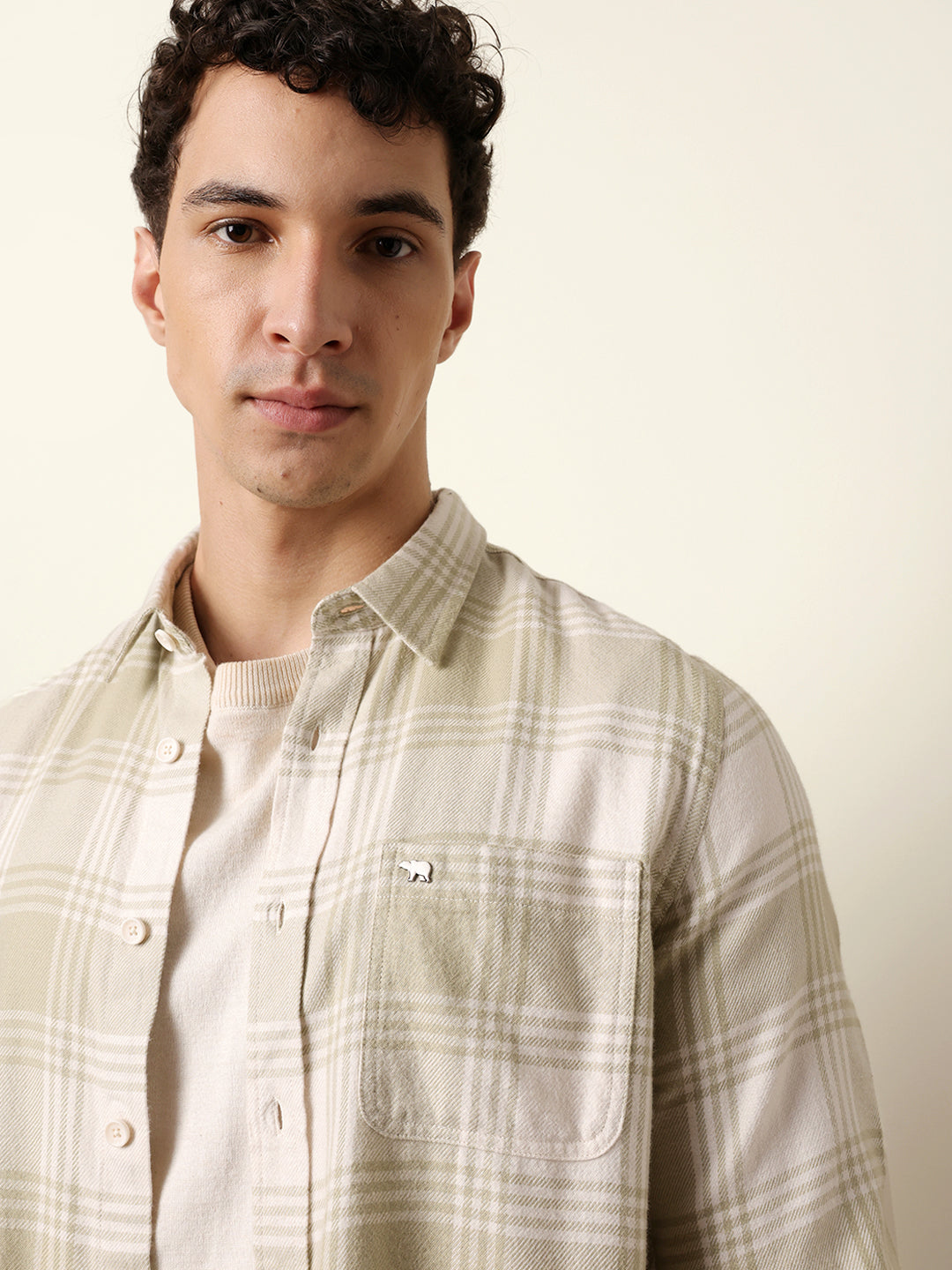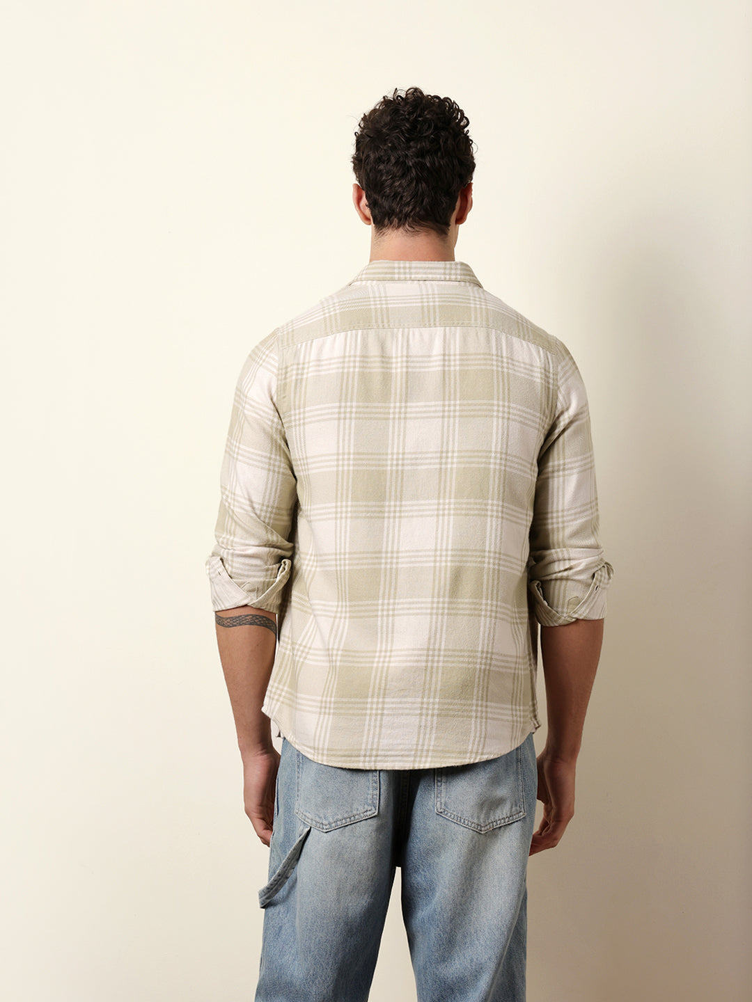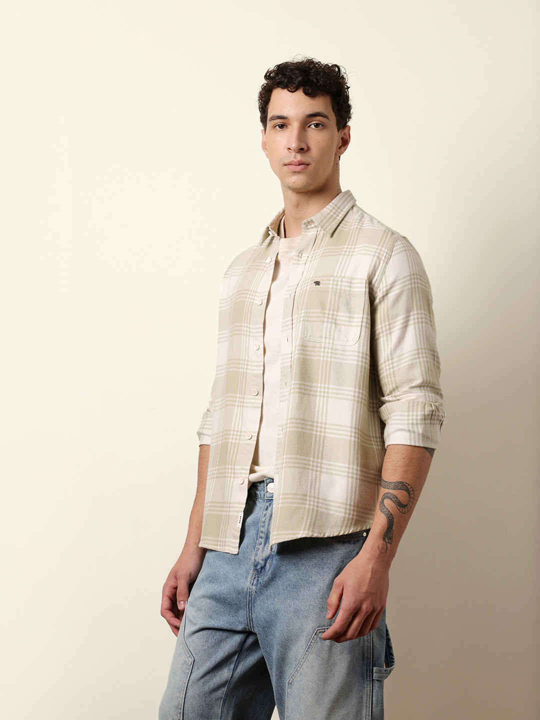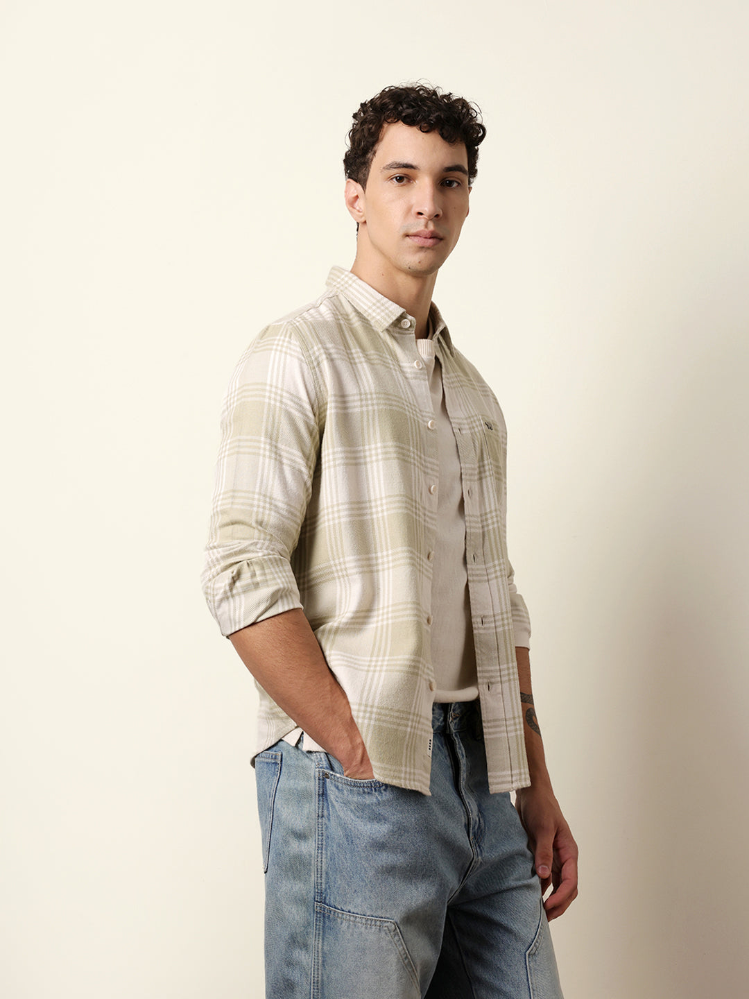 Green & Cream Tartan Check Flannel Regular Fit Casual Shirt
