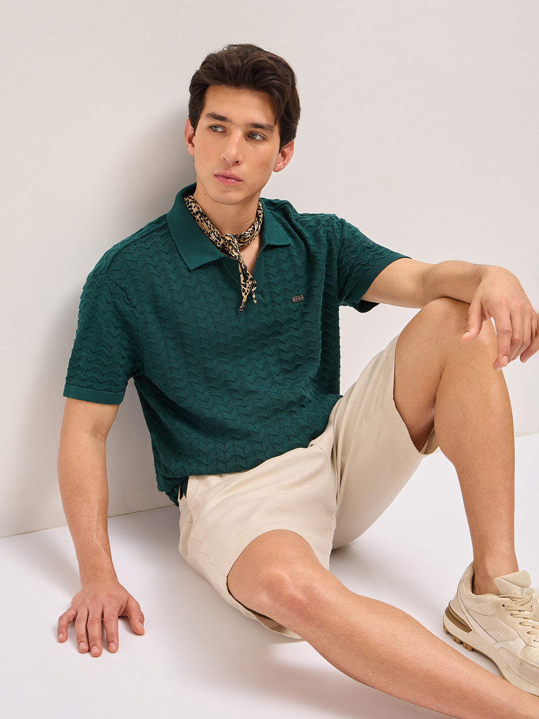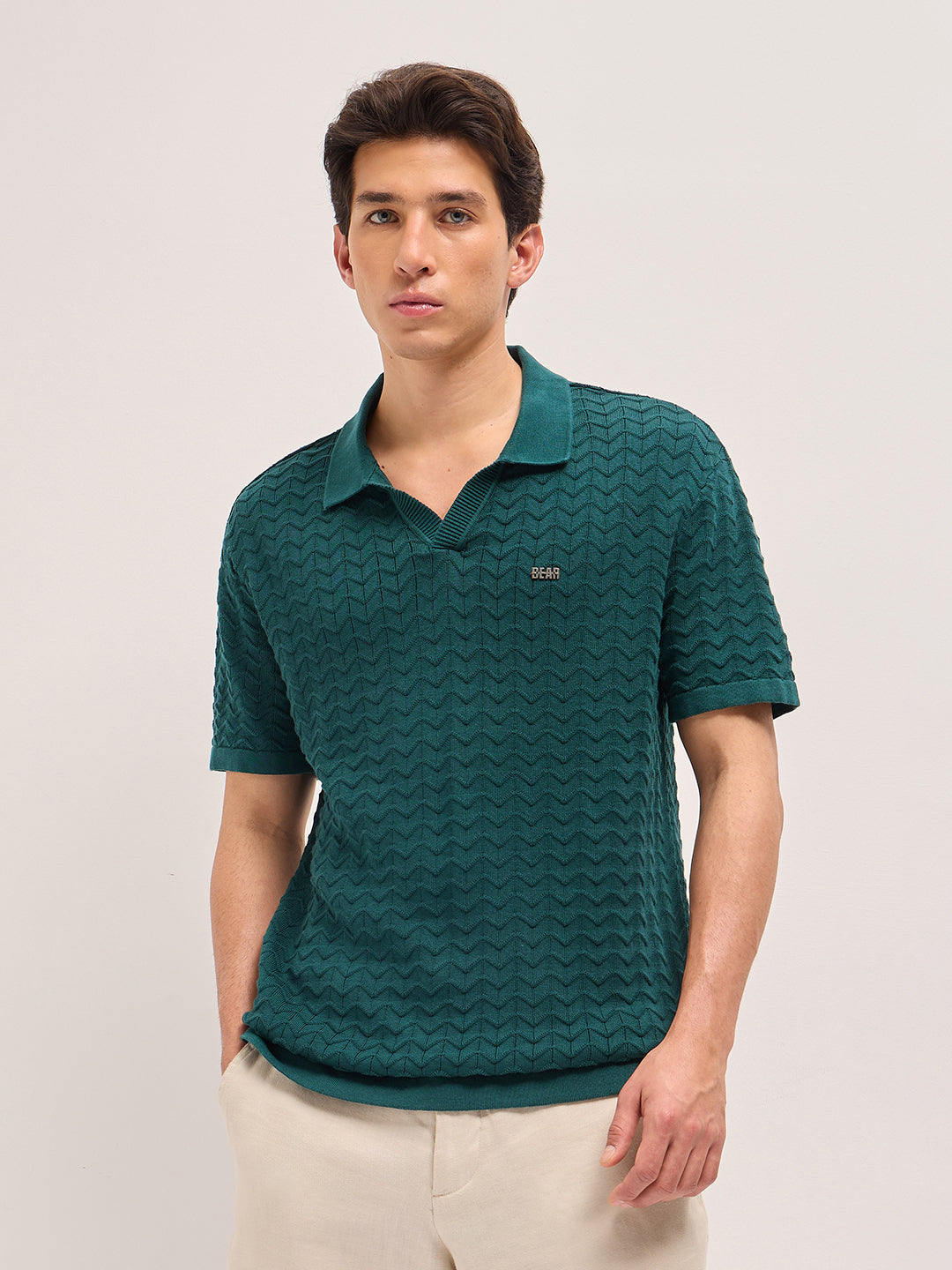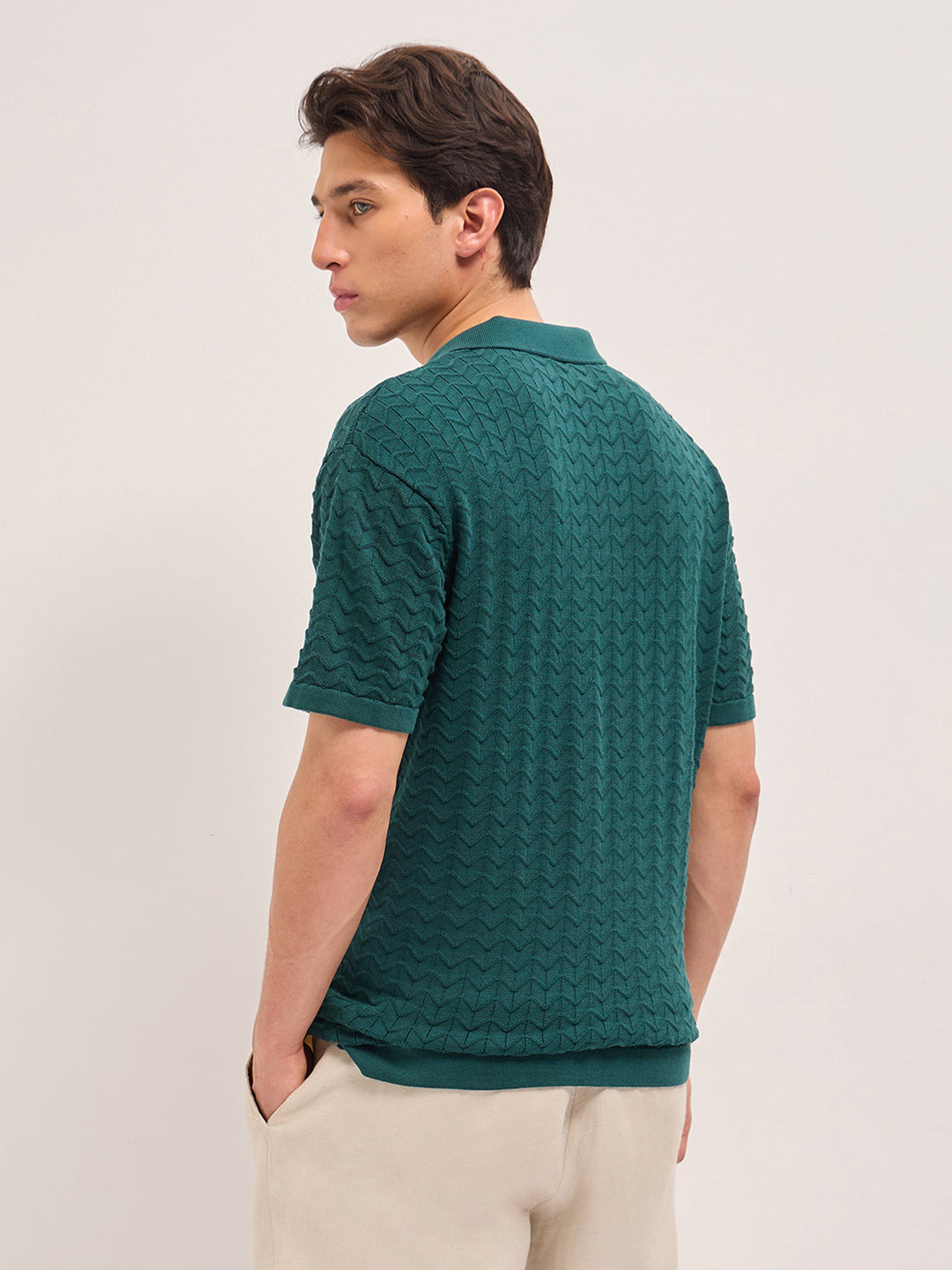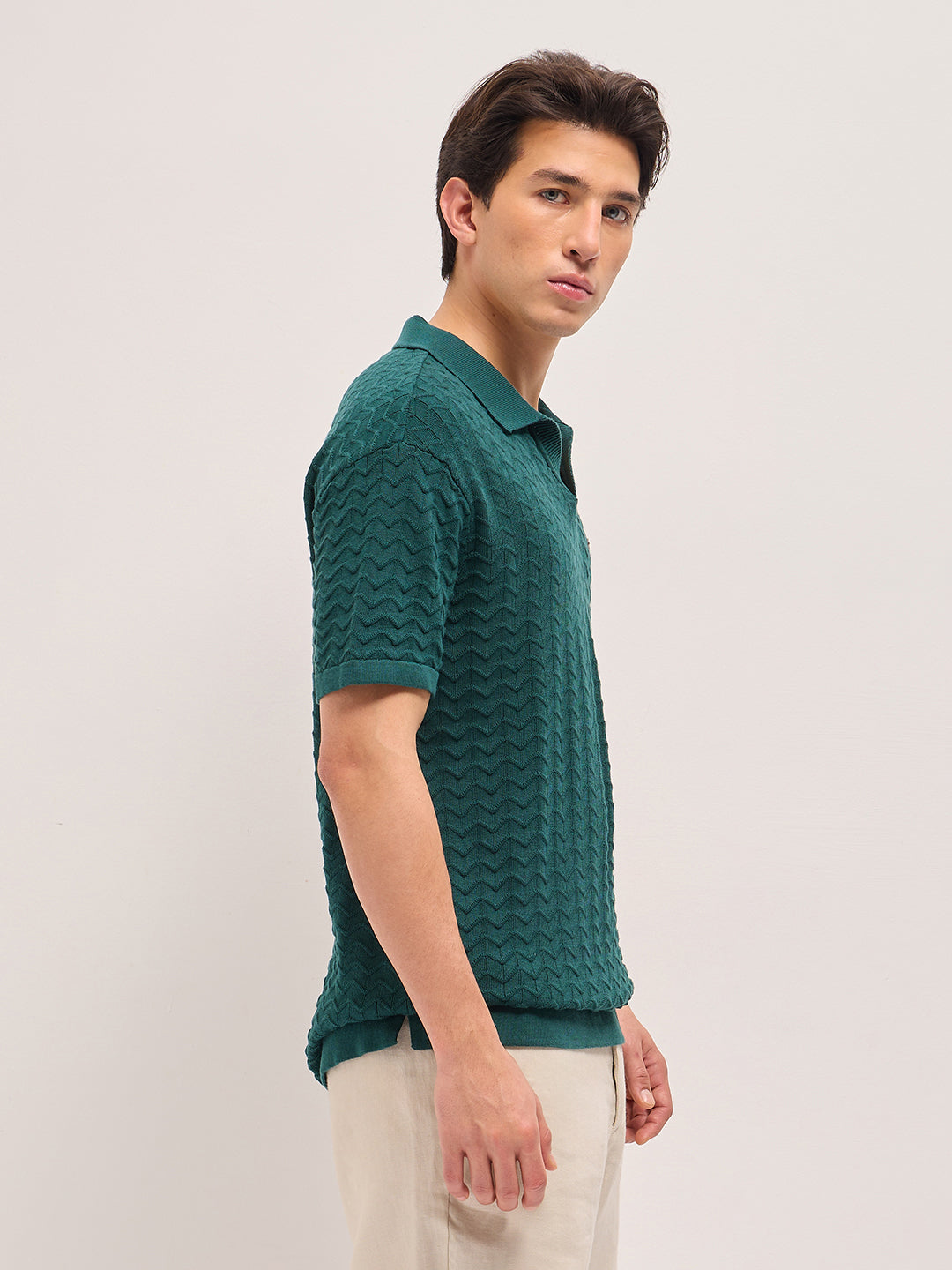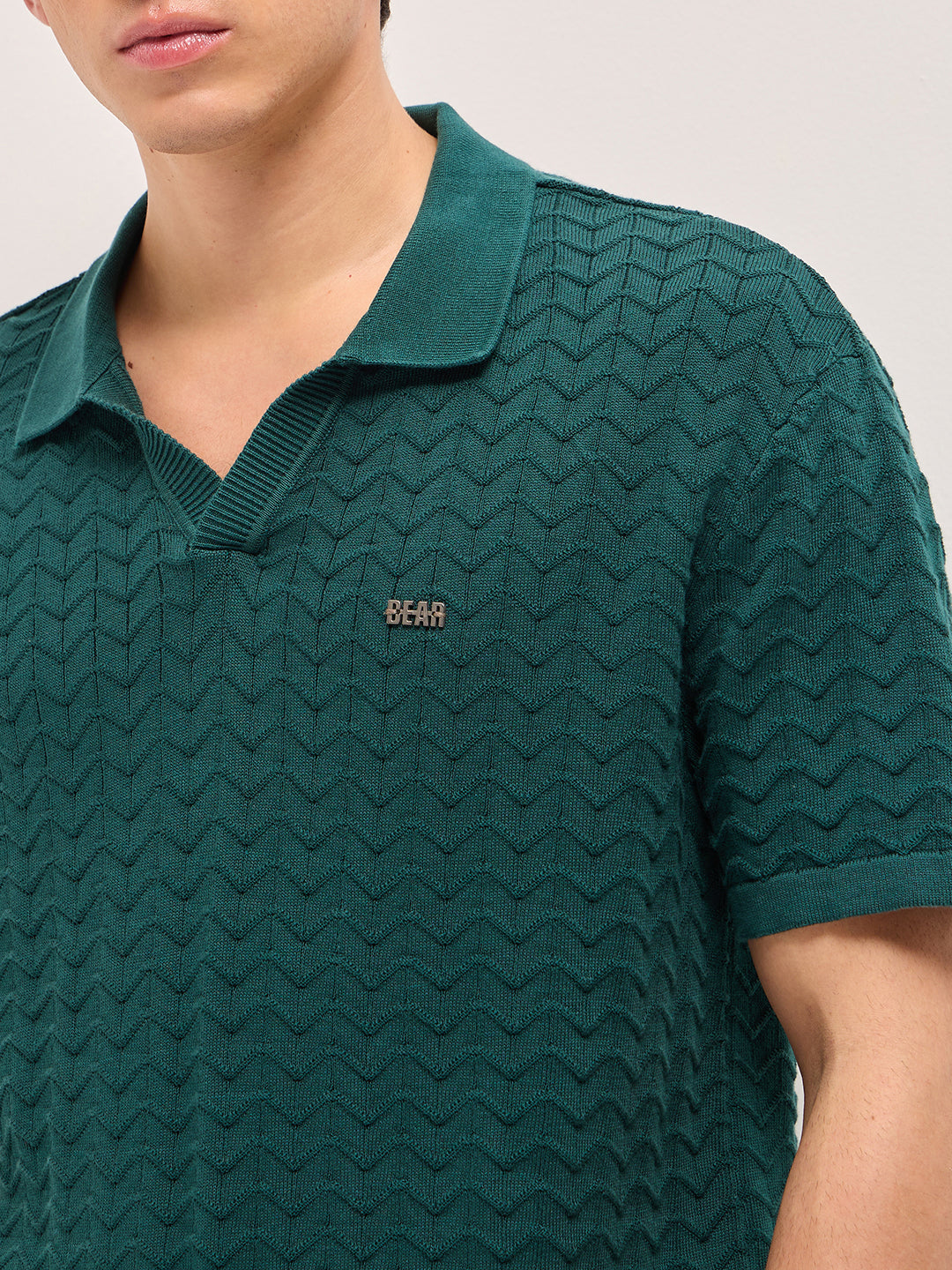 Shop Green Textured Chevron Knit Relaxed Fit Polo with Open V-Neck Placket Online.