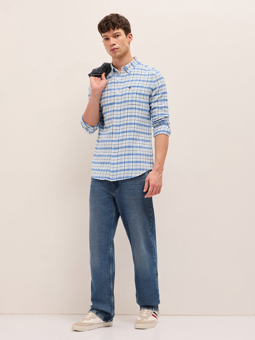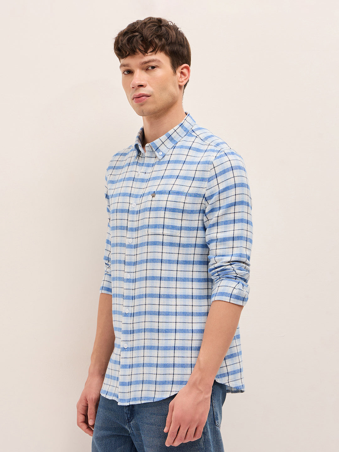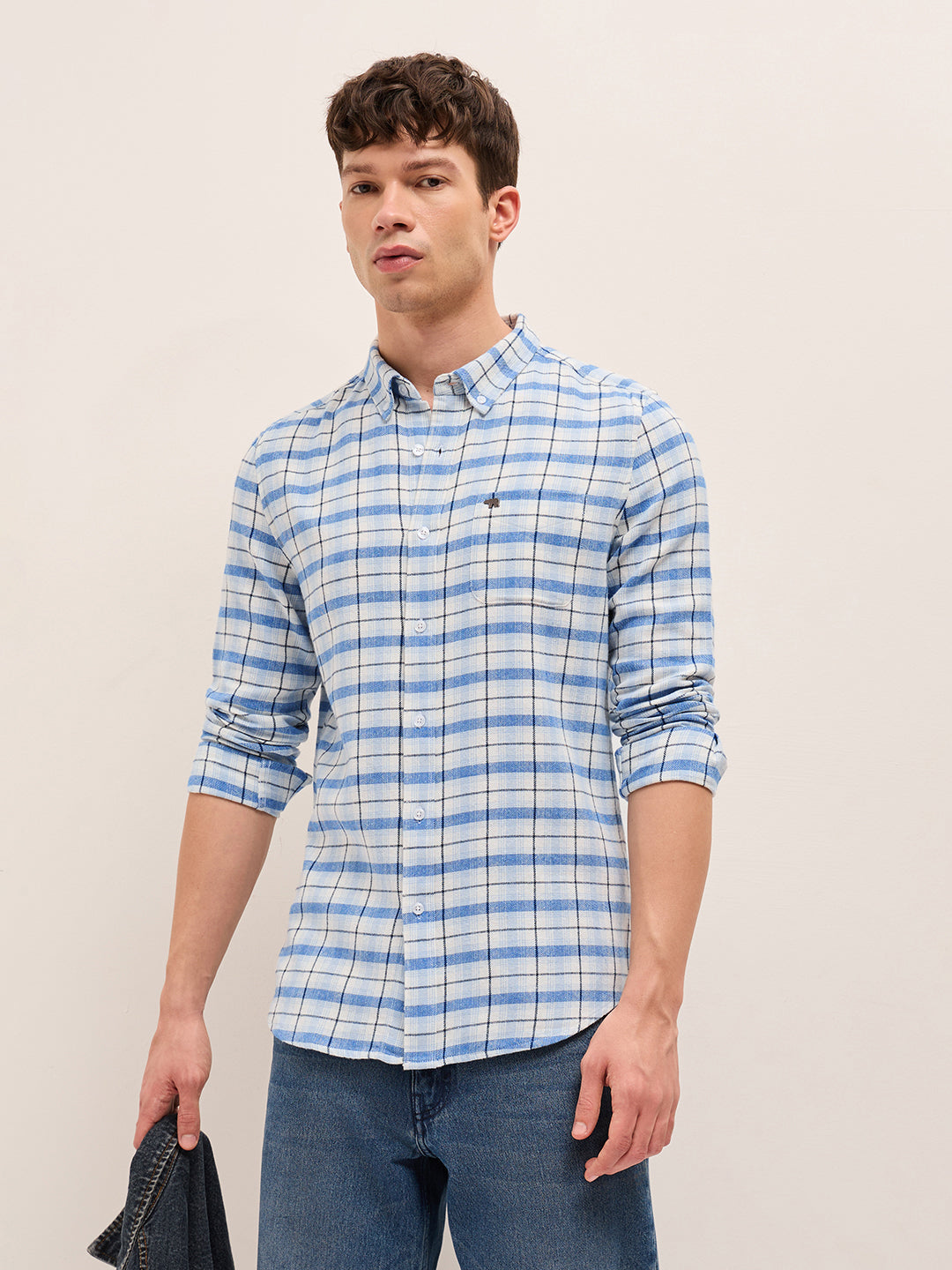Shop White & Blue Woven Check Slim Fit Casual Shirt Online.
