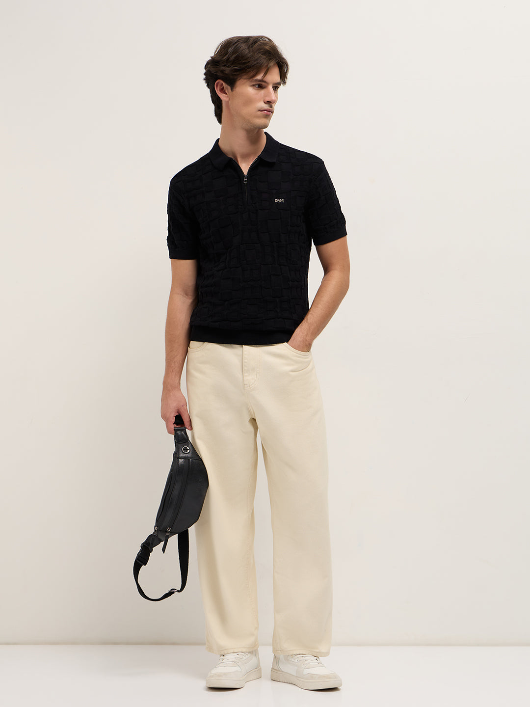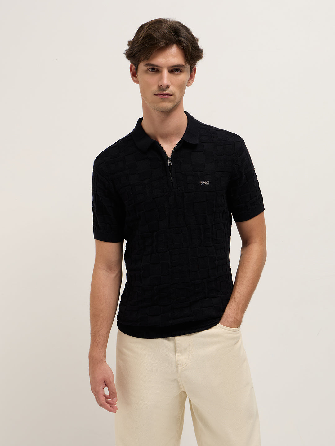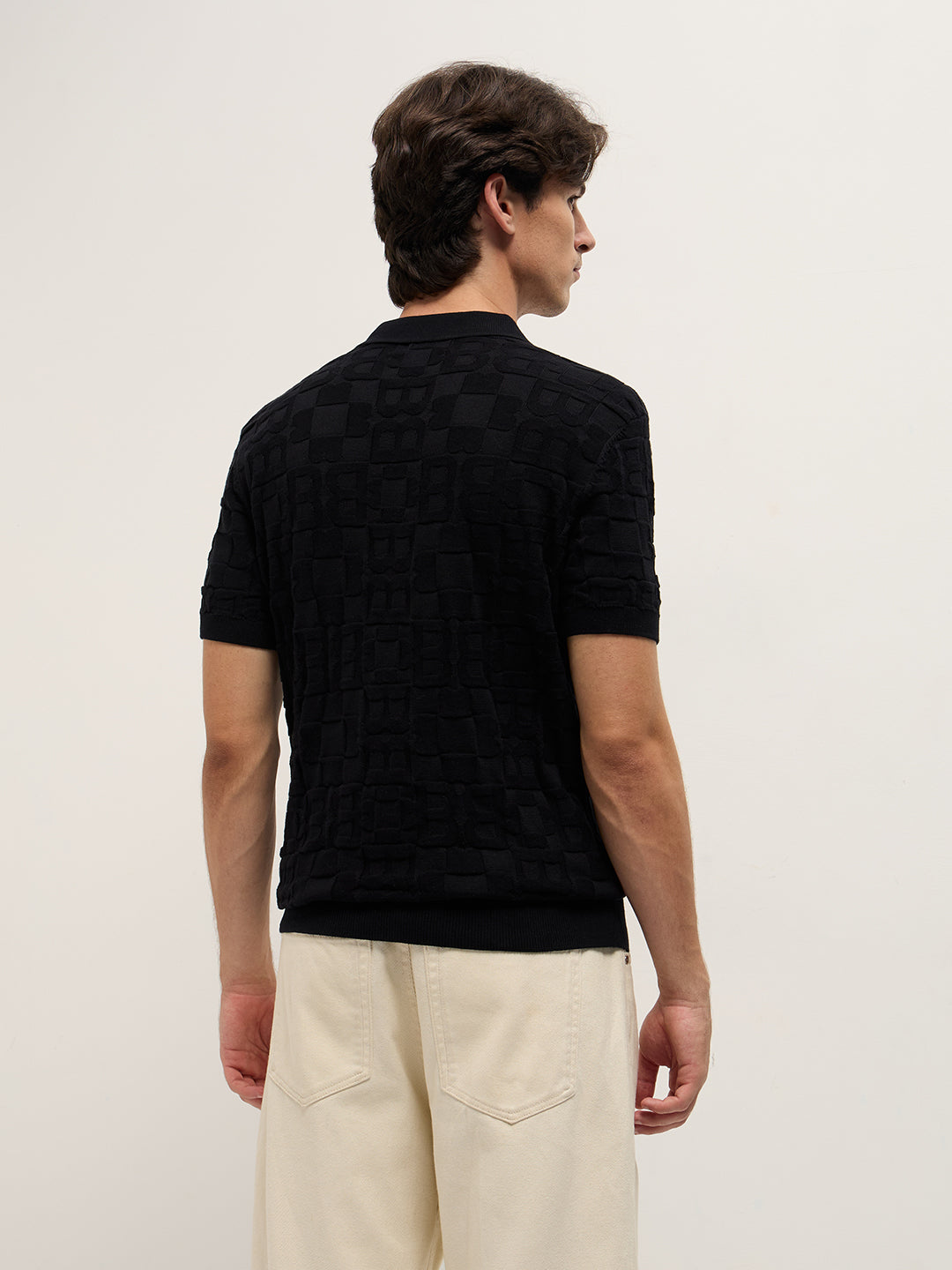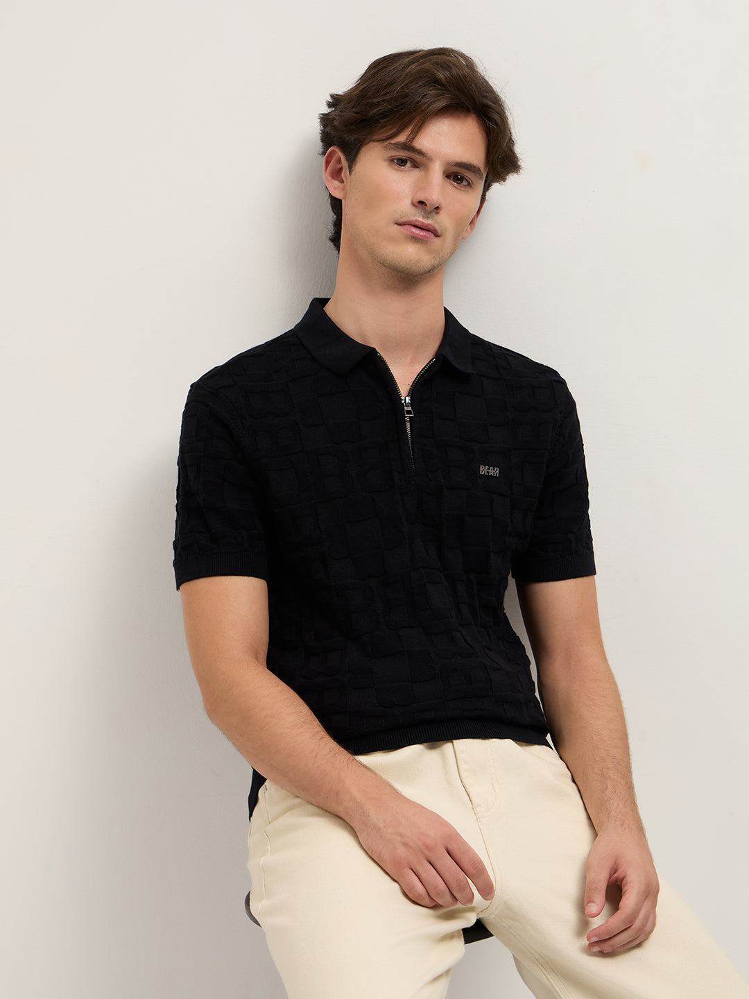 Black Slim-Fit Half-Zip Polo with “B” Monogram Self-Design