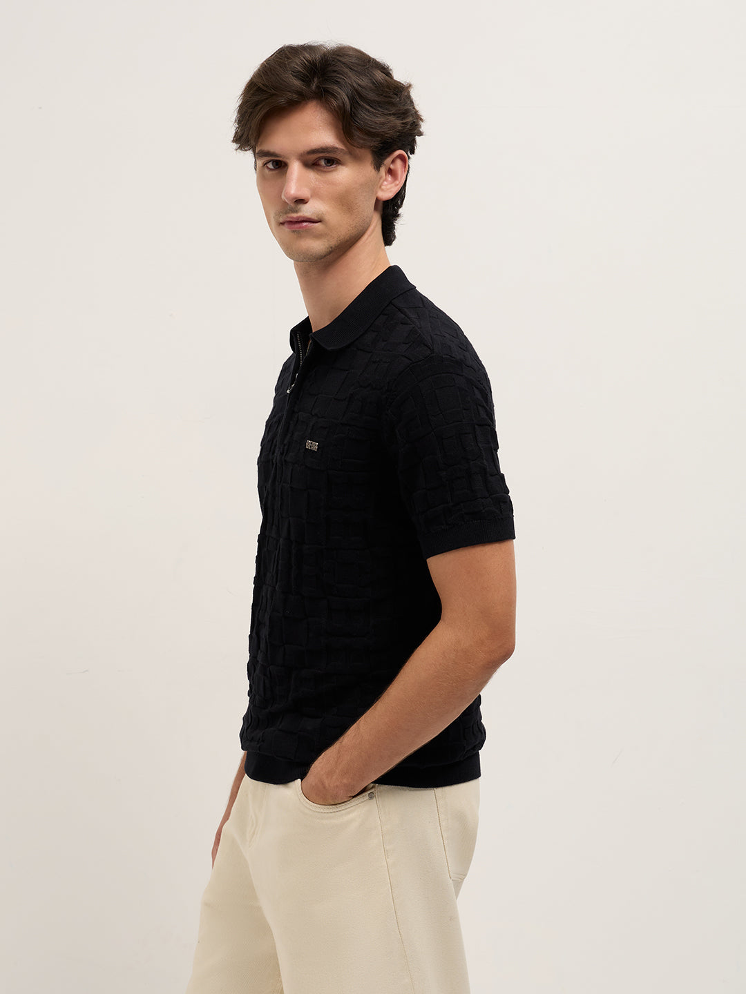 - Neck: Polo neck with a half-zip placket