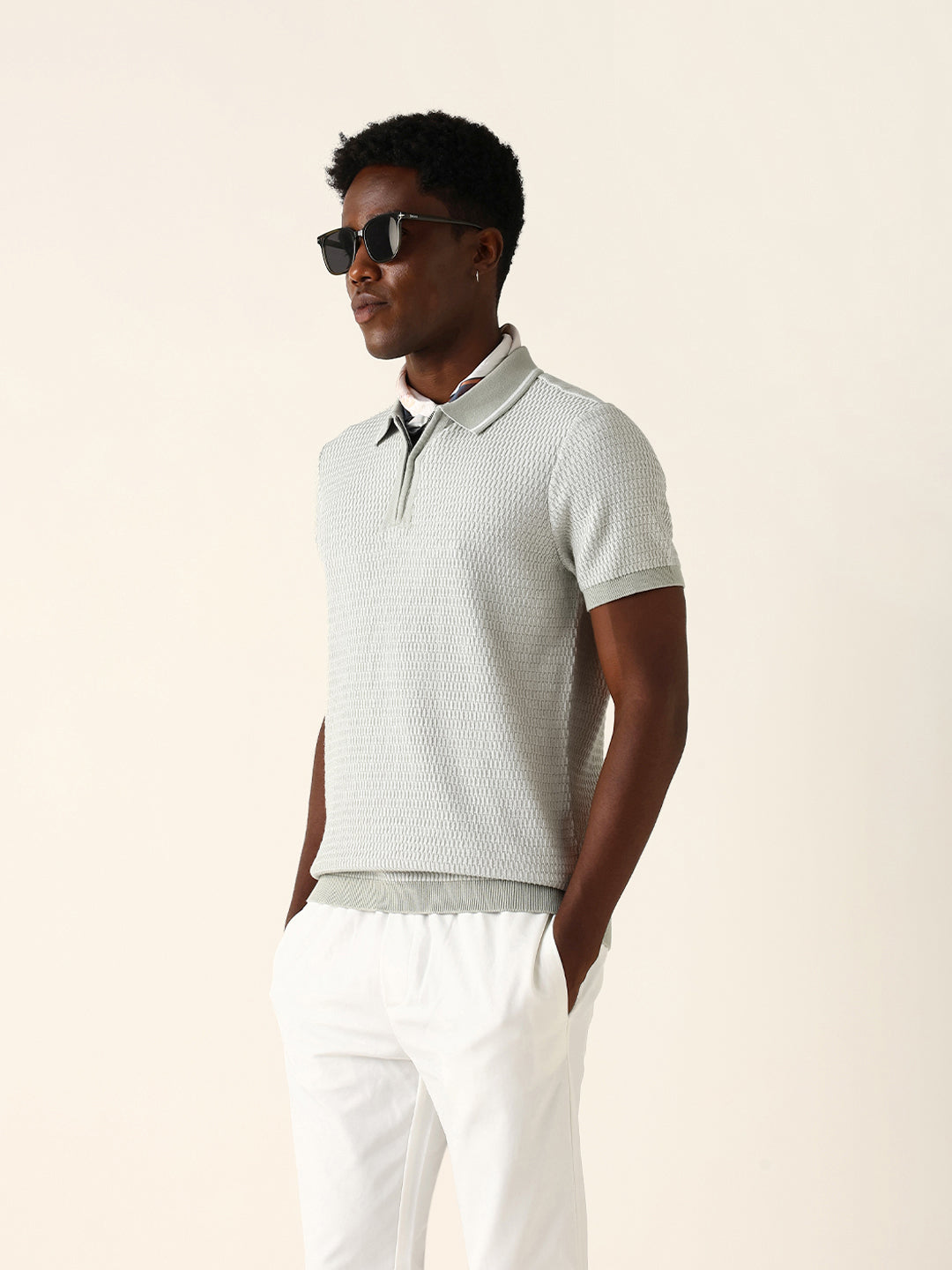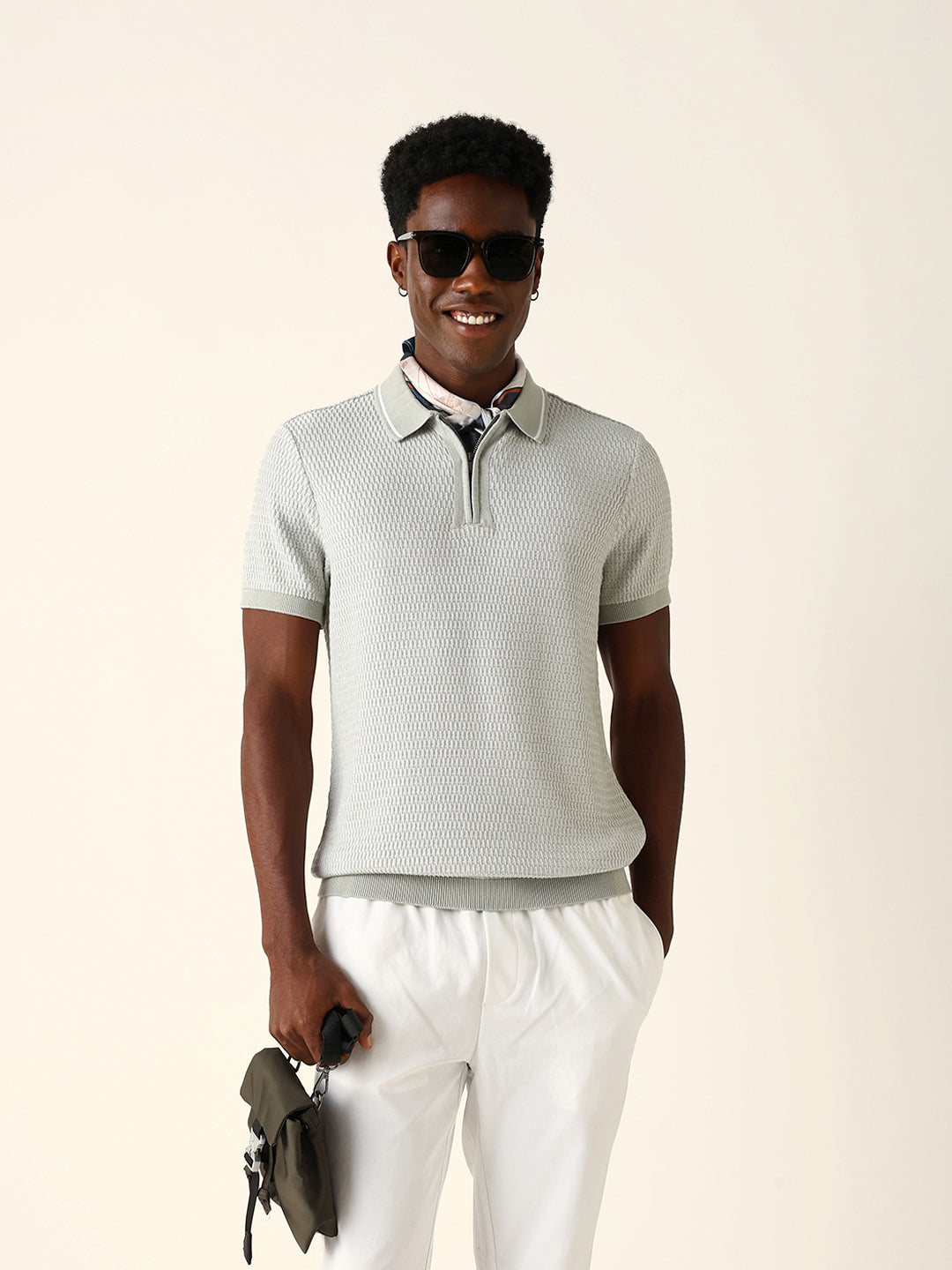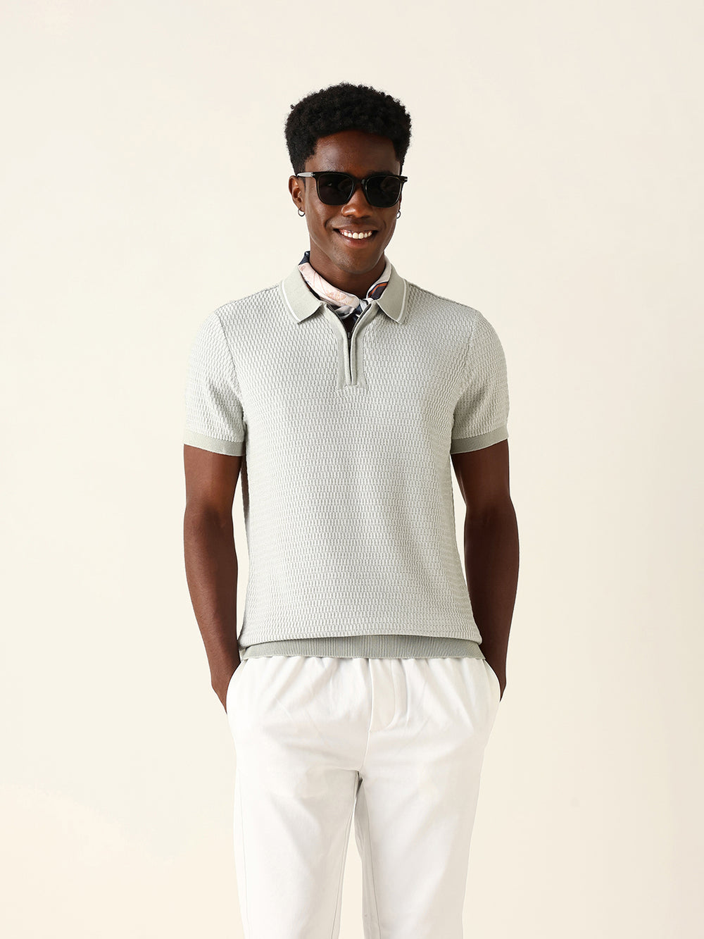 Grey Geometric Knit Regular Fit Polo with Zip Placket & Solid Collar