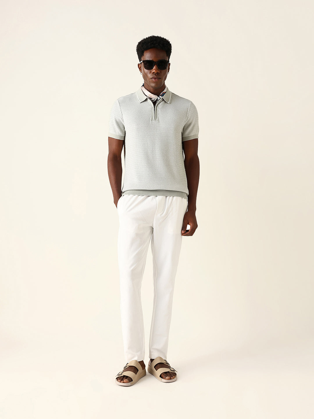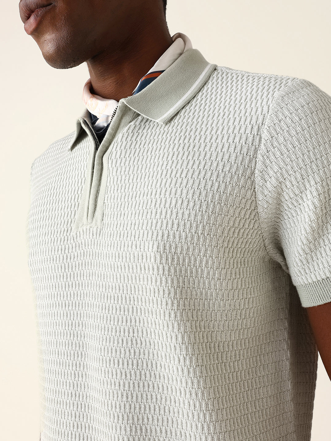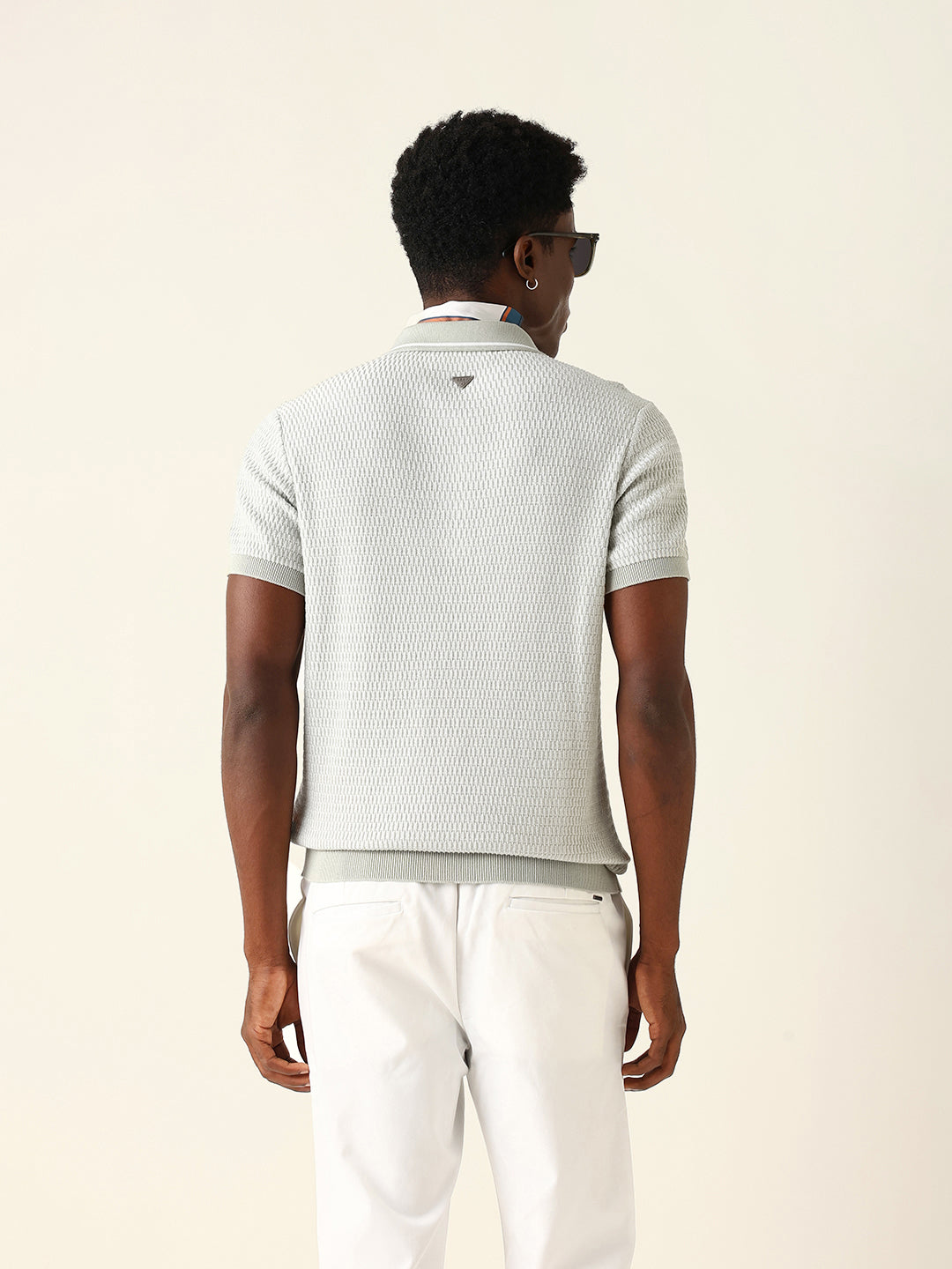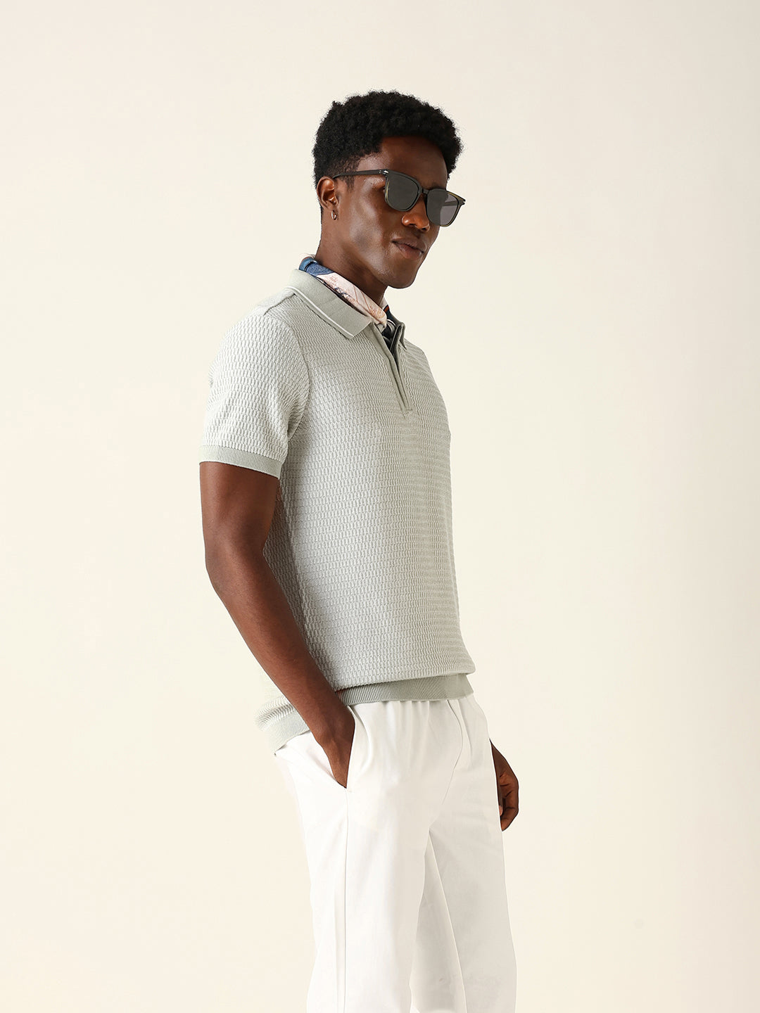 Grey Geometric Knit Regular Fit Polo with Zip Placket & Solid Collar