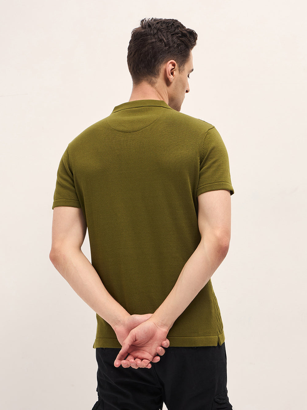 - Collar: Polo collar with a sleek V-notch detail