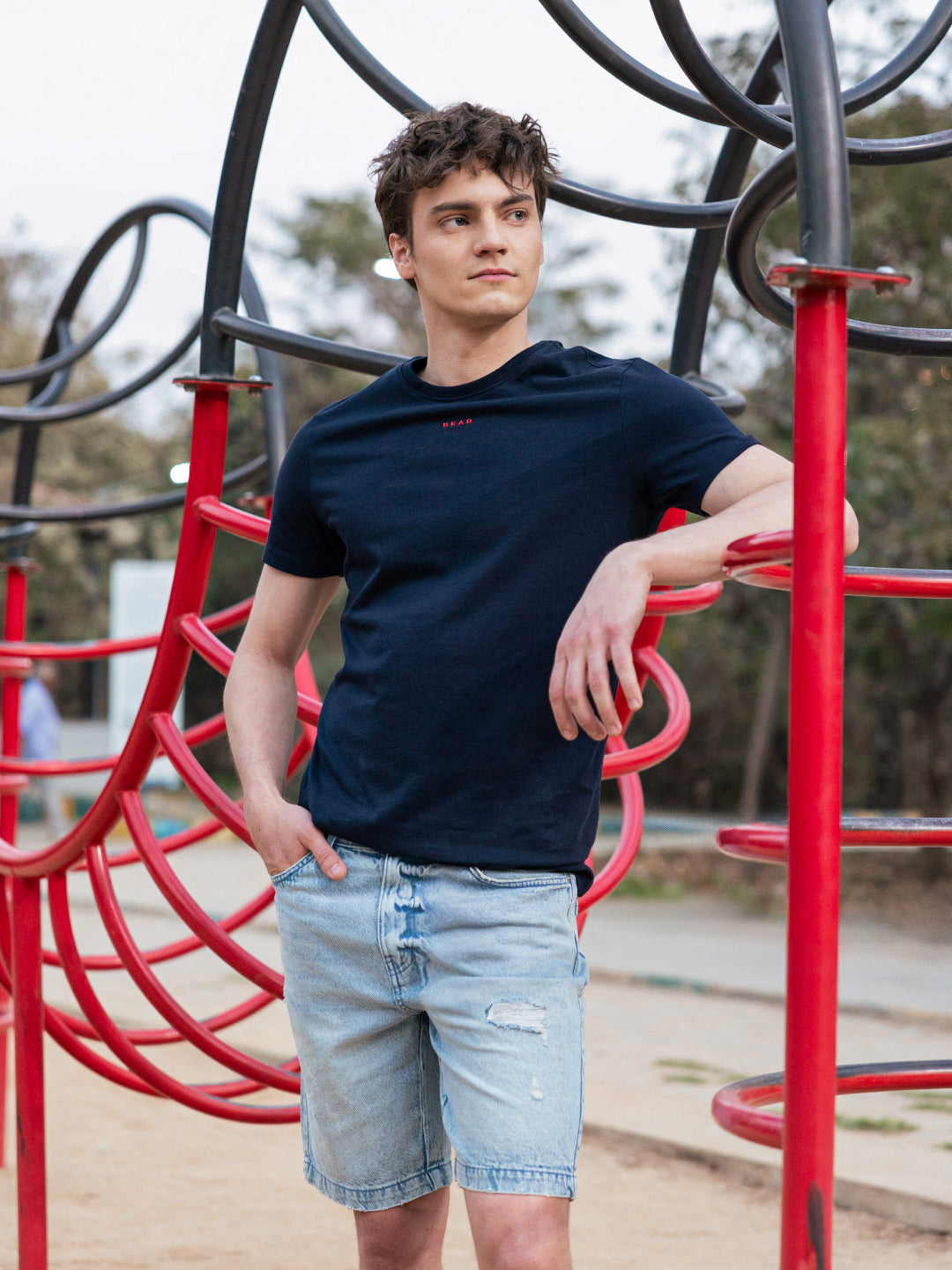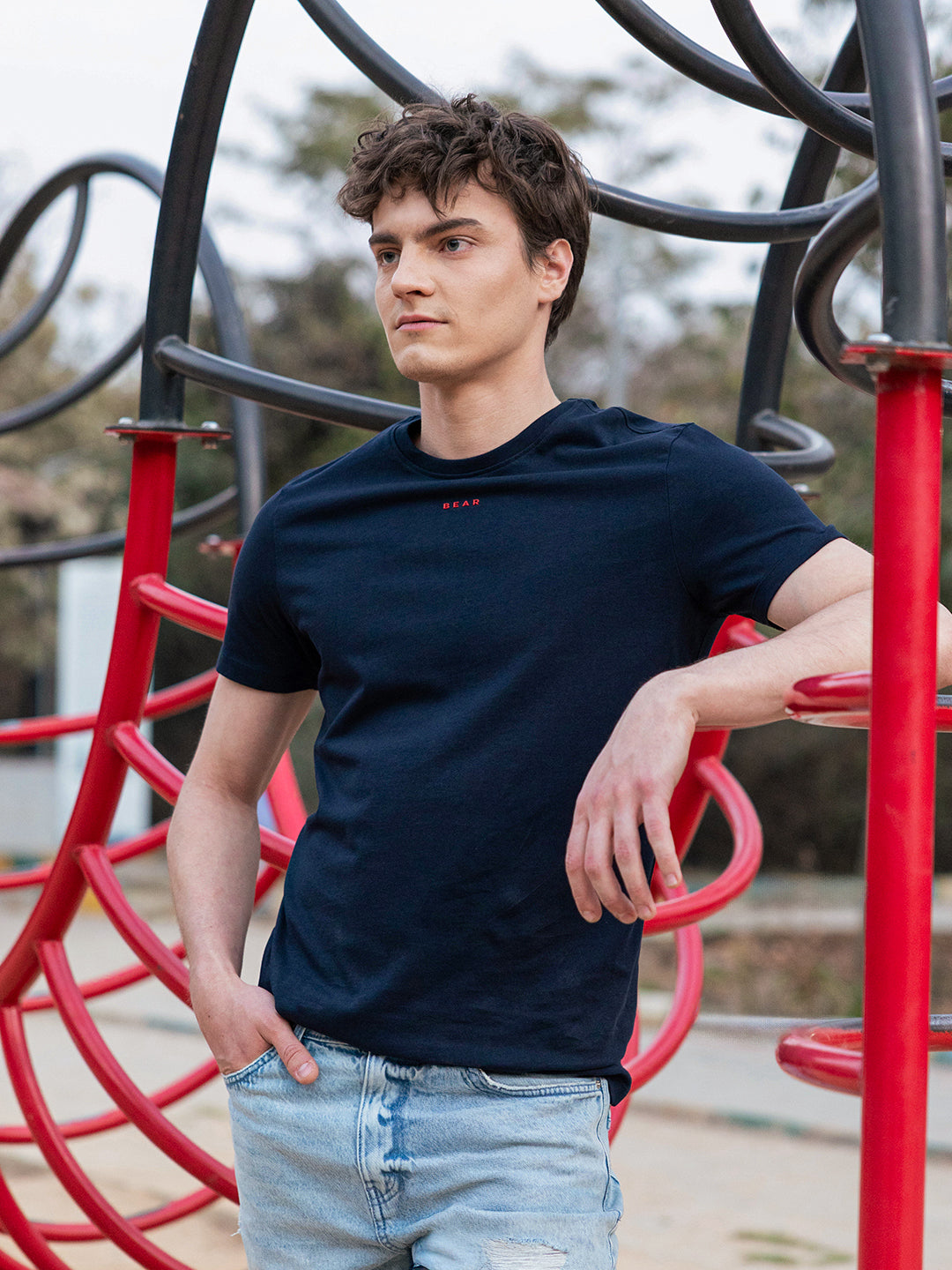 Navy Solid Crew Neck T-Shirt with “BEAR” Logo