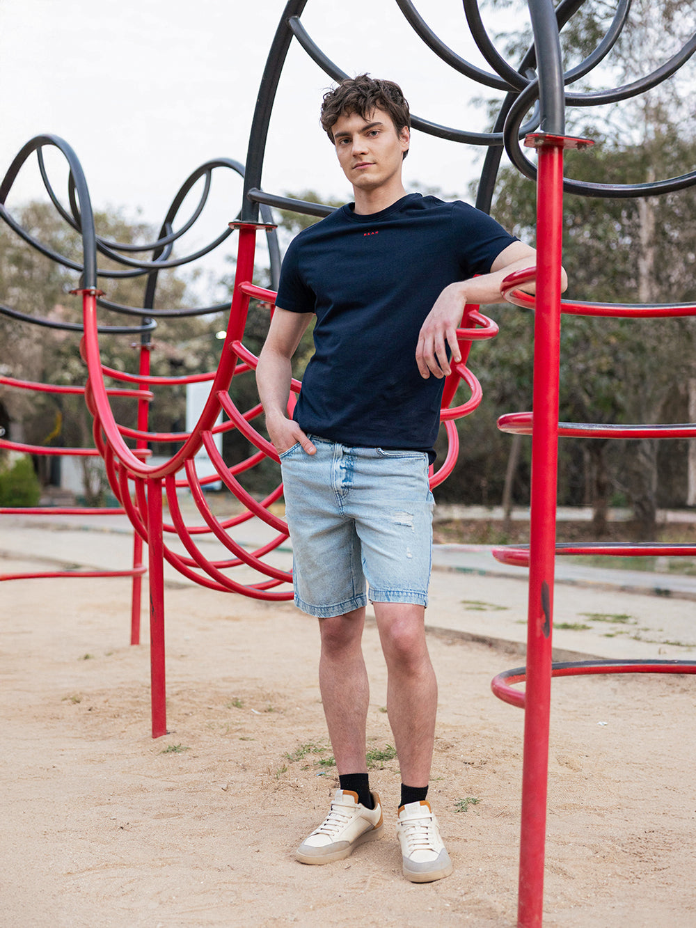 Shop Navy Solid Crew Neck T-Shirt with “BEAR” Logo Online