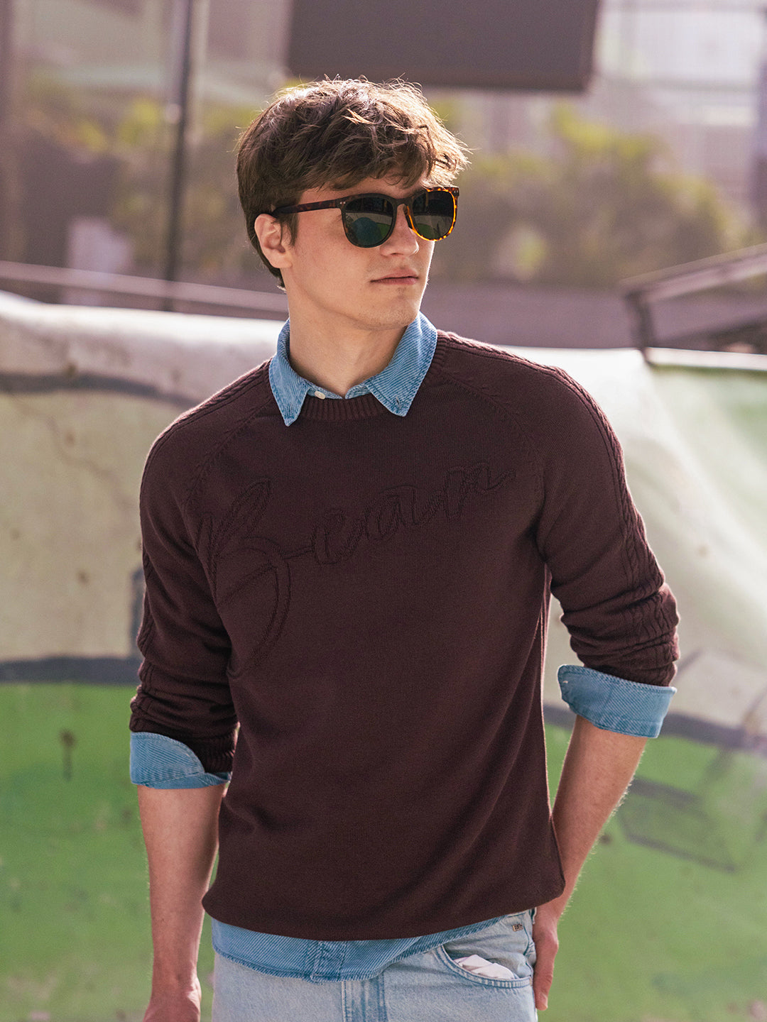Shop Brown Relaxed Fit Textured Knit ‘Bear’ Raglan Full Sleeve Crew Neck T-Shirt Online