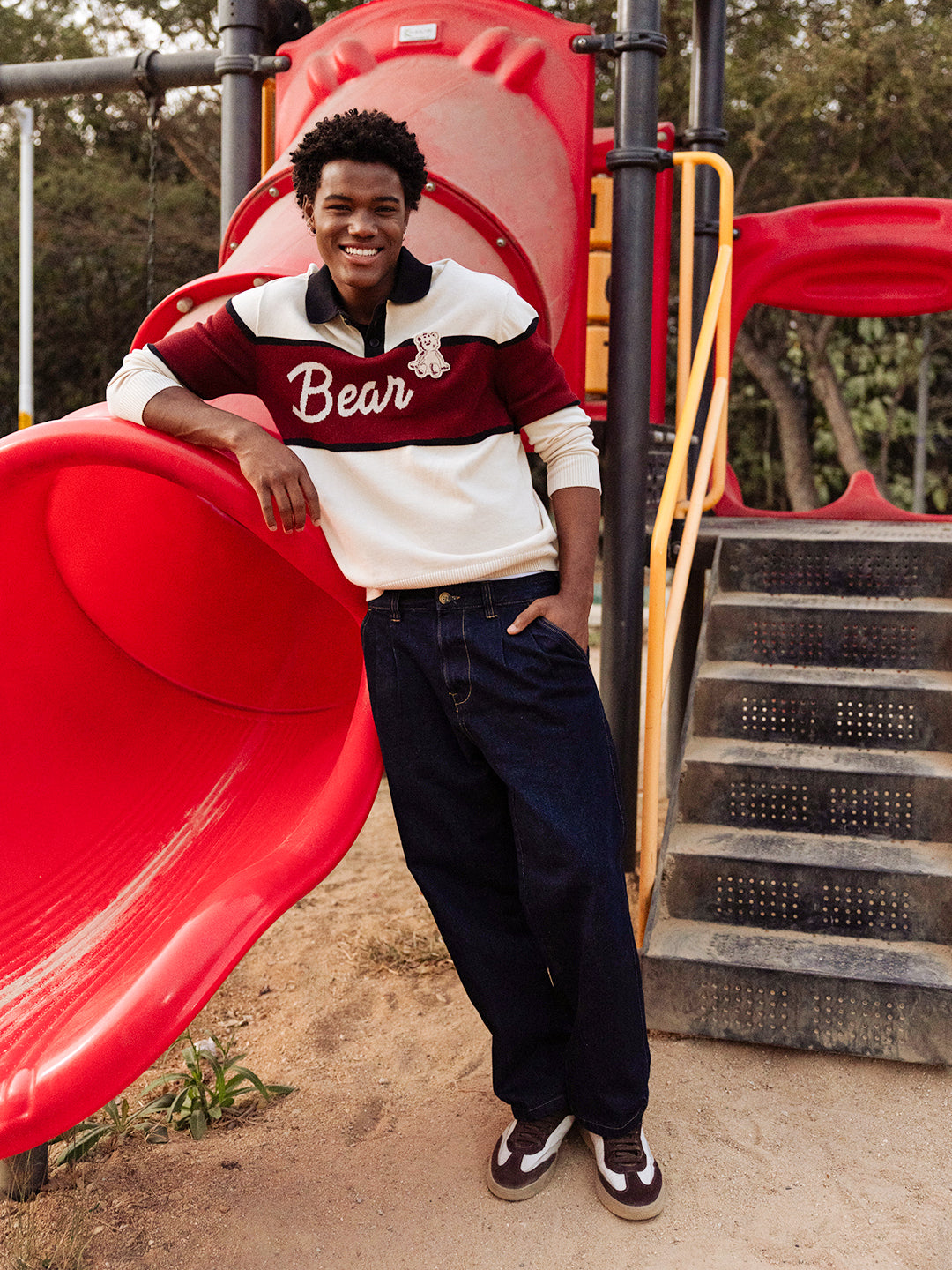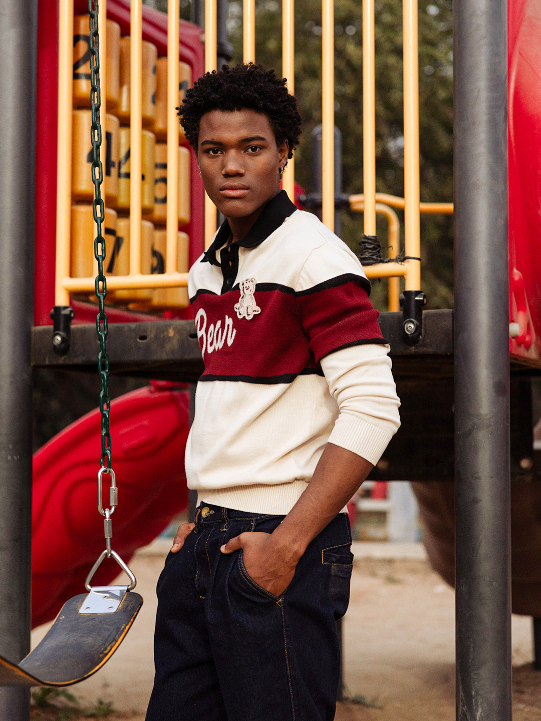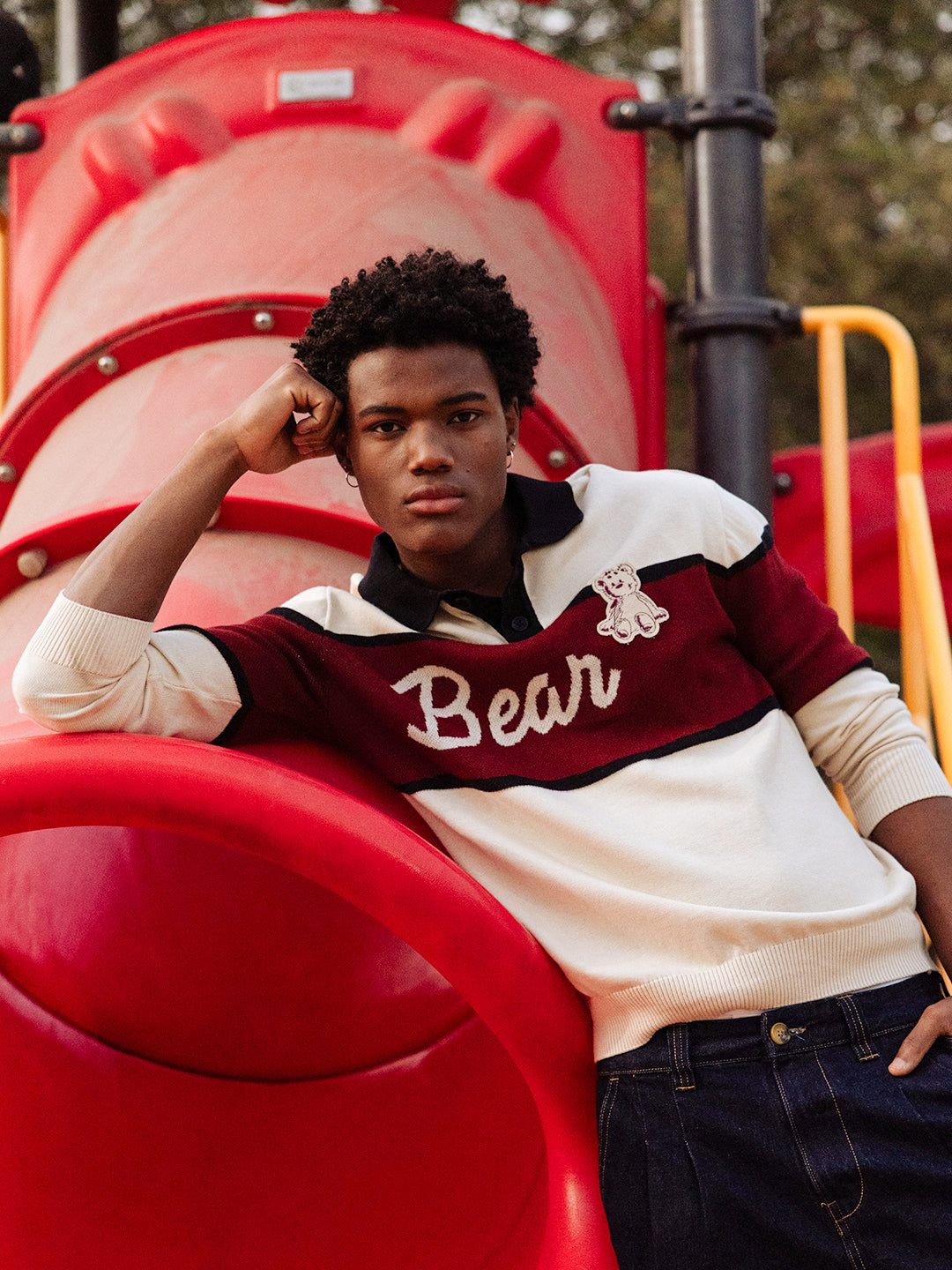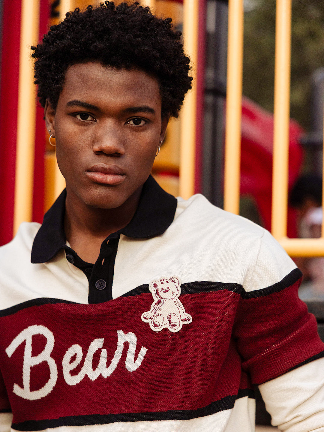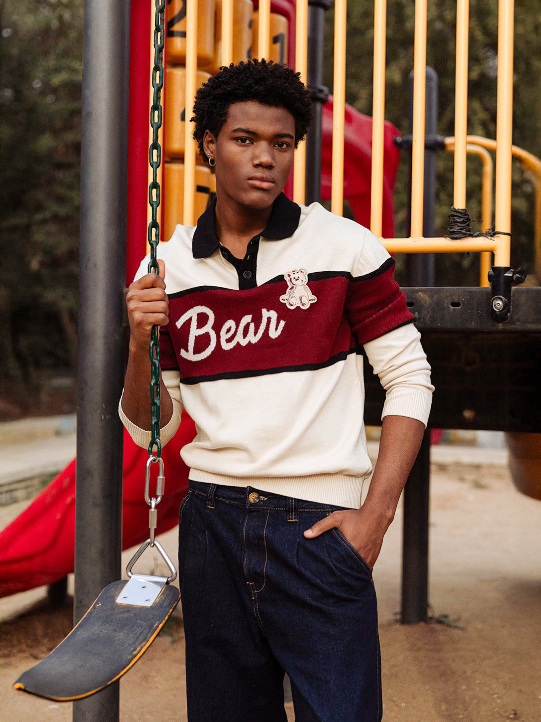 - Branding: “Bear” text knit-in detail with embroidered bear patch on the chest