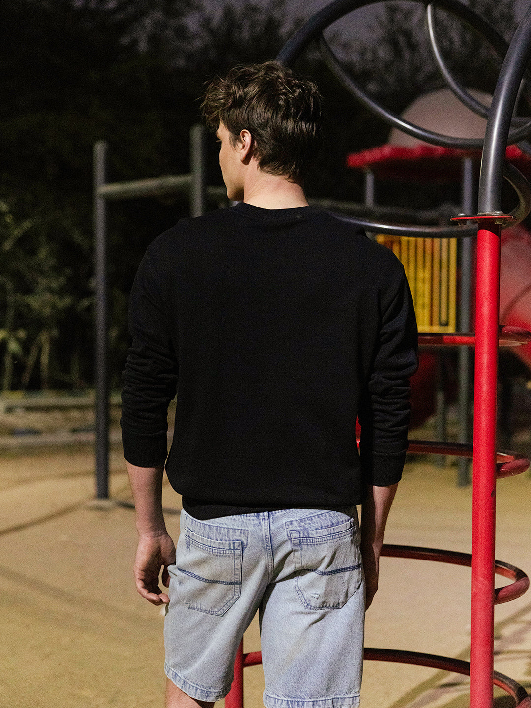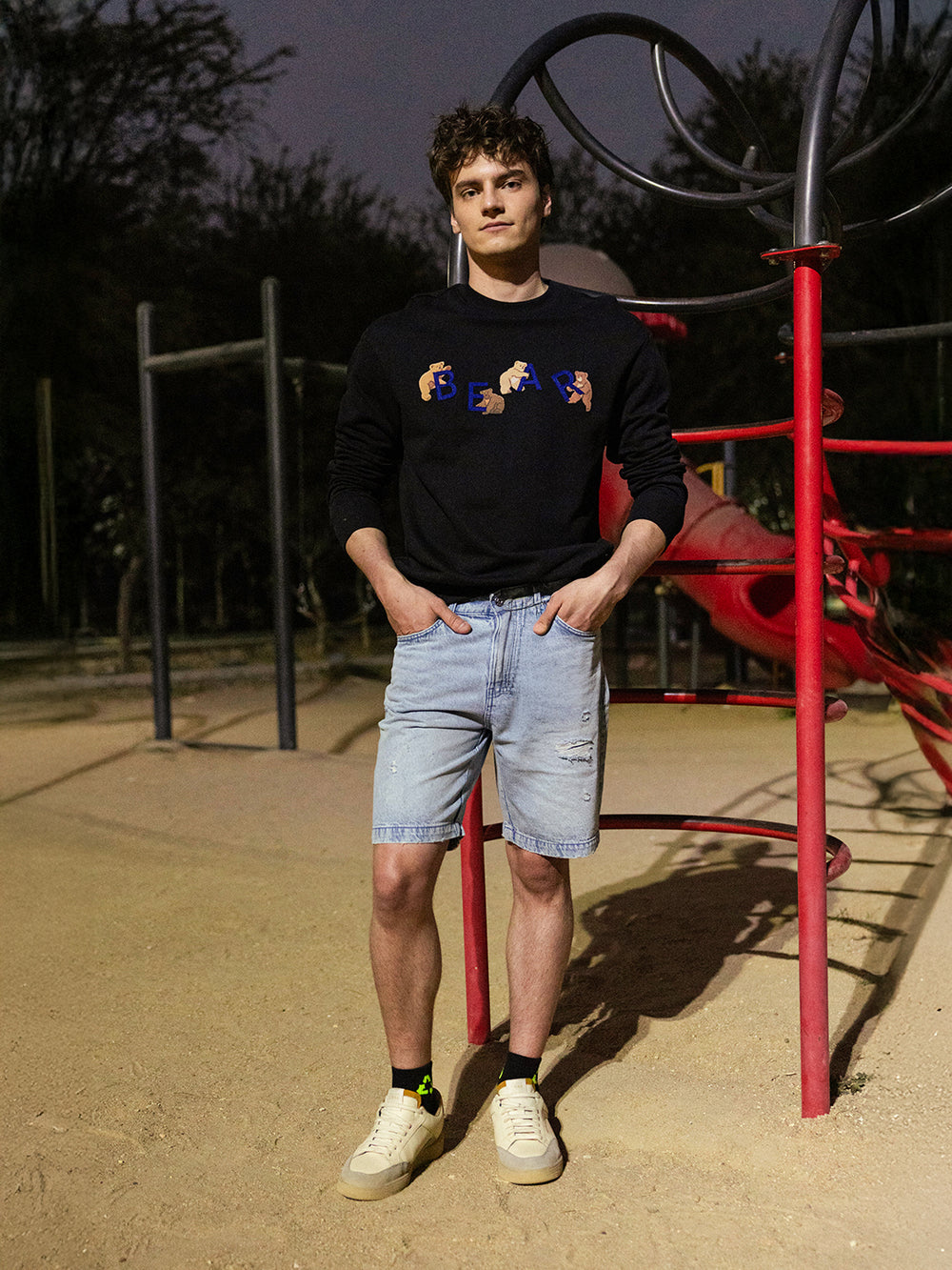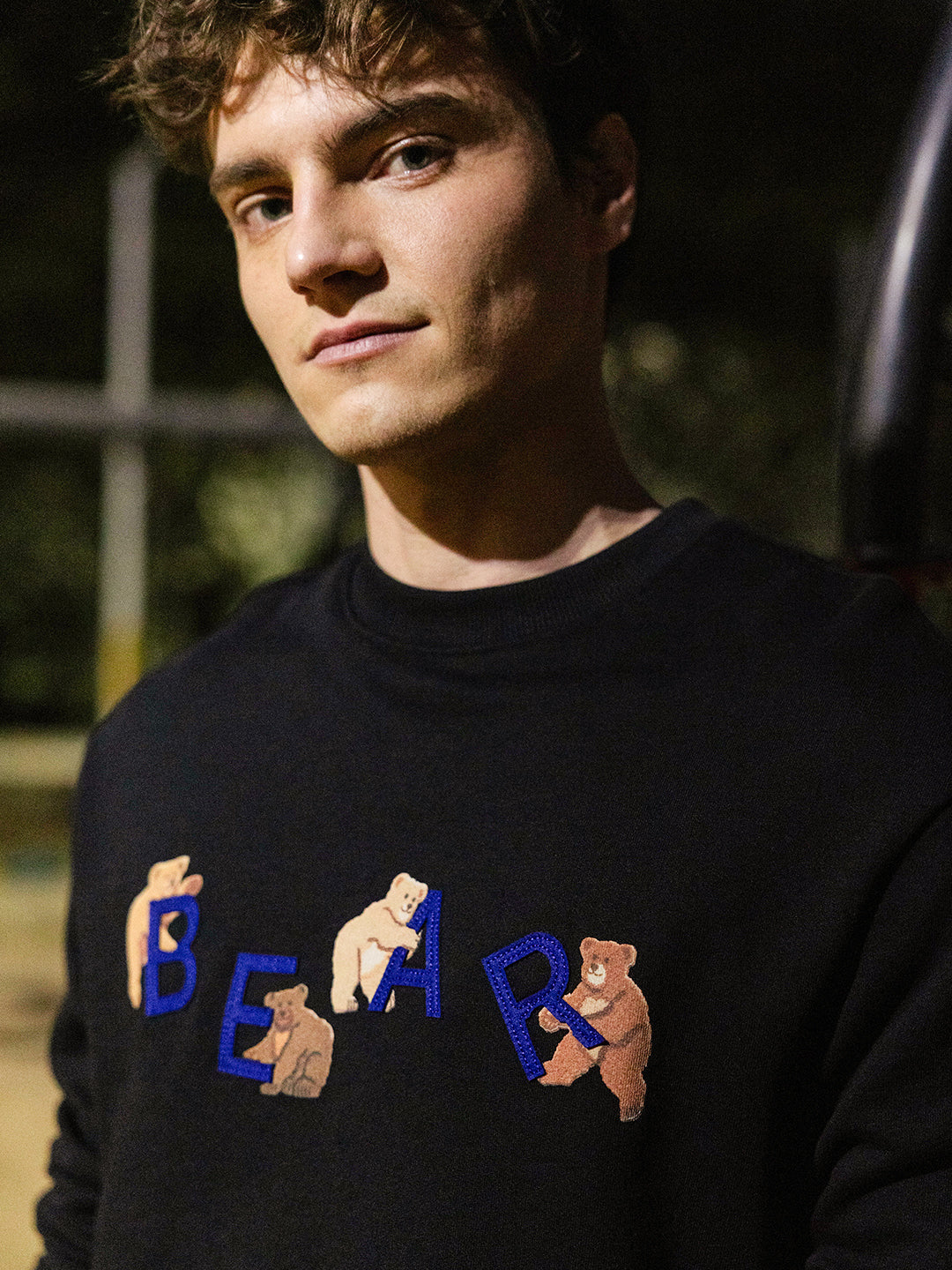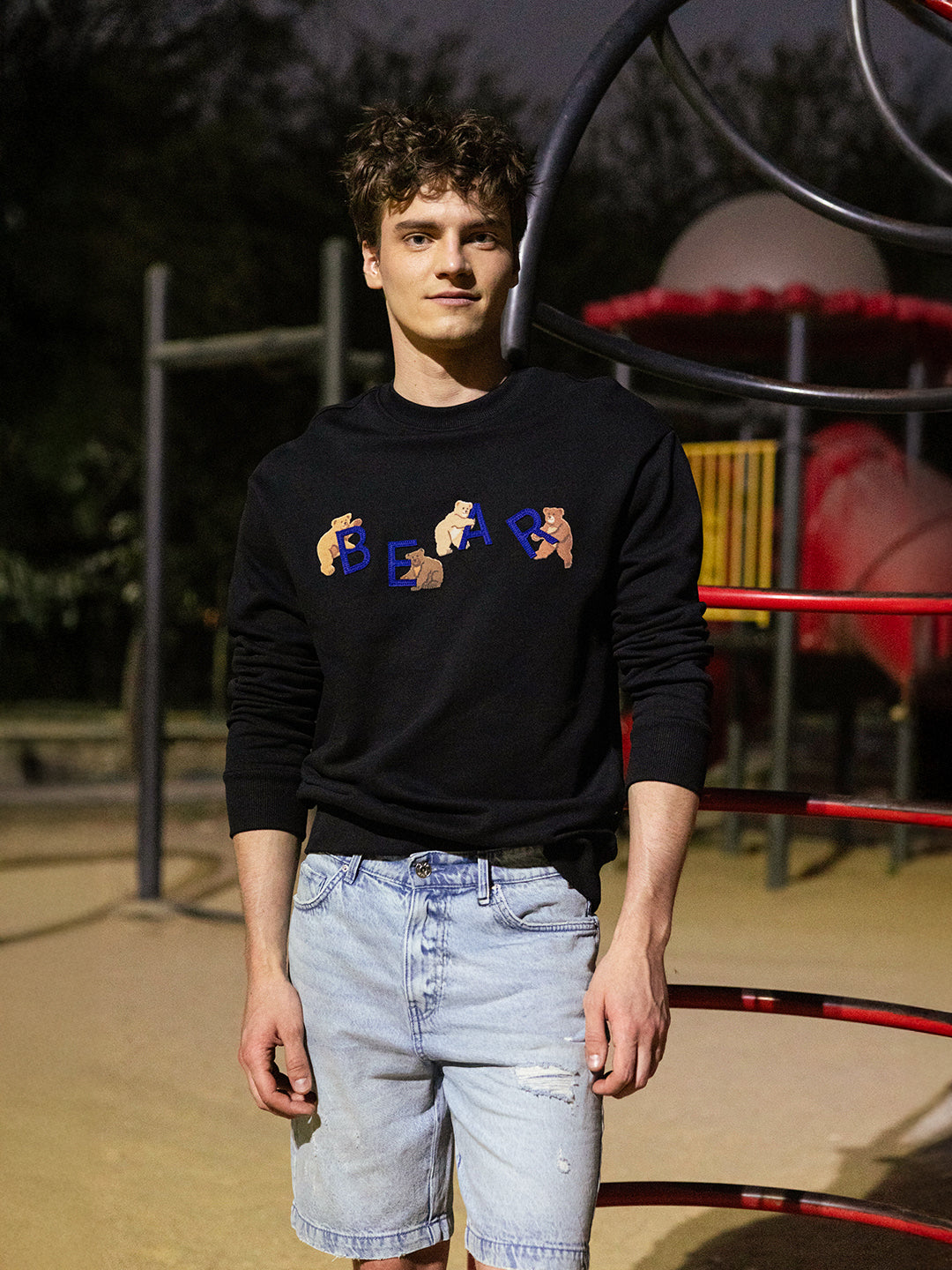Shop Black Relaxed Fit Crew Neck Sweatshirt with BEAR Letter Applique Online