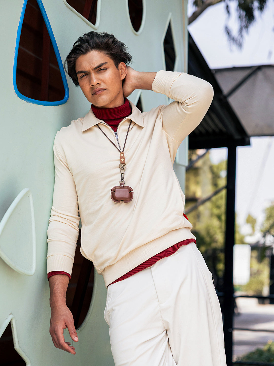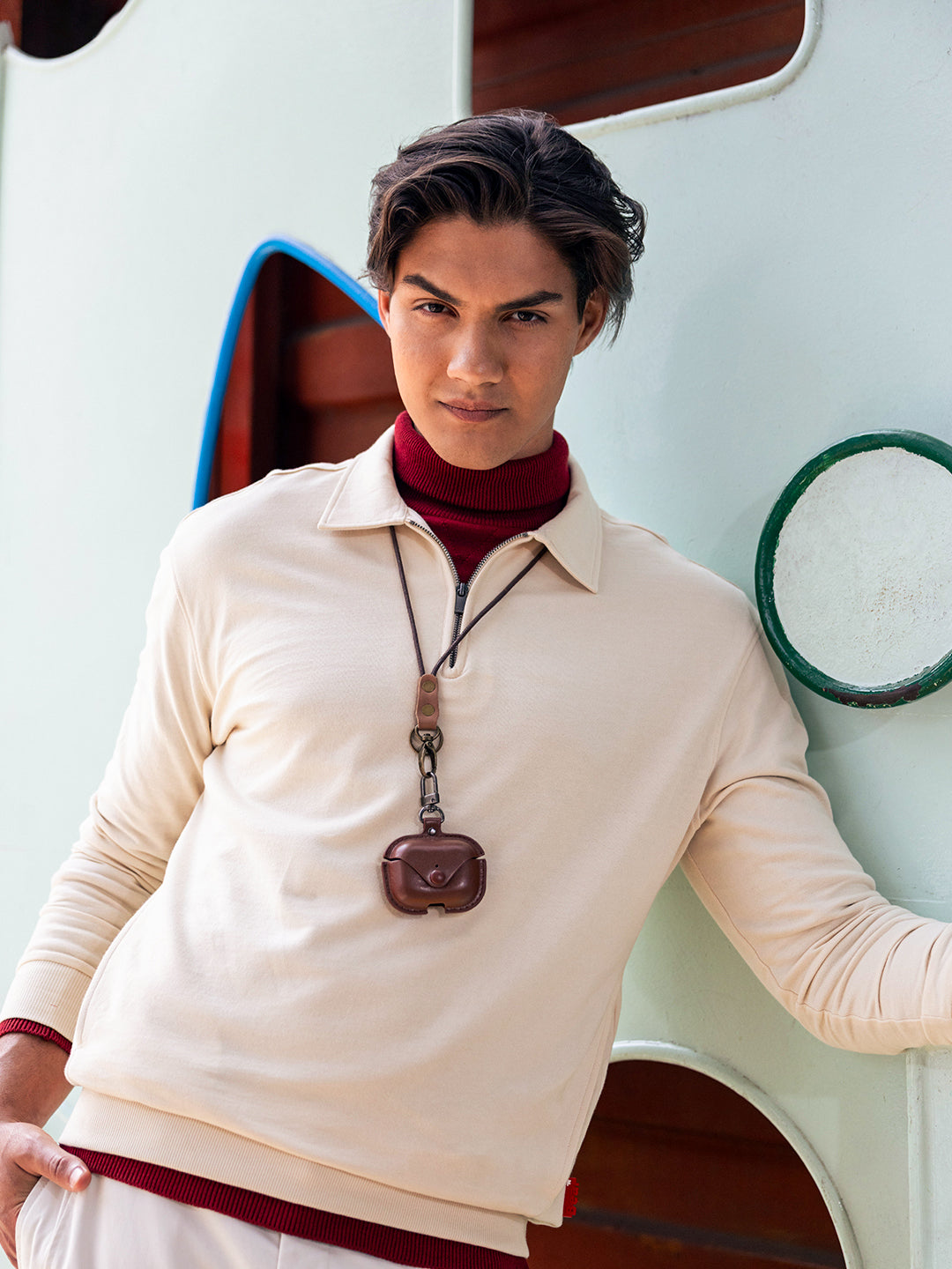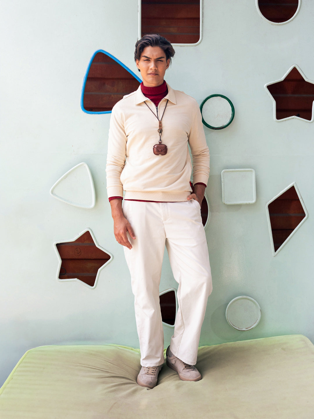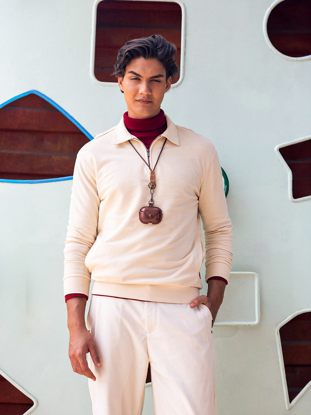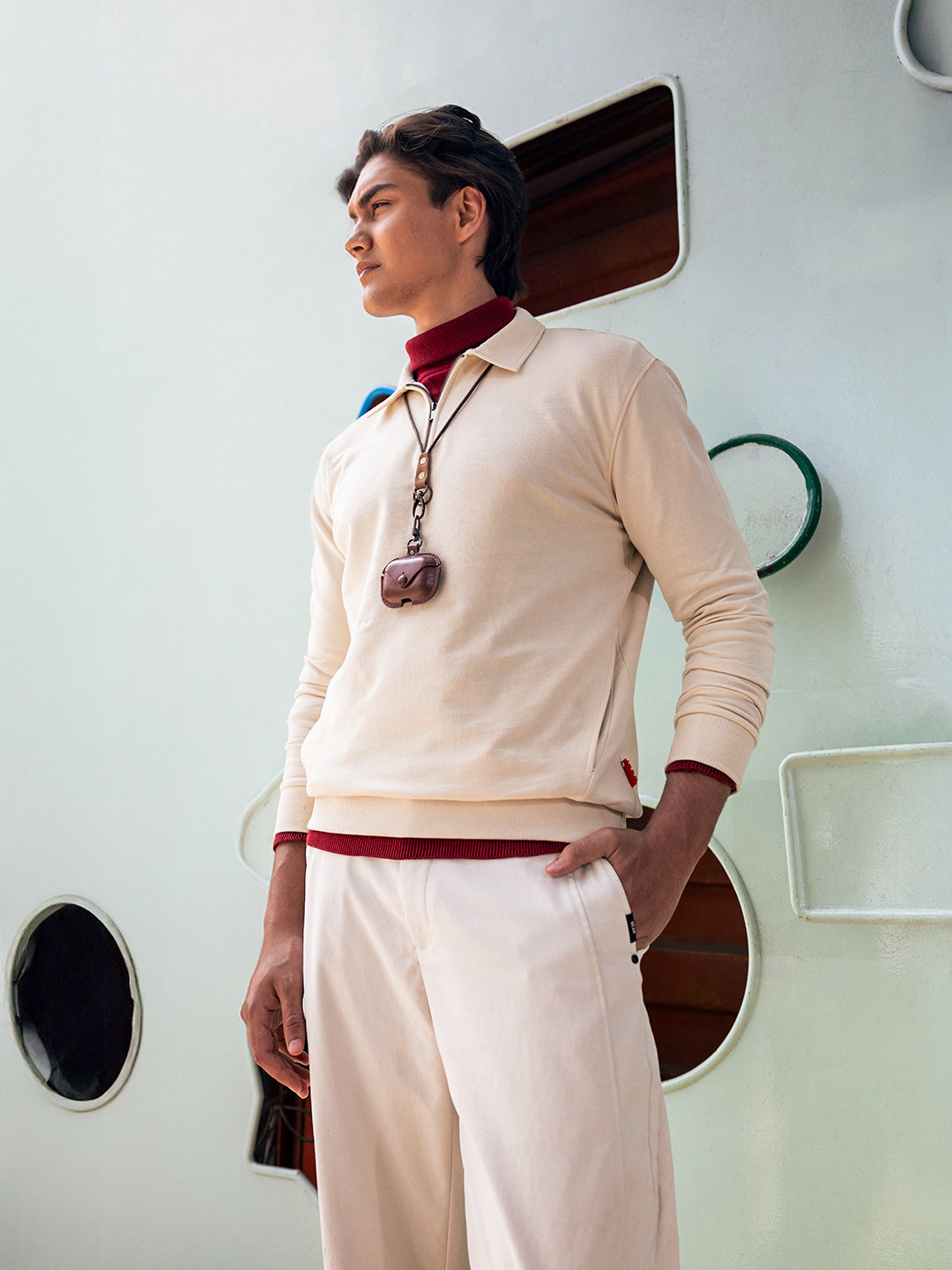 - Neck: Polo neck with a half-zip placket