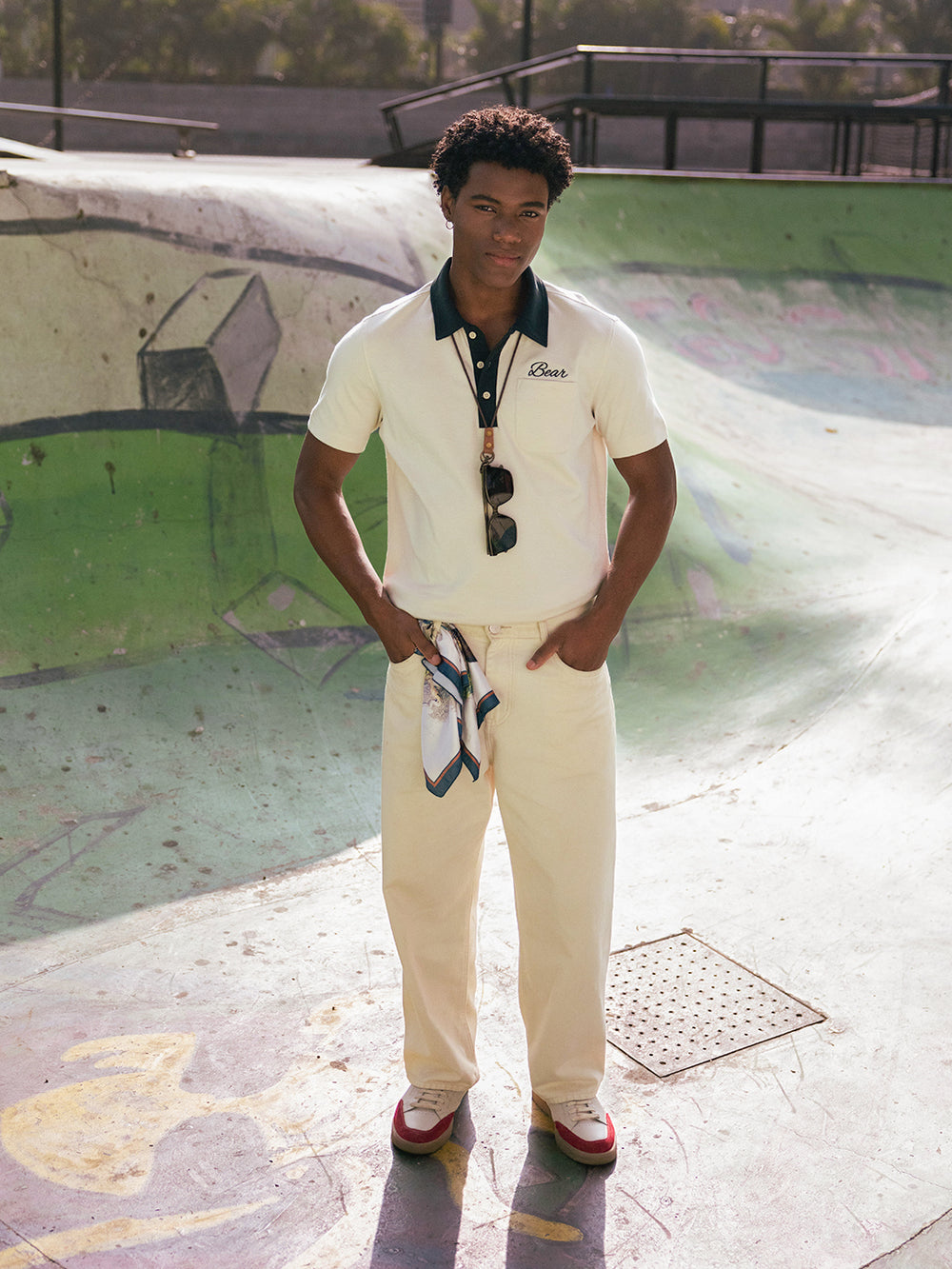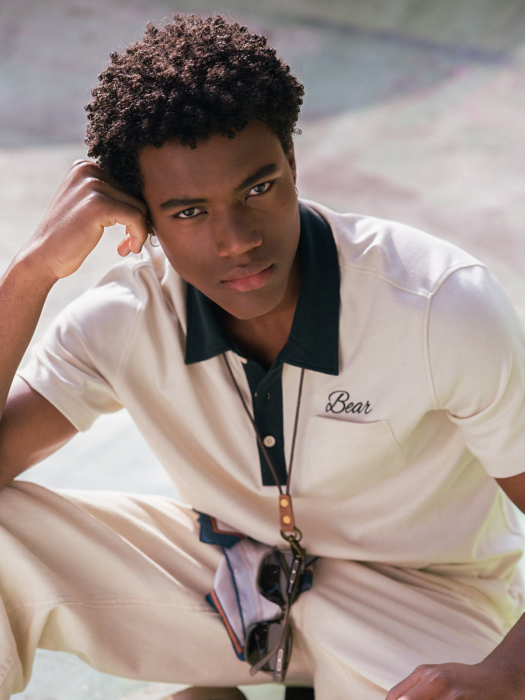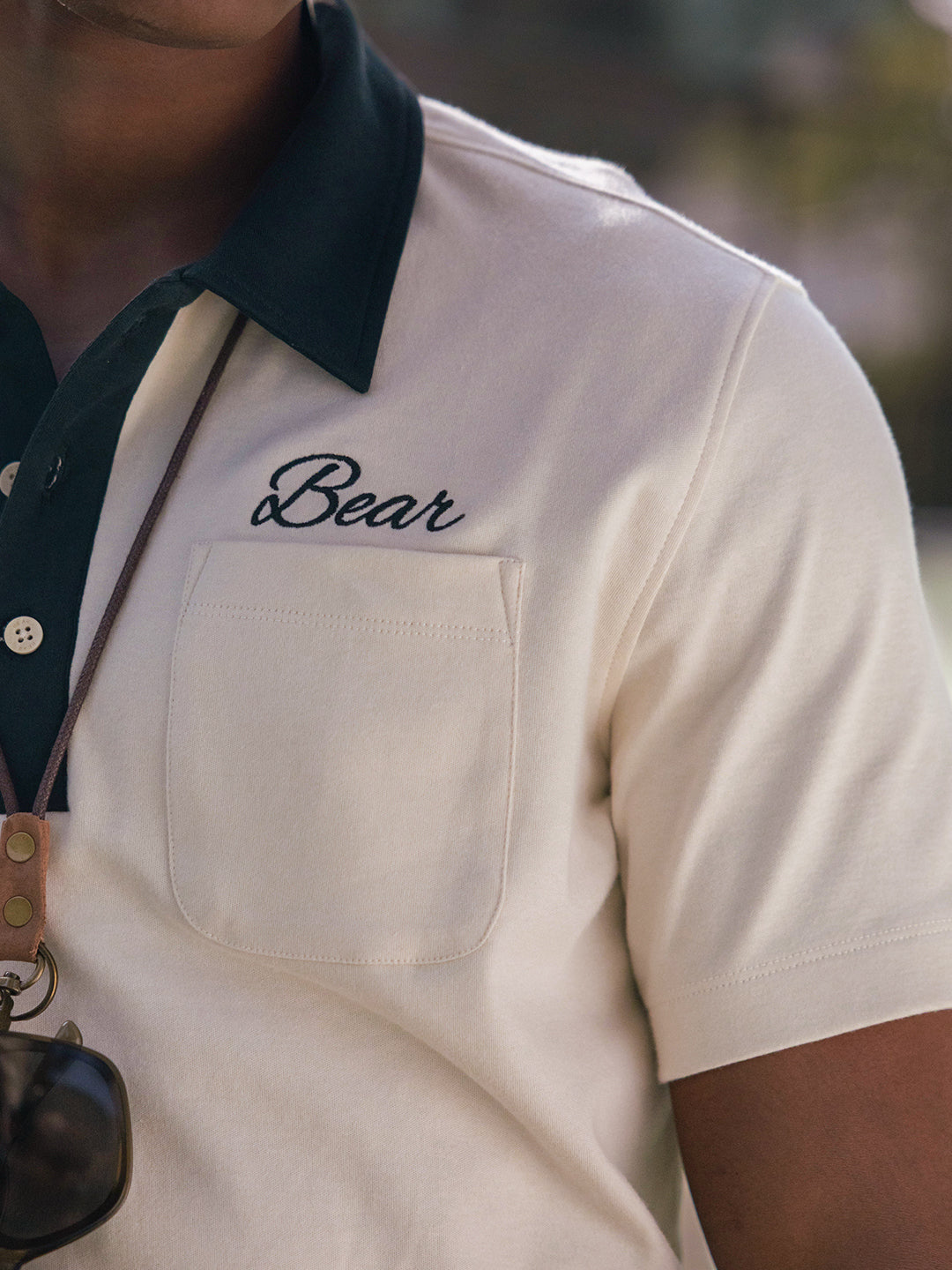 - Pattern: Solid with bear embroidery detail and a patch pocket