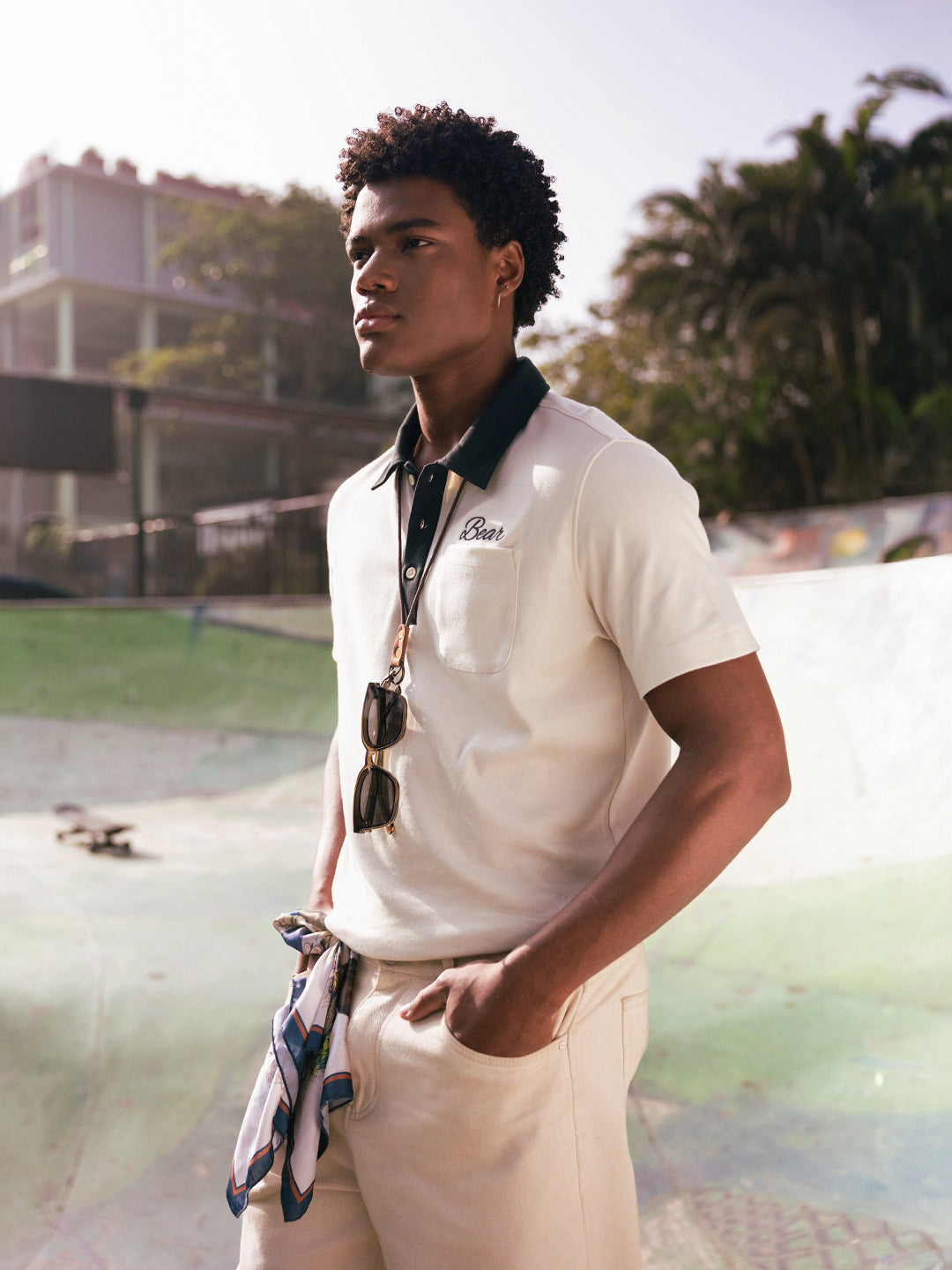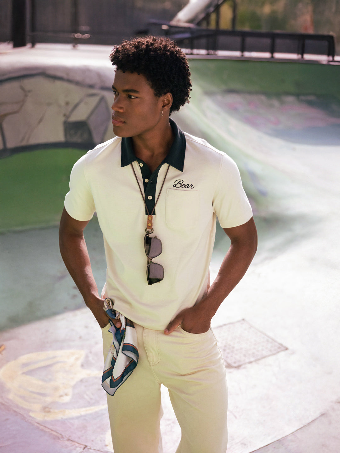 - Collar: Contrast Green Polo collar with button Placket