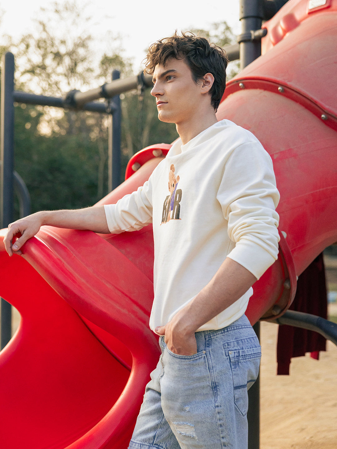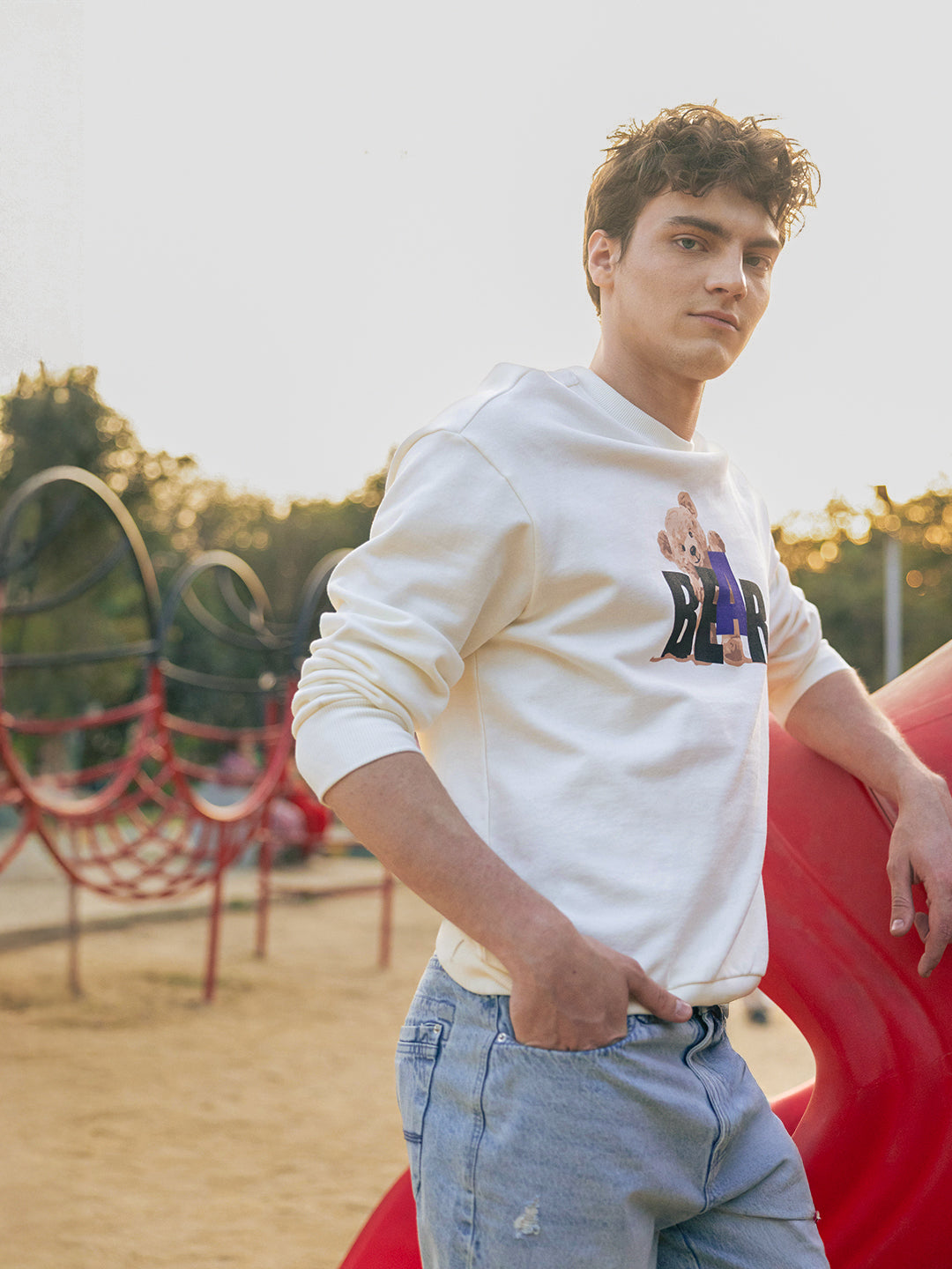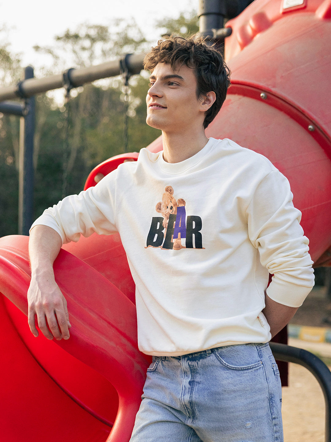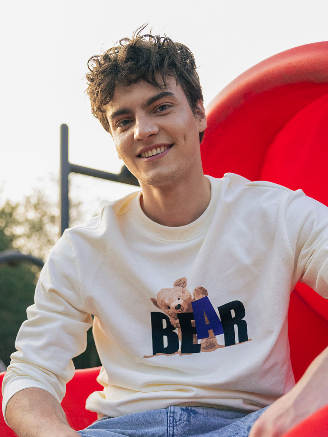 Off-White Relax Fit Crew Neck Sweatshirt with Teddy Bear Graphic Print