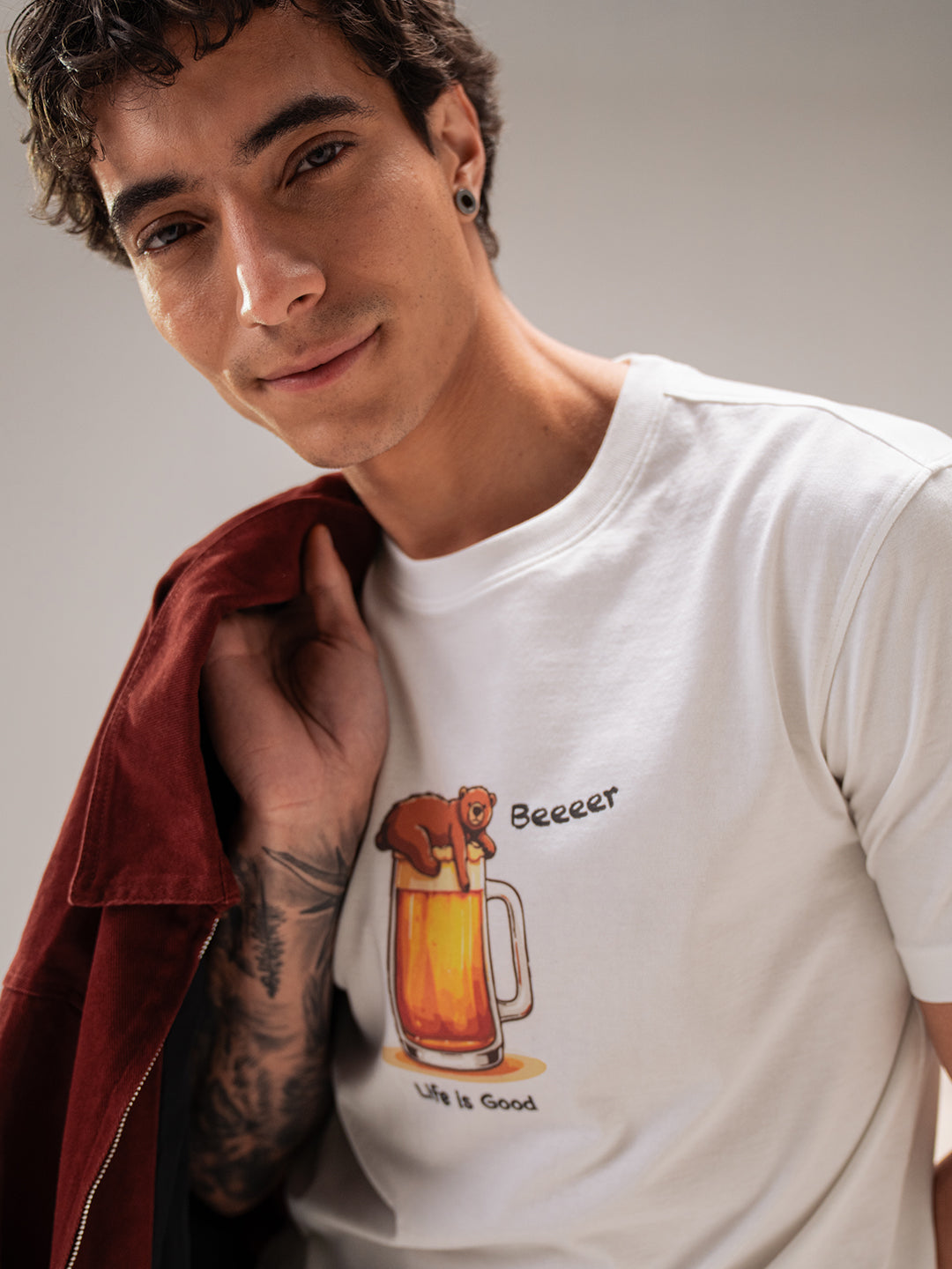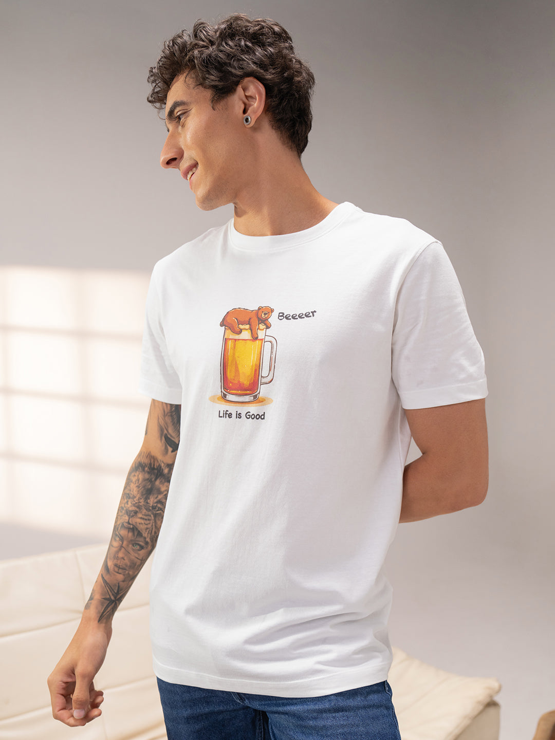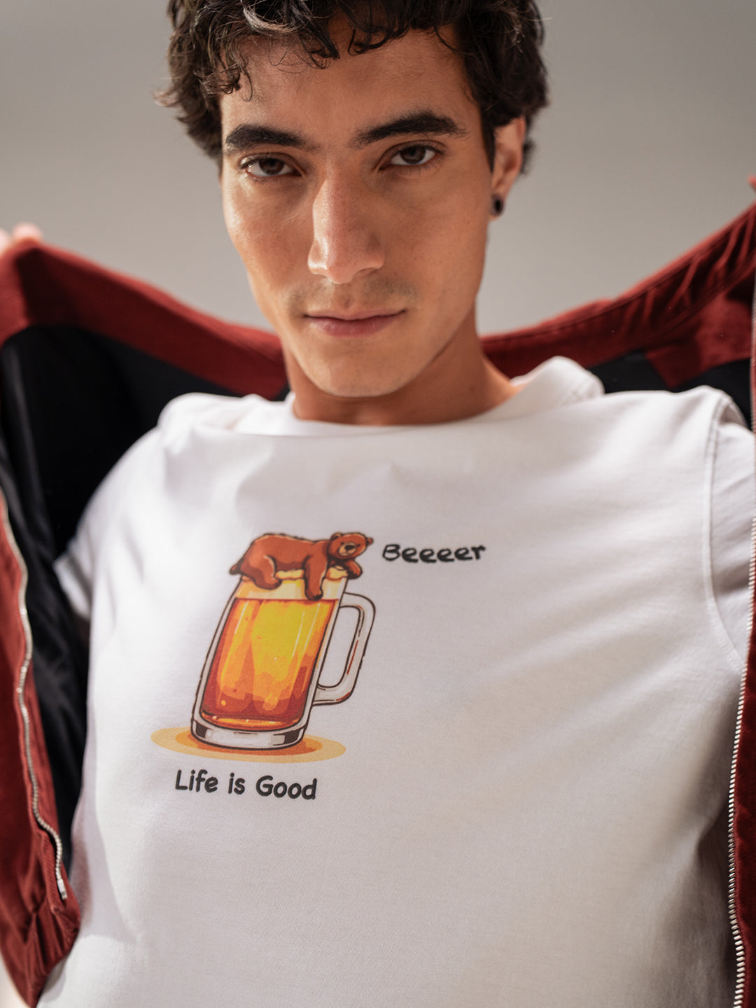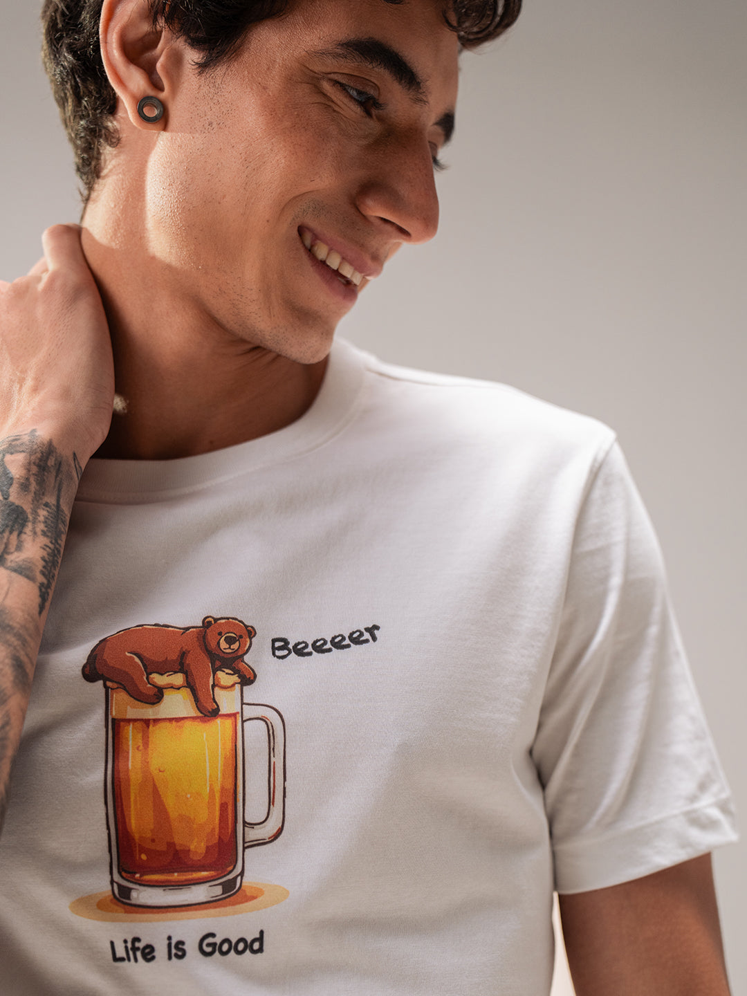 • Front Design: “Life Is Good” typography with a cute bear illustration lounging on a beer mug
