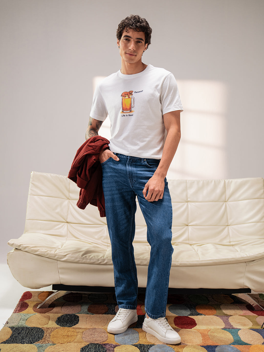 White Regular Fit T-Shirt with “Life Is Good” Bear Graphic