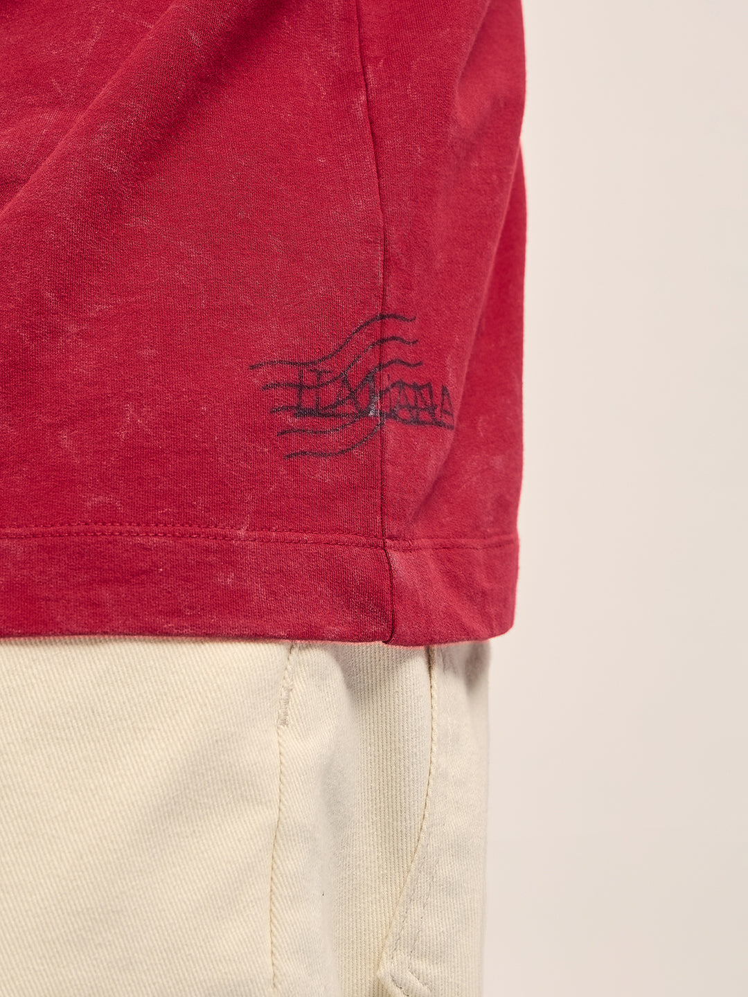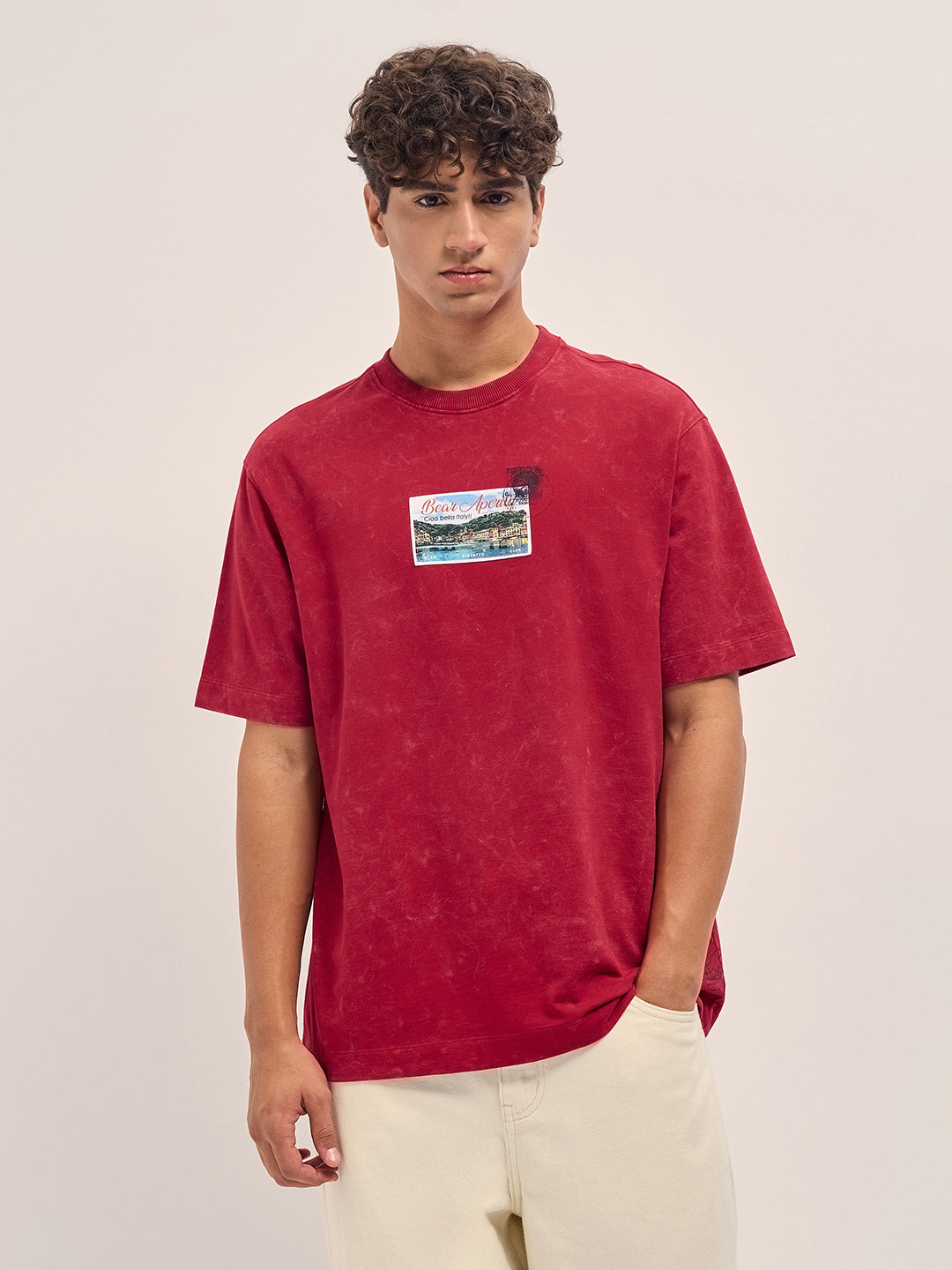 Red Oversized Crew Neck T-Shirt with Postcard Graphic Print