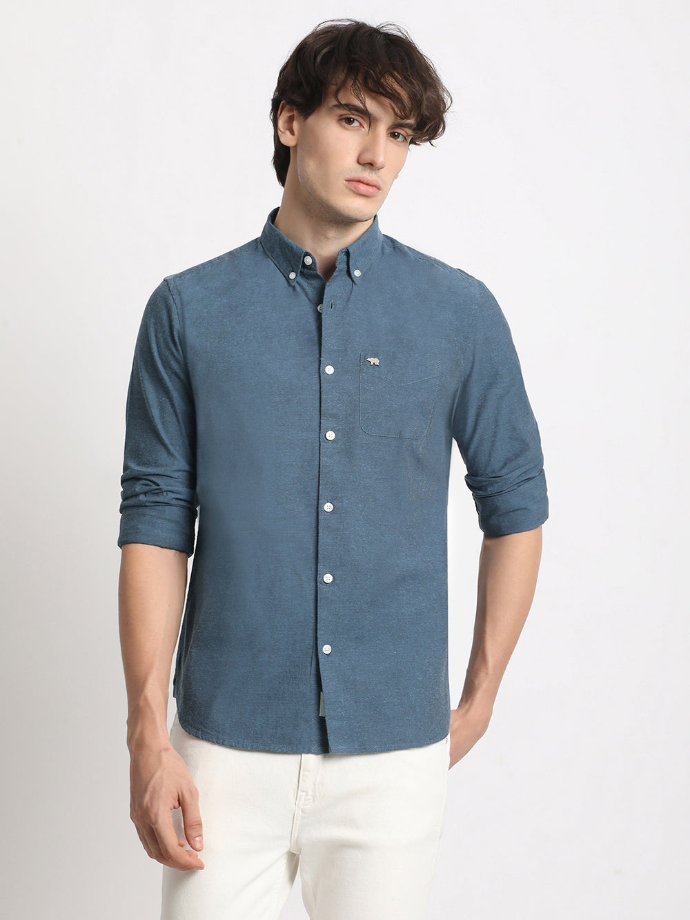 Shop Men's Blue Solid Slim Fit Cotton Casual Shirt Online.