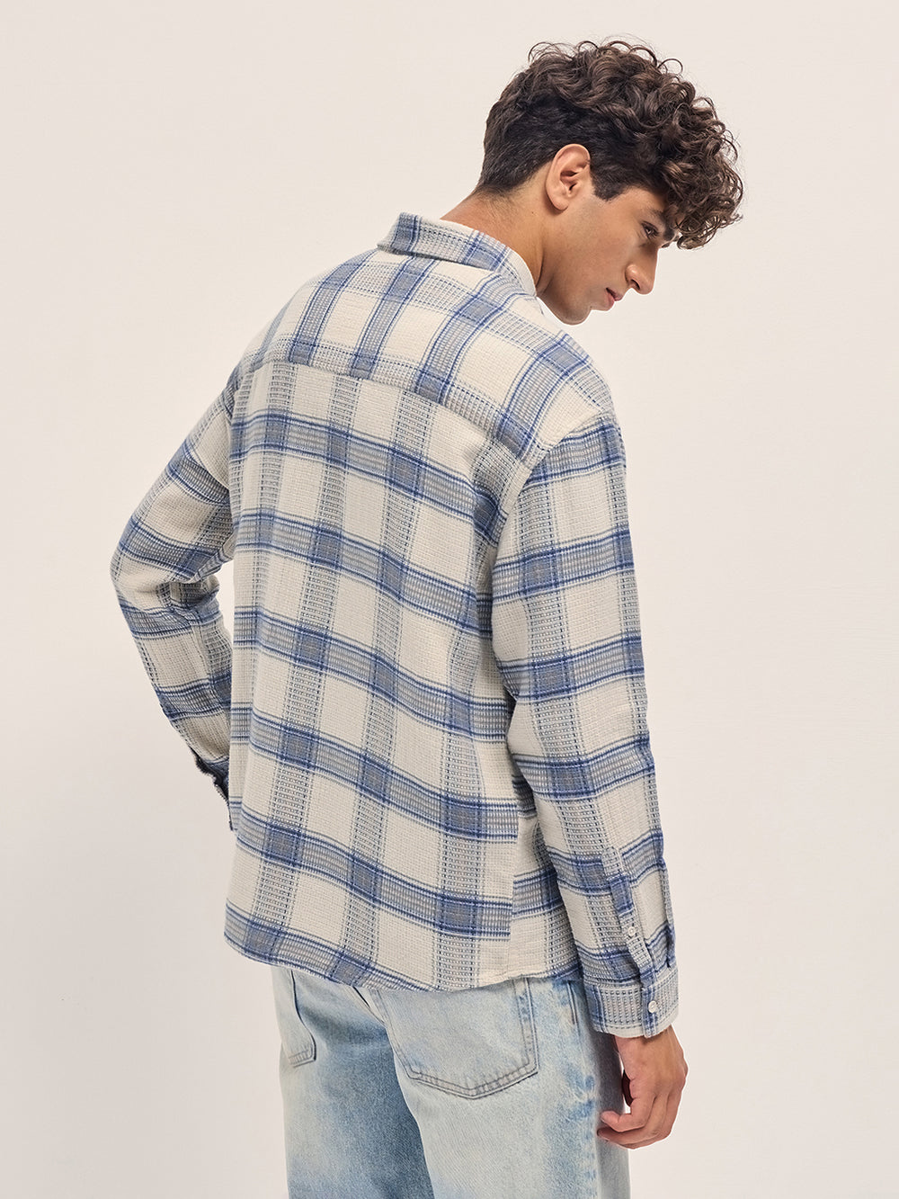 Cream & Blue Waffle Checked Textured Relaxed Fit Casual Shirt