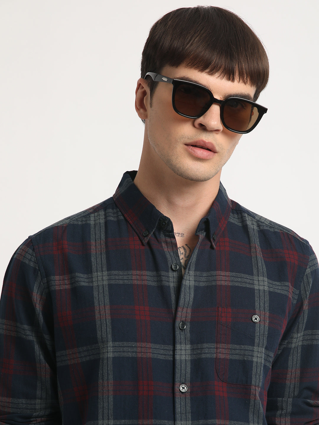 Men Blue Checked Slim Fit Cotton Casual Shirt