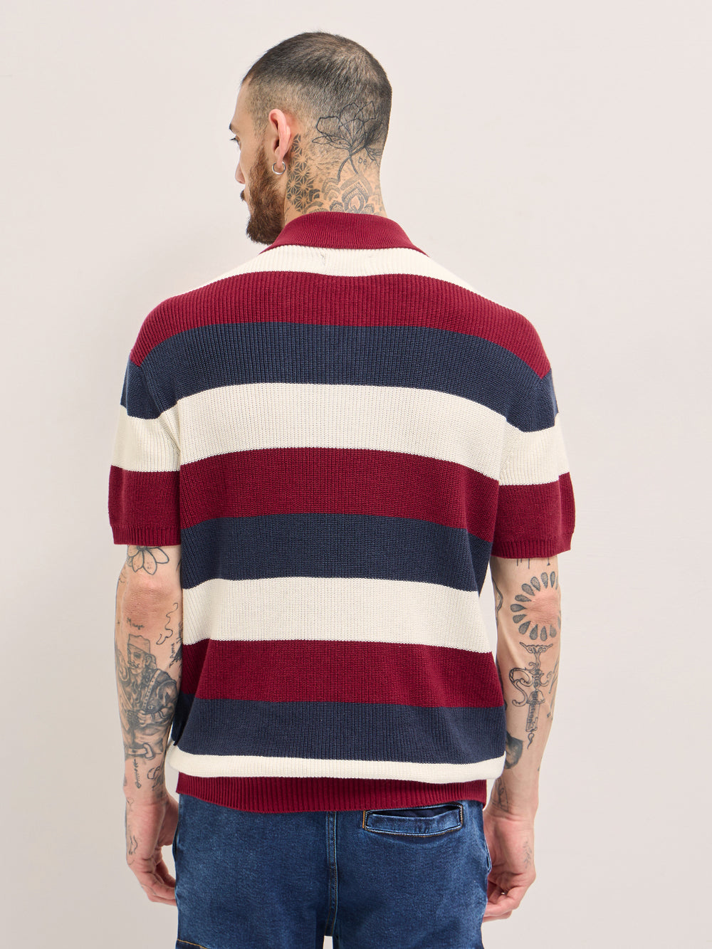 Multi-Color Horizontal Striped Textured Knit Design Regular Fit Polo