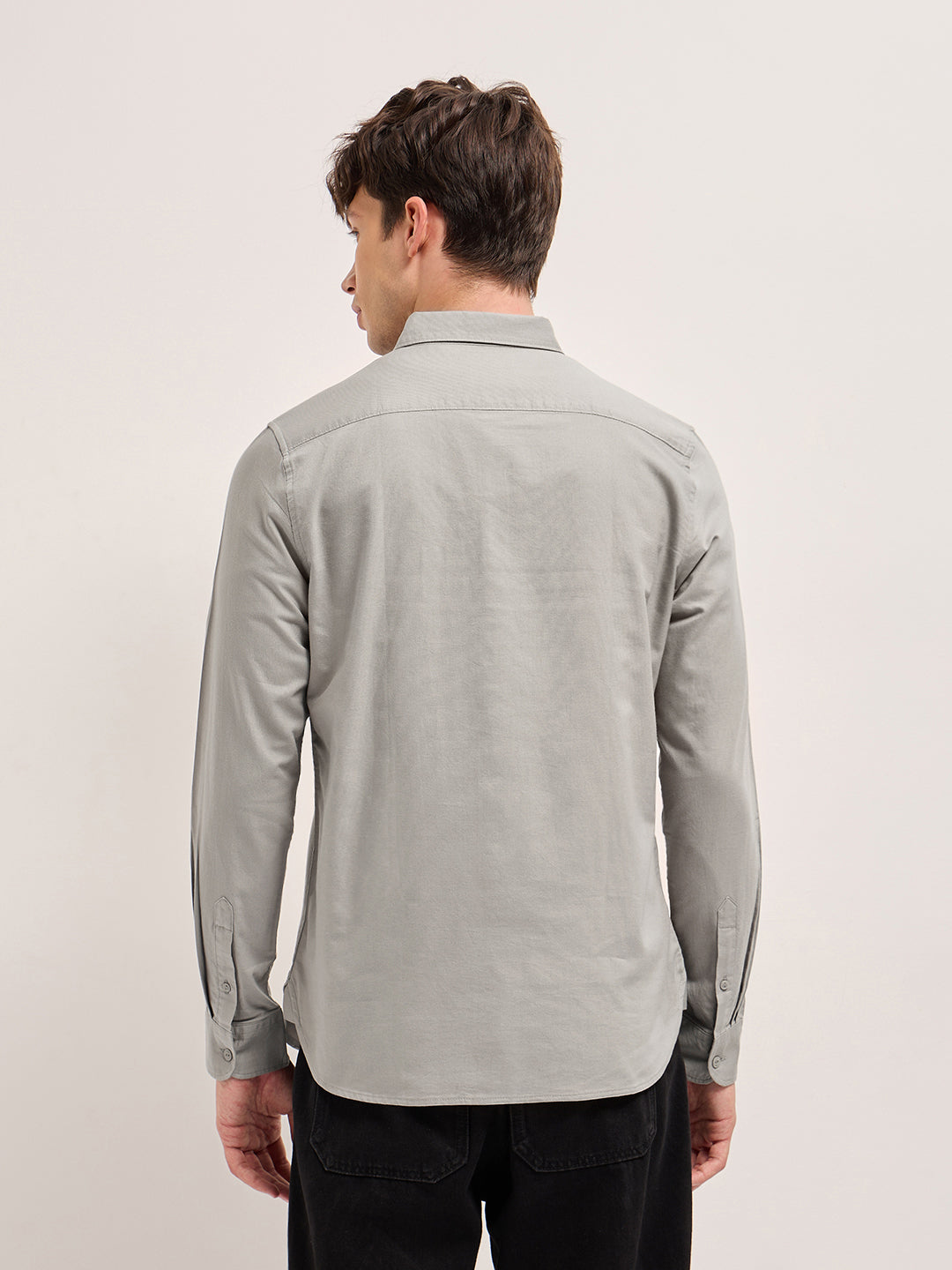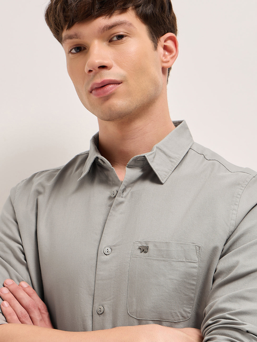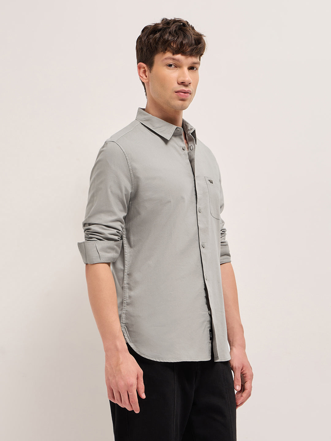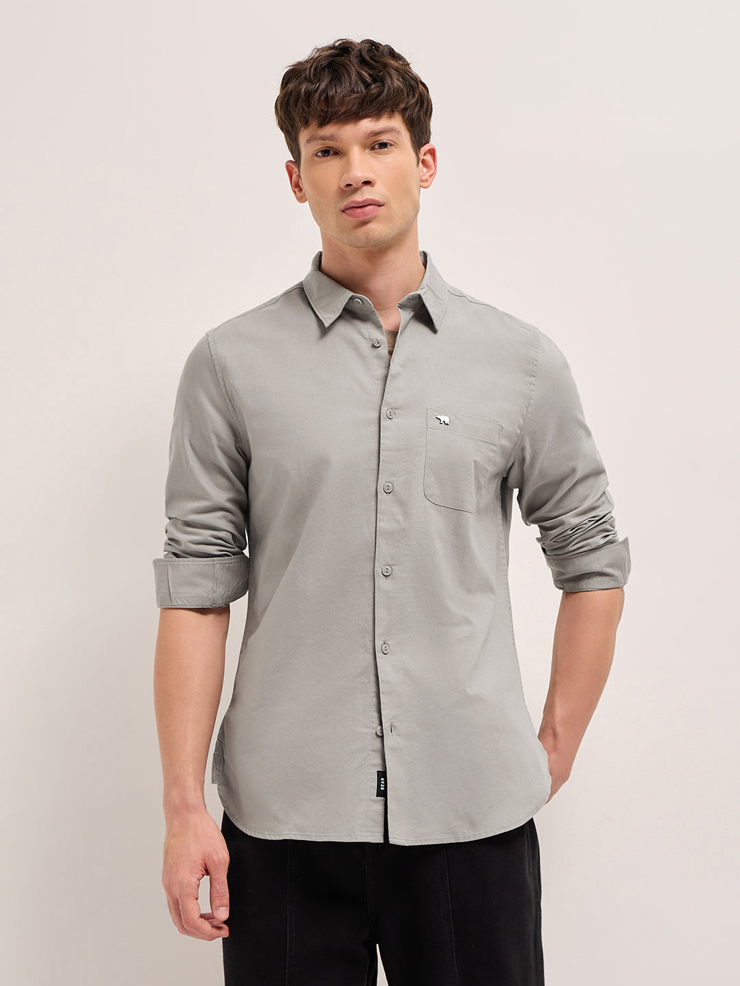 Beige Cotton Solid Slim Fit Casual Shirt