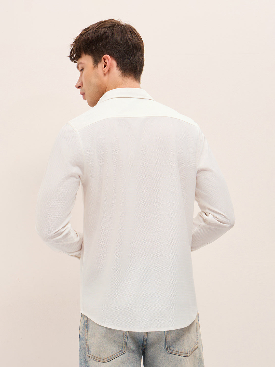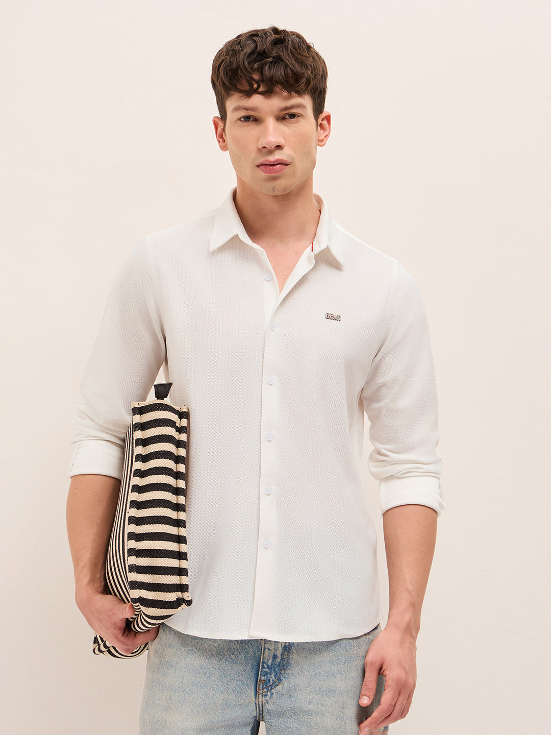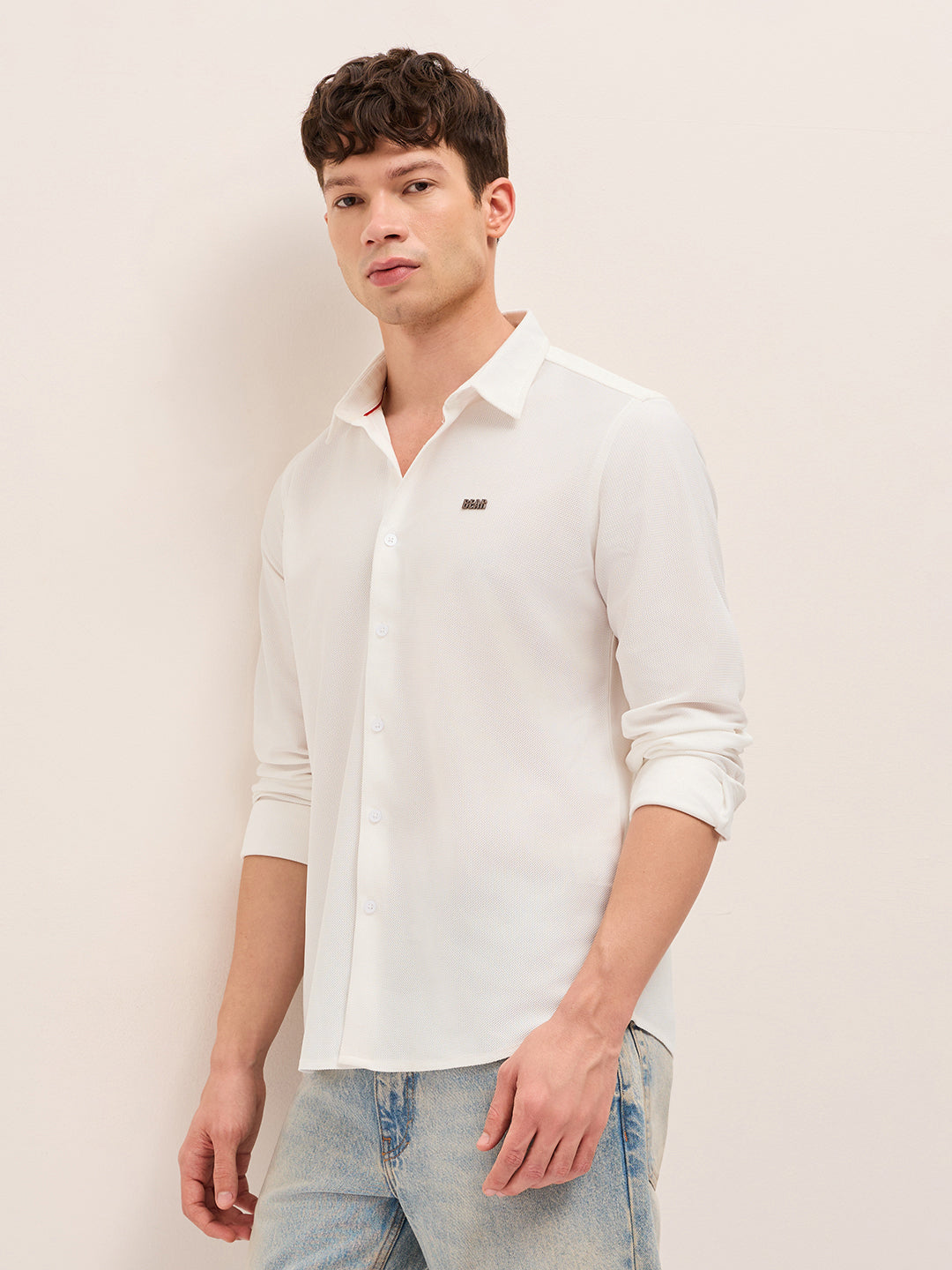 Shop White Woven Textured Regular Fit Casual Shirt Online.