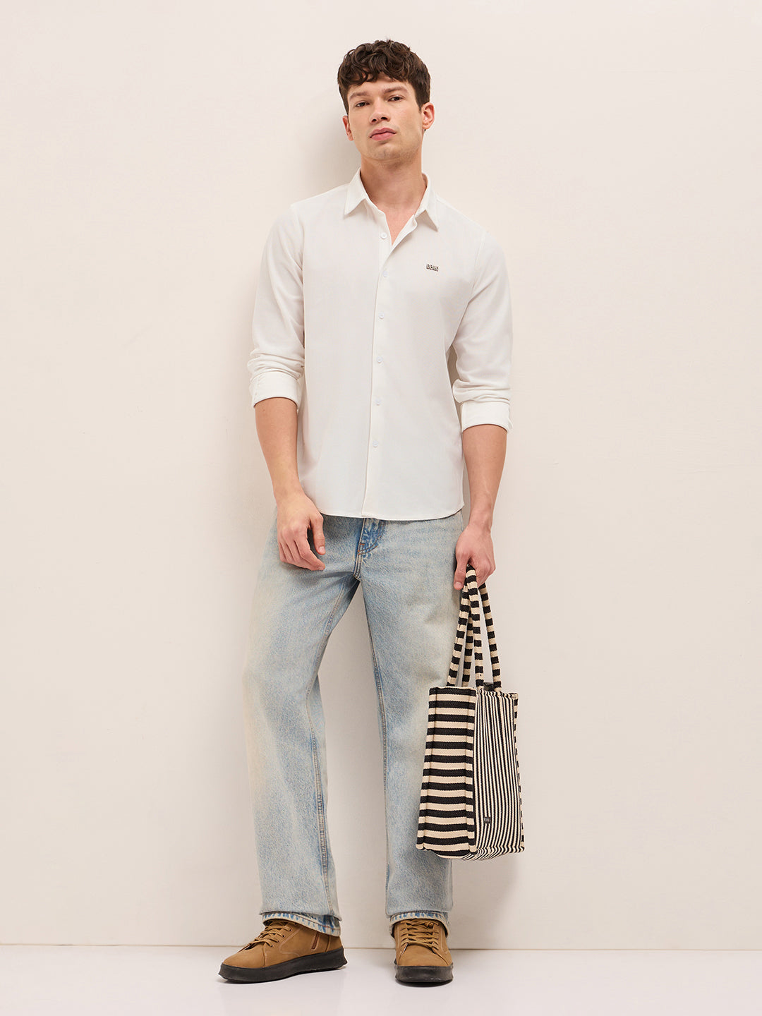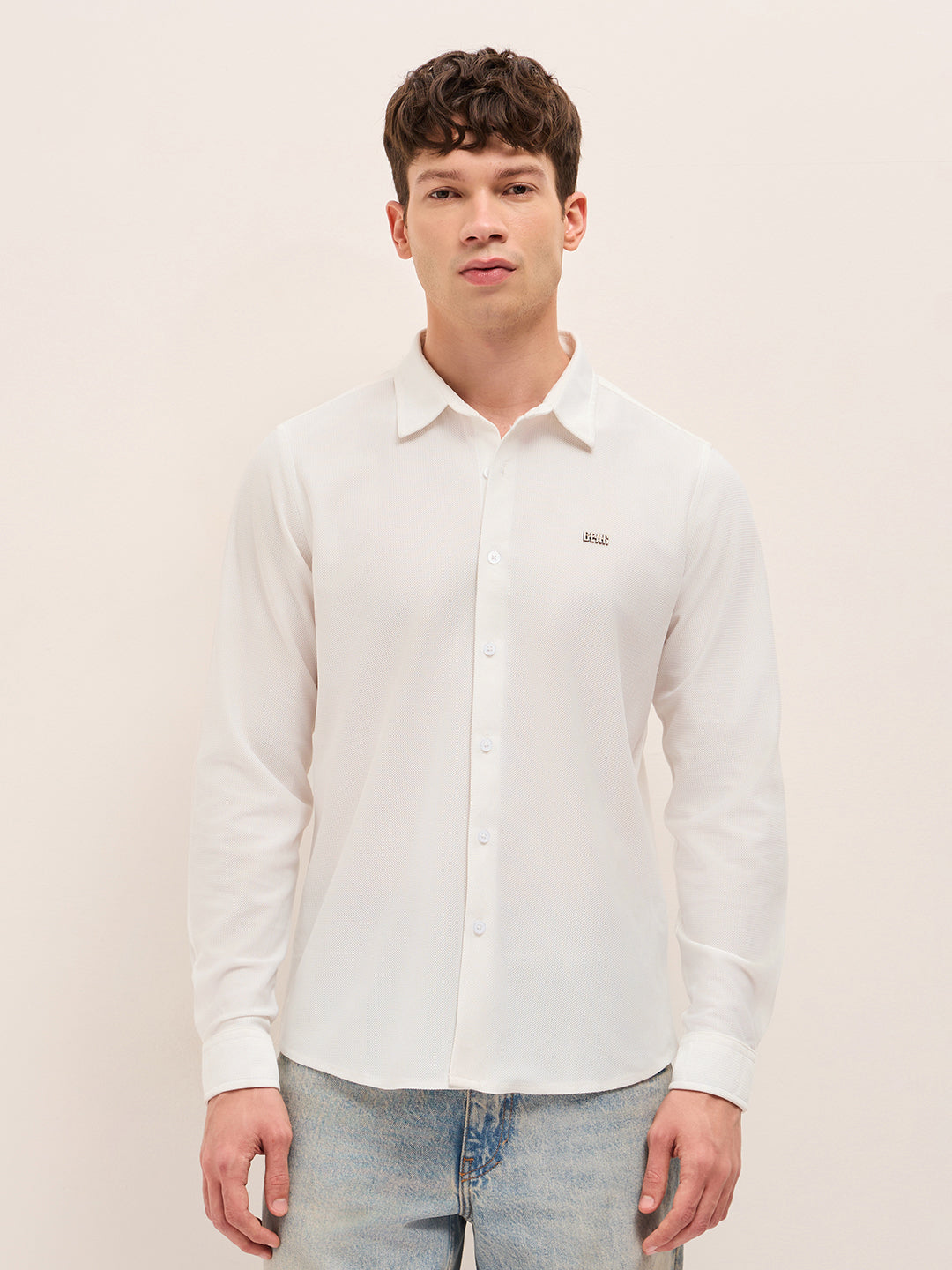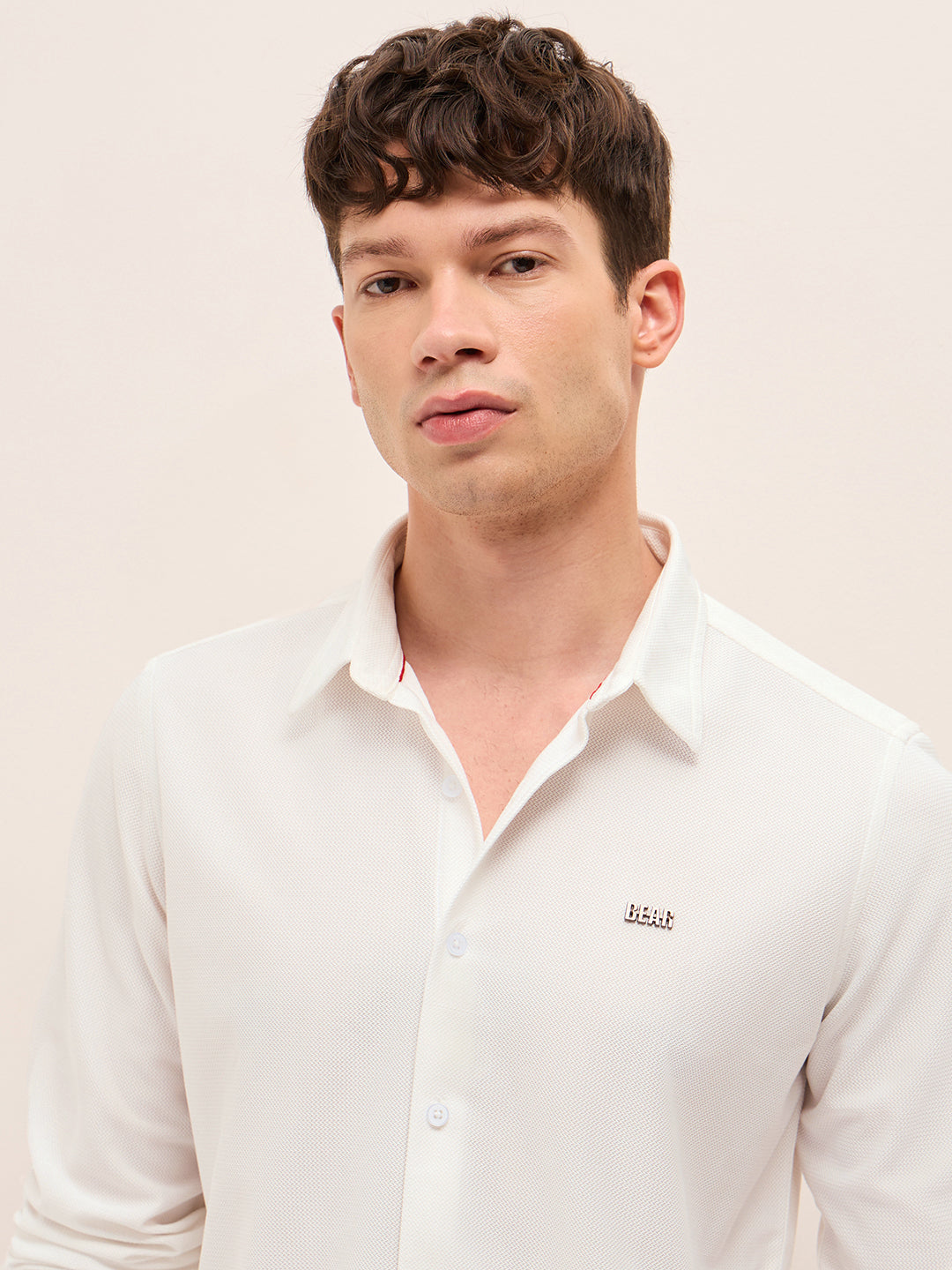 Shop White Woven Textured Regular Fit Casual Shirt Online.