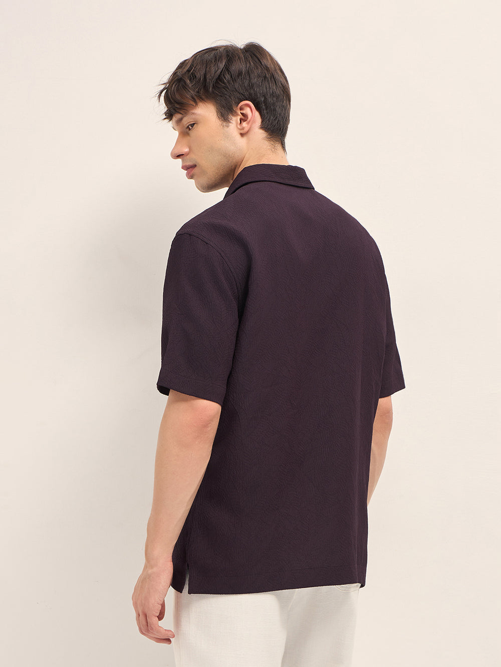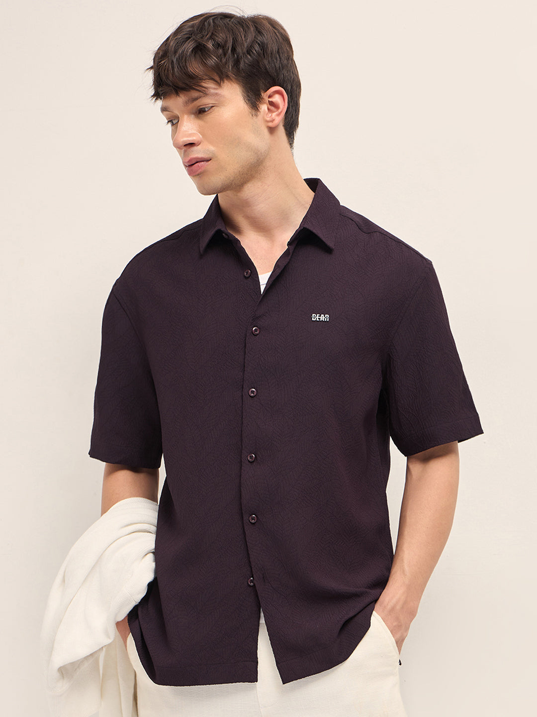 Burgundy All-Over Textured Leaf Motif Oversized Casual Shirt with Half Sleeves