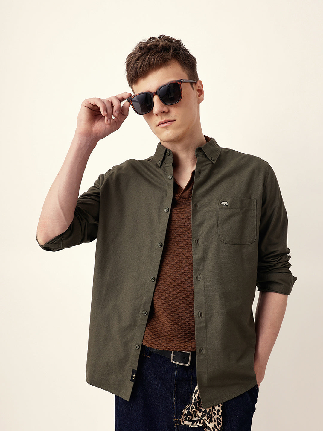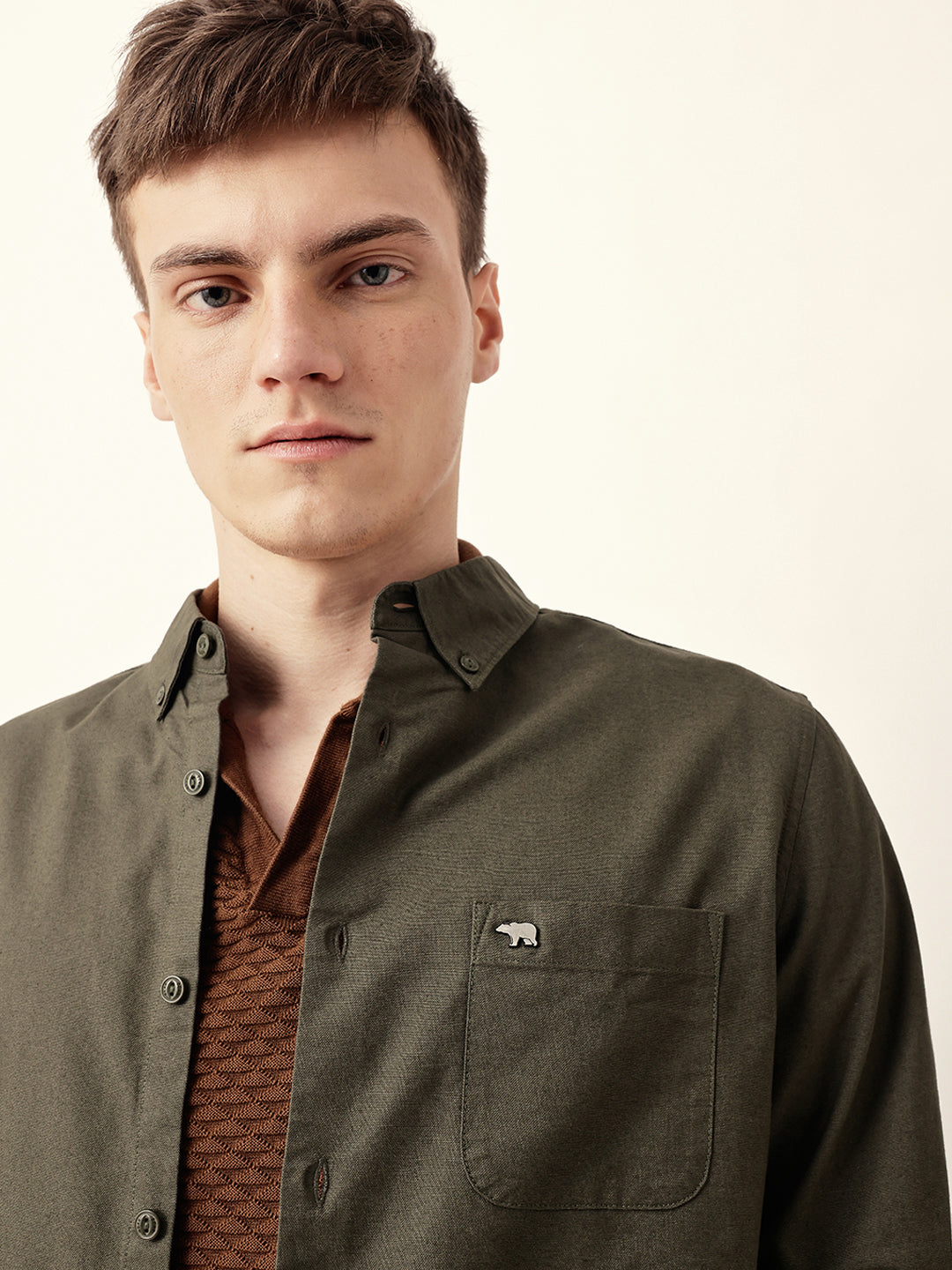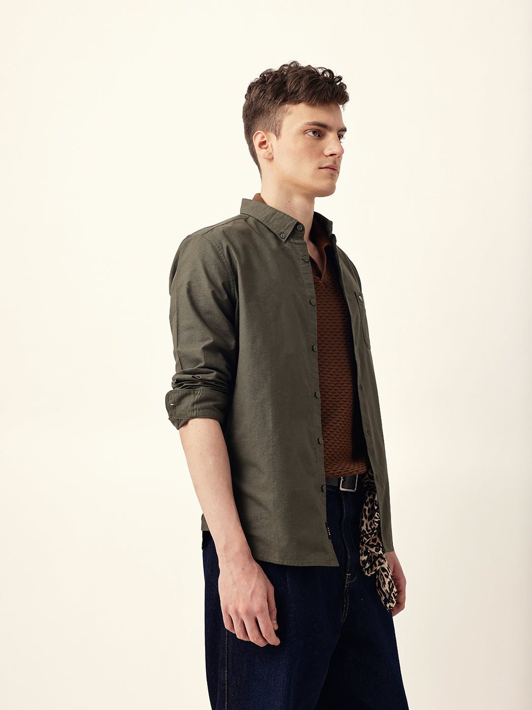 Olive Solid Cotton Slim Fit Casual Shirt with Button-Down Collar