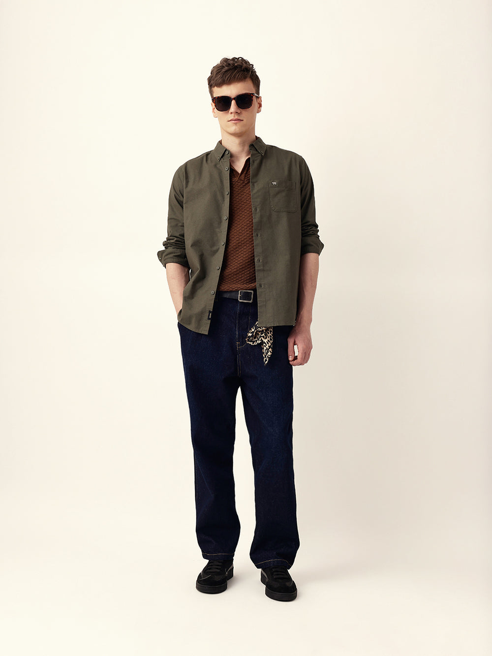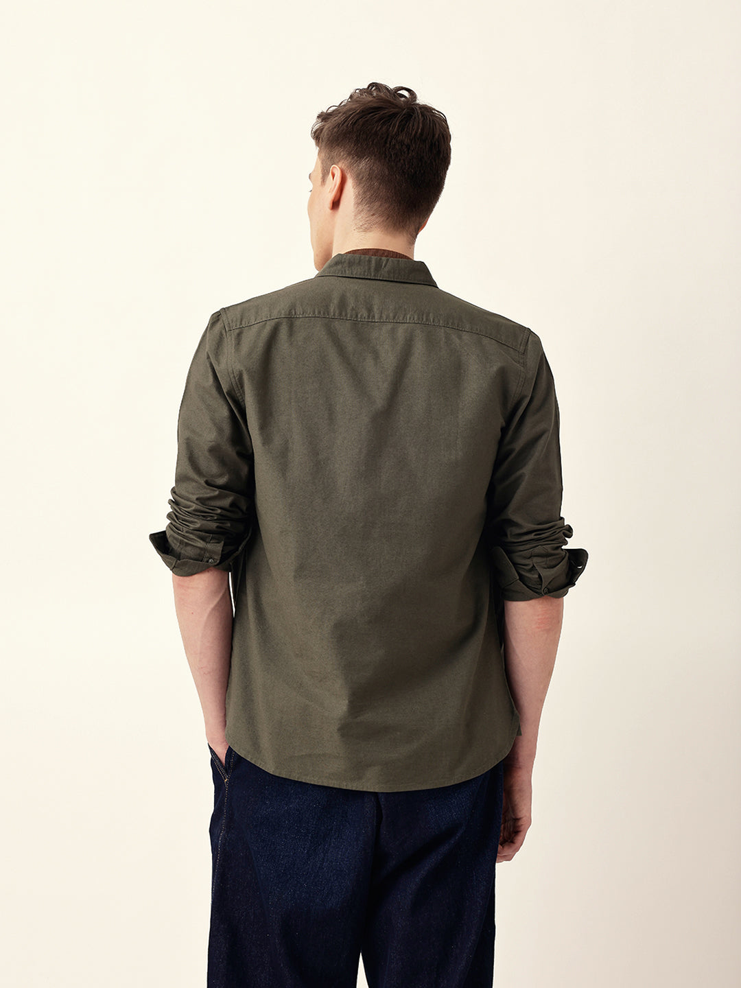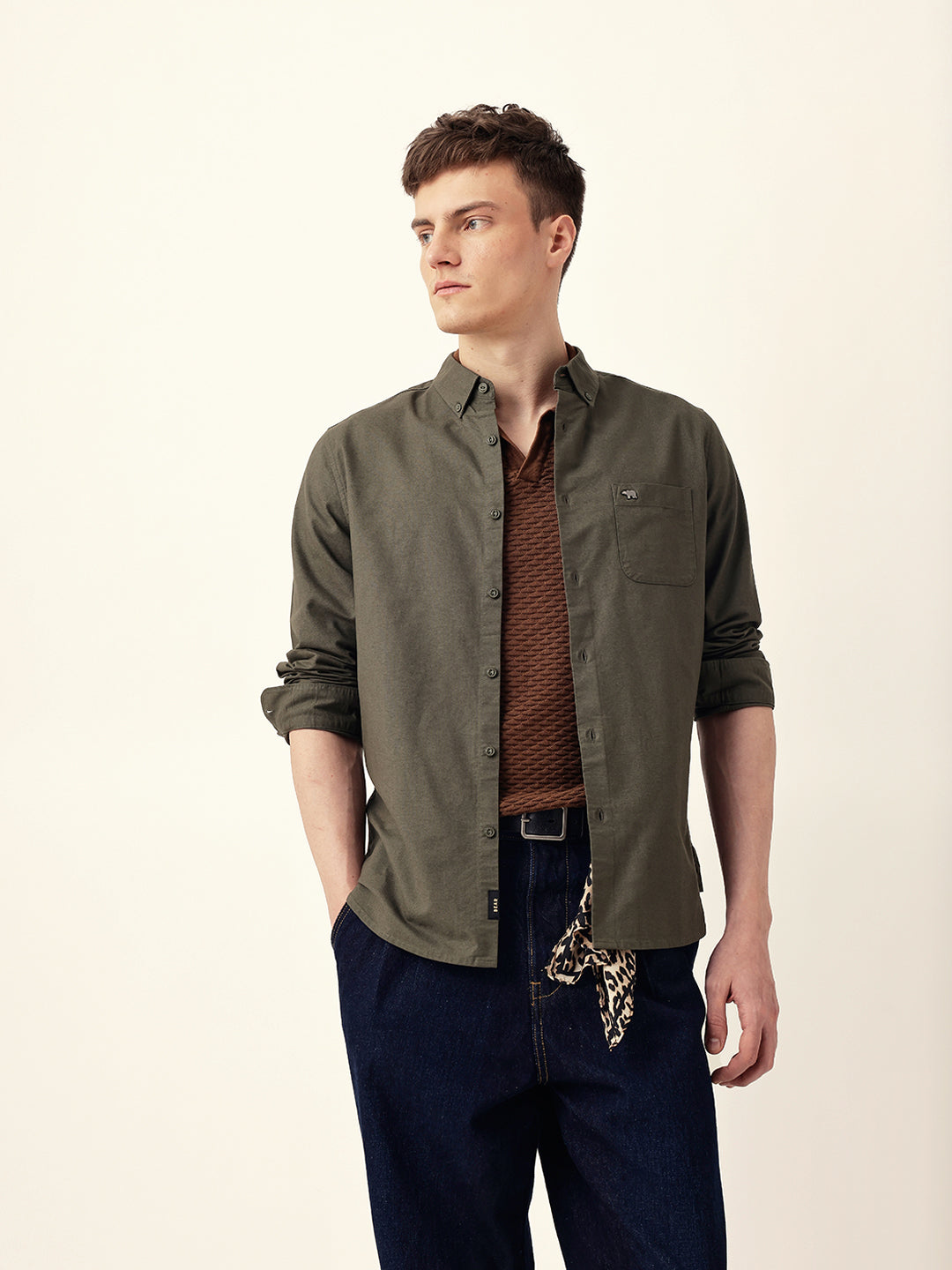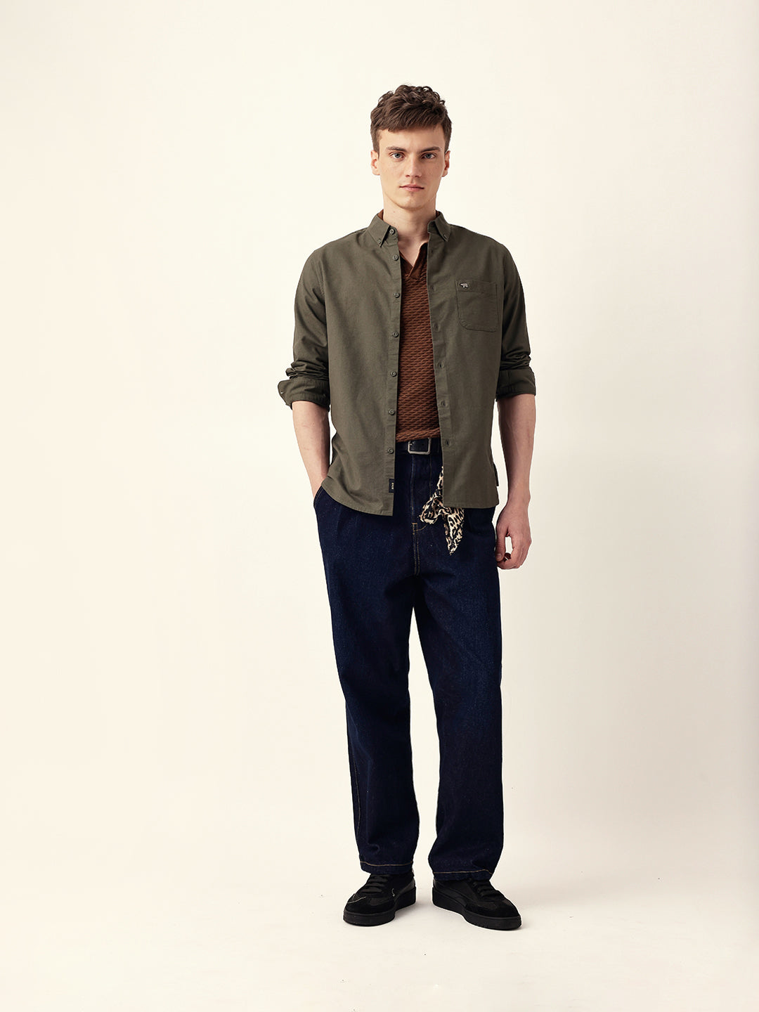 Olive Solid Cotton Slim Fit Casual Shirt with Button-Down Collar