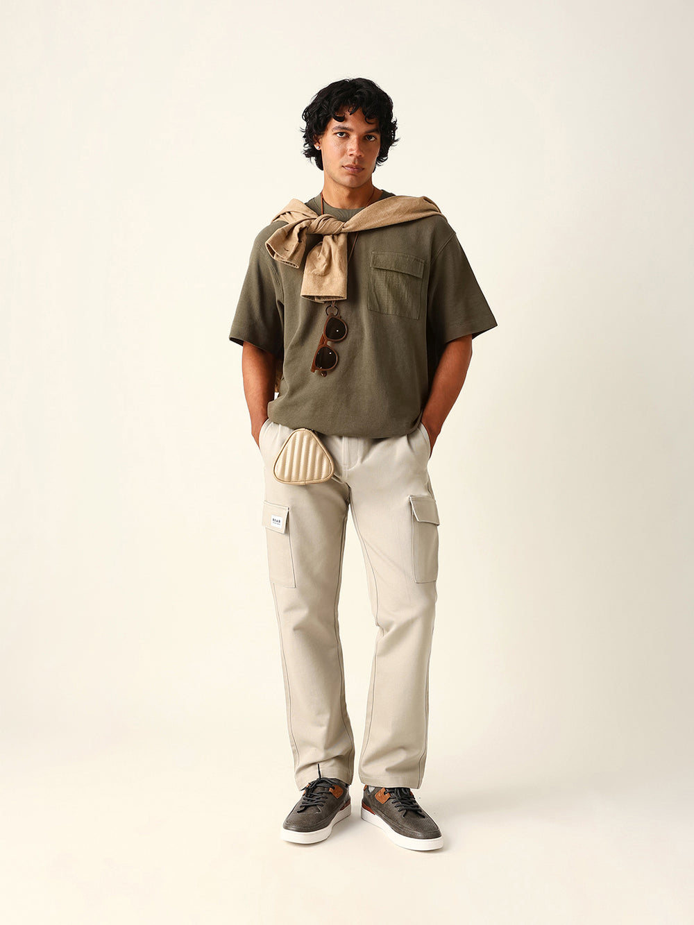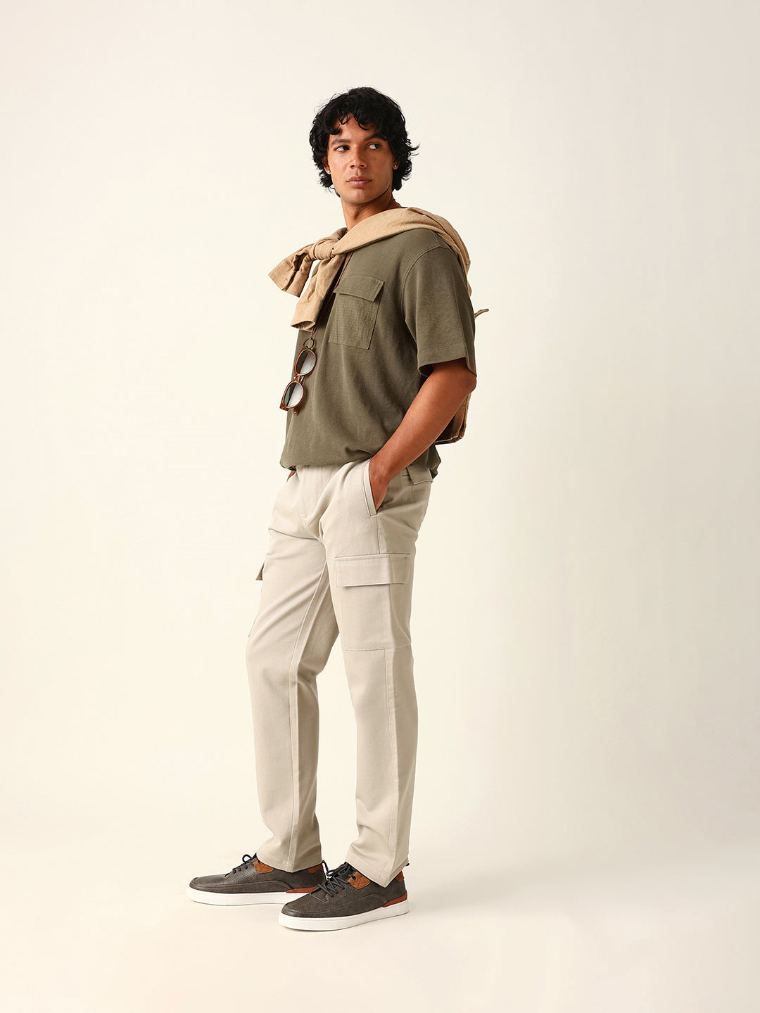 Beige Solid Straight Fit Cargo Trousers with Flap Pockets