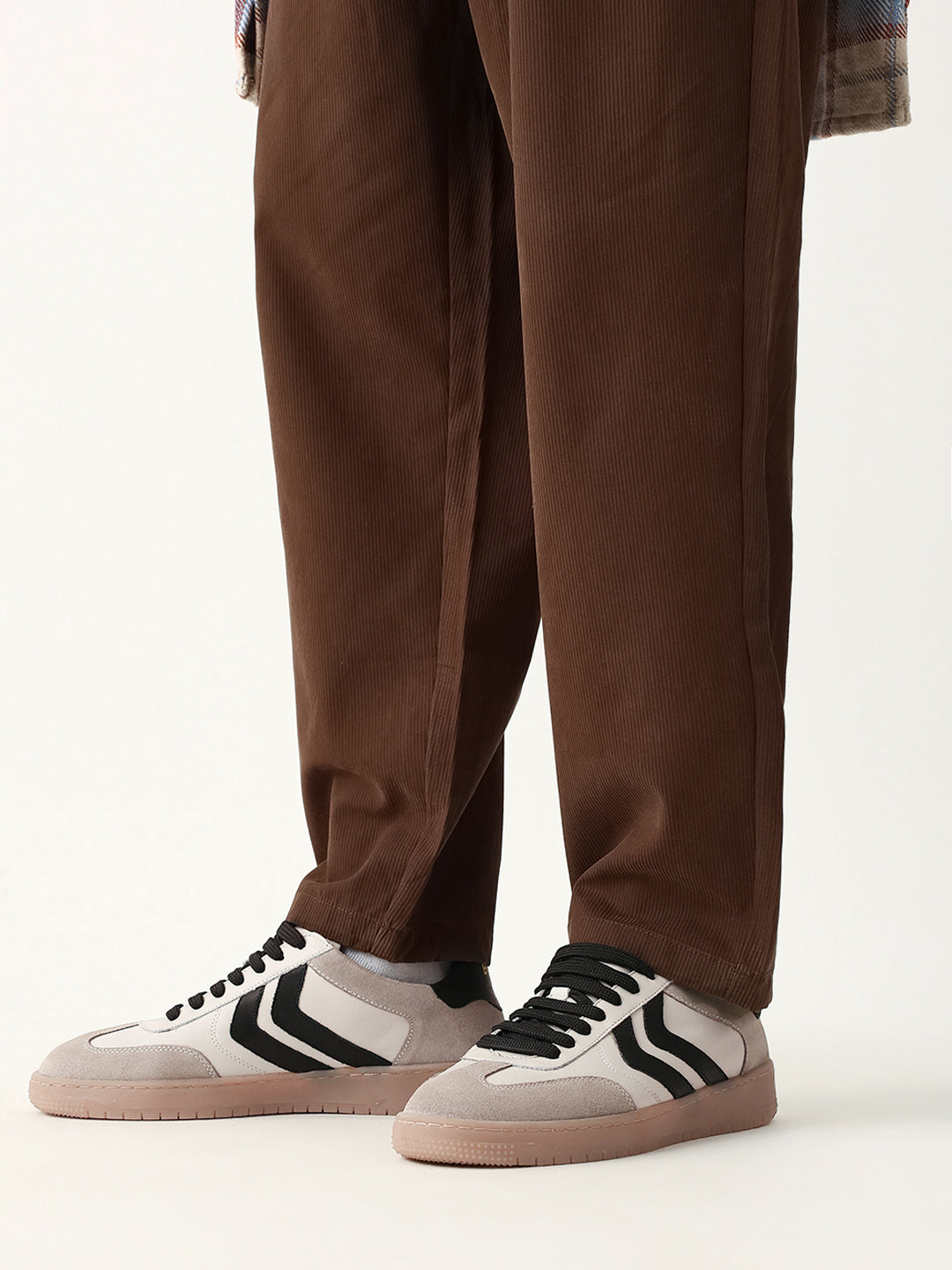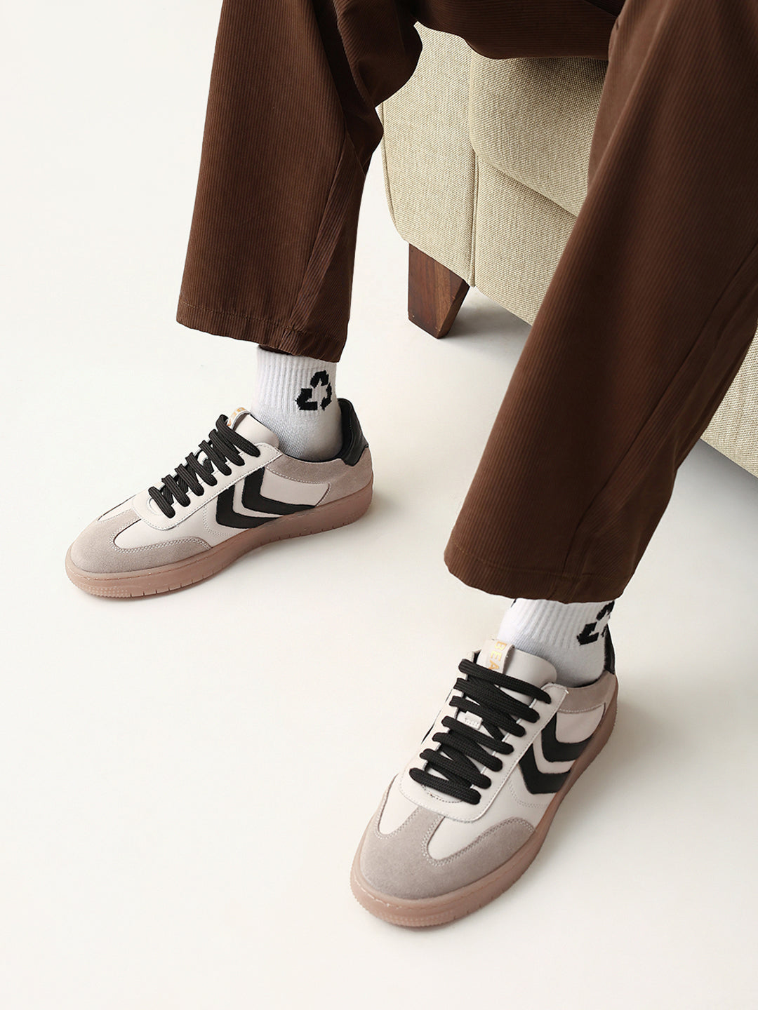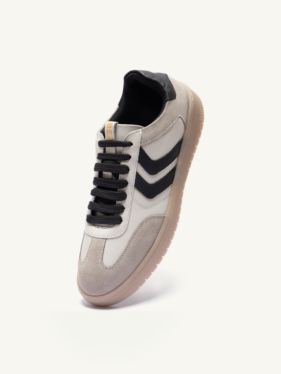 Cream Suede Lace-Up Sneakers with Contrast Black Leather Detail