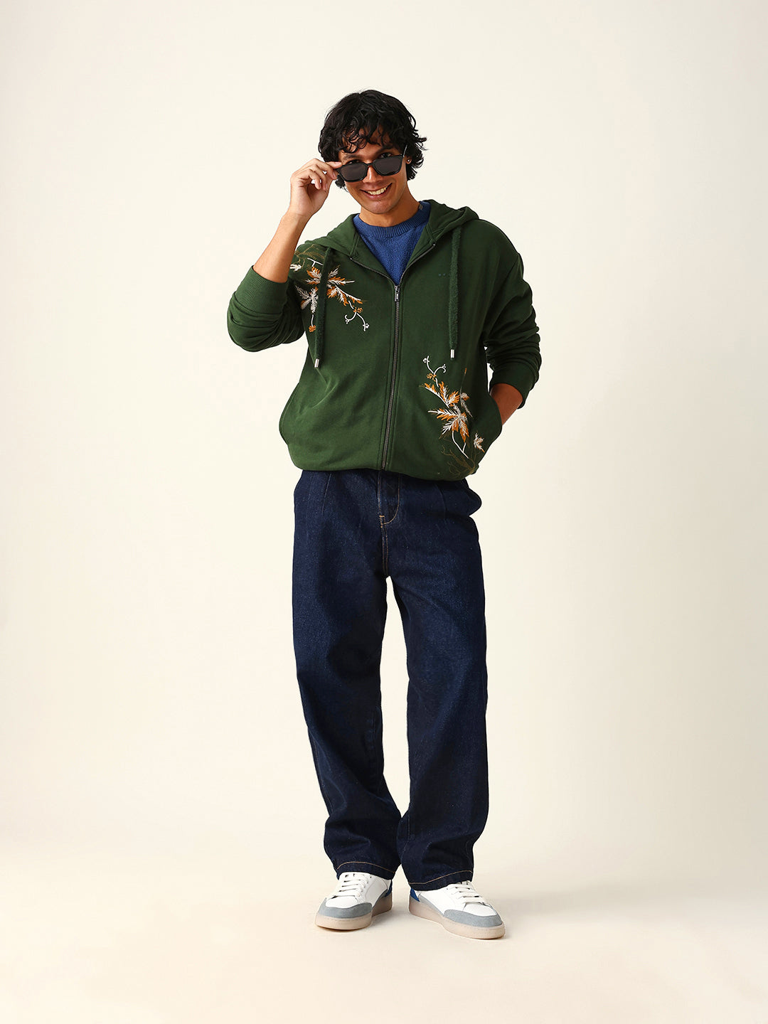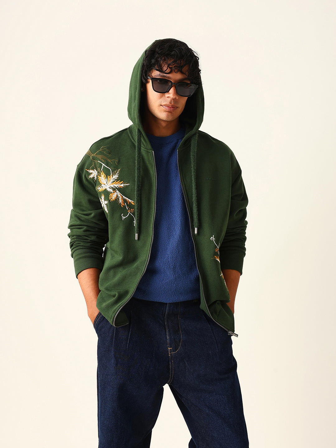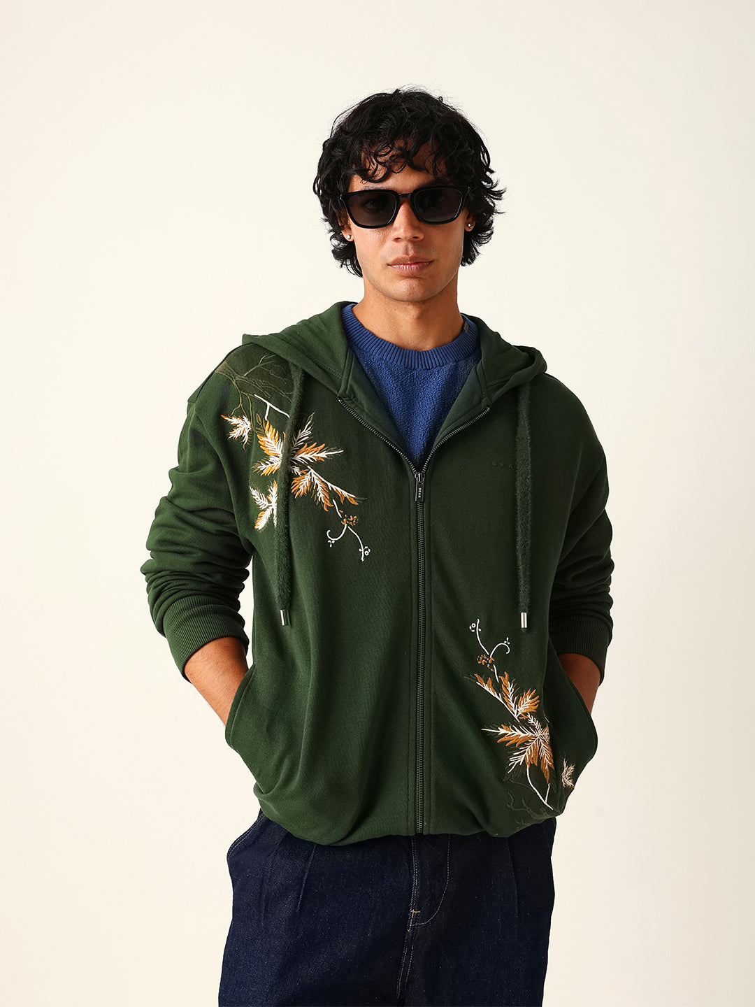 Dark Green Relax Fit Hoodie with Floral Embroidery & Adjustable Drawstrings