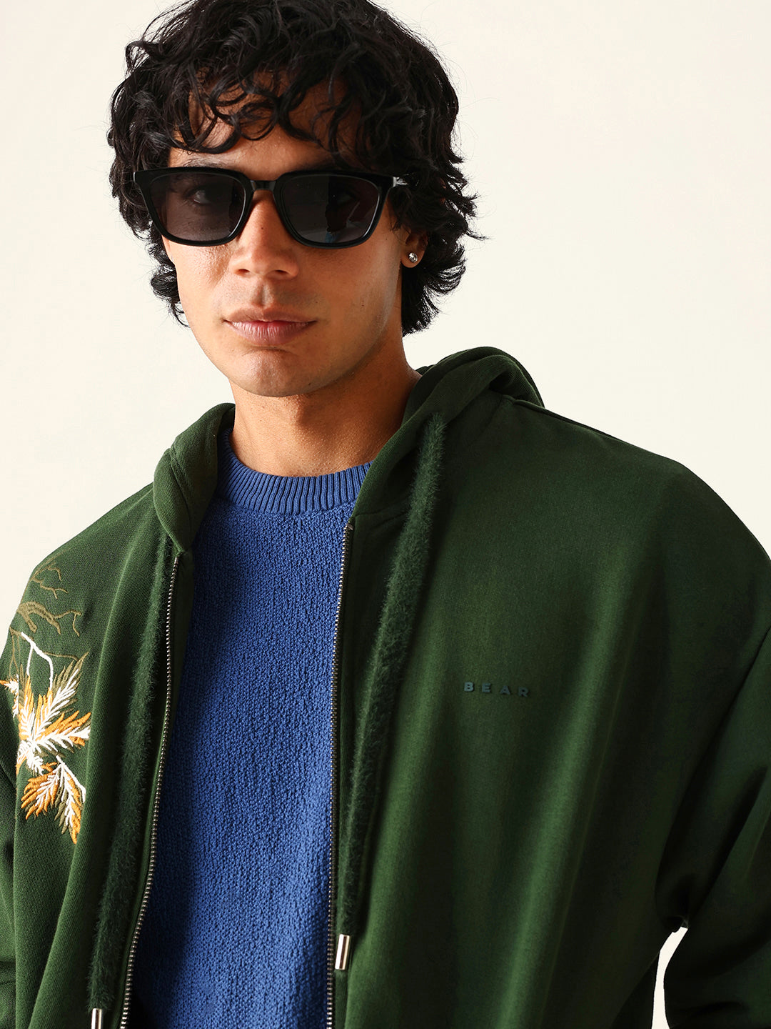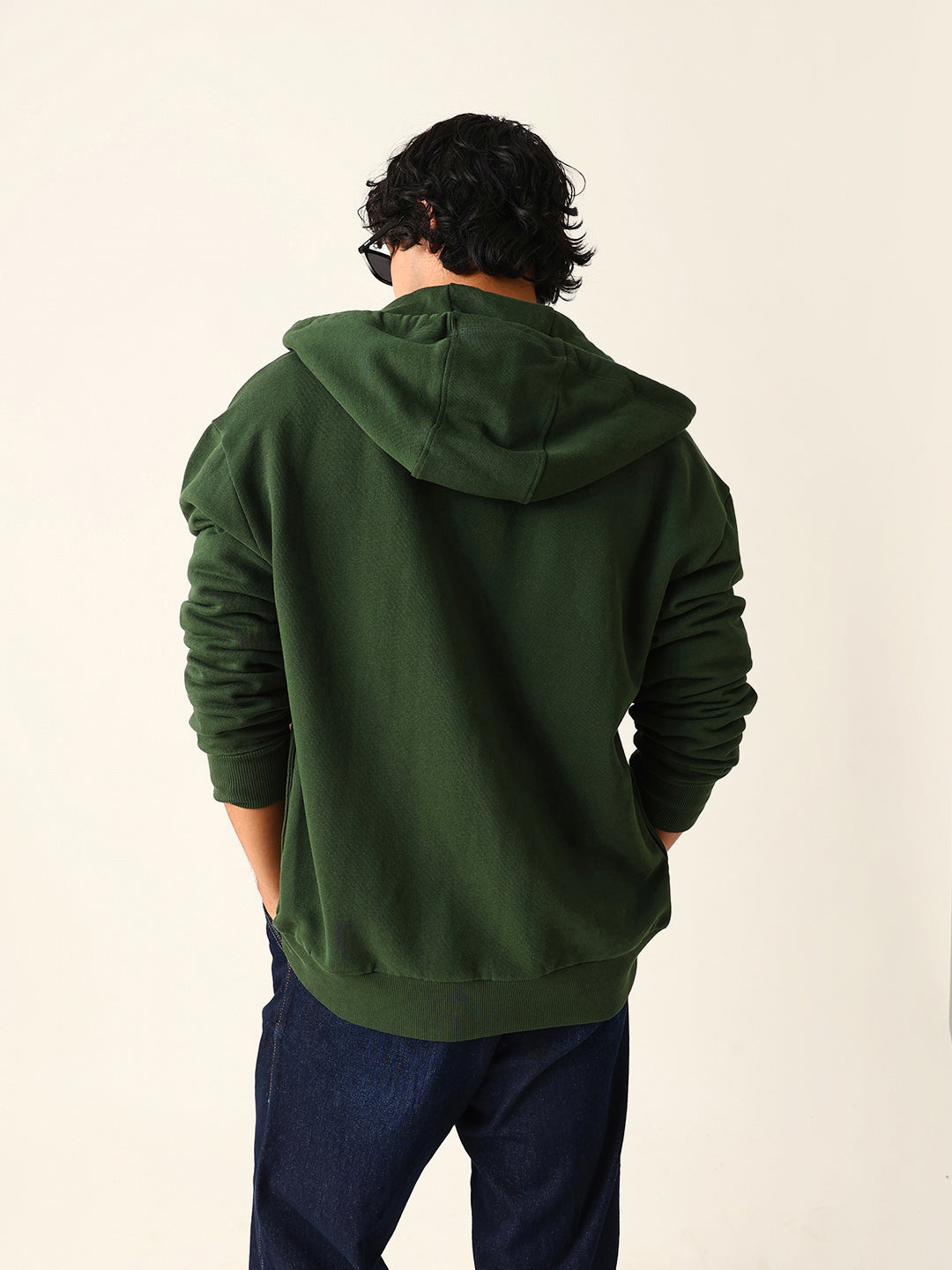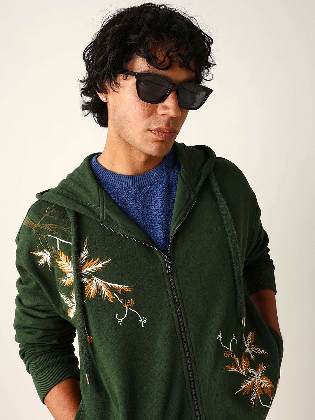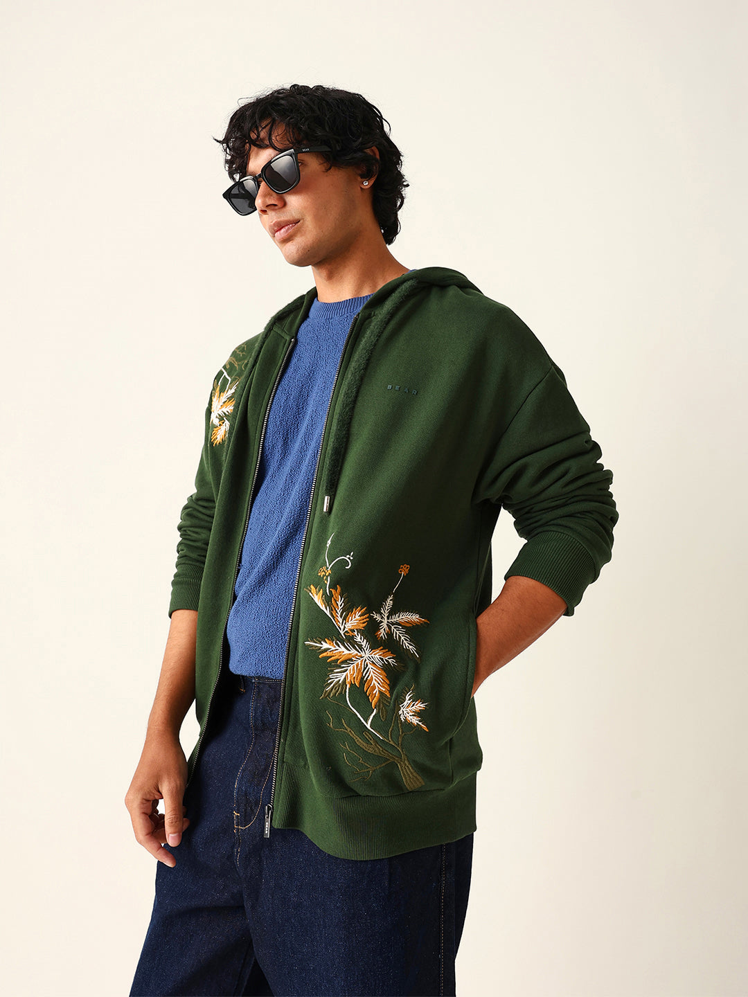 Dark Green Relax Fit Hoodie with Floral Embroidery & Adjustable Drawstrings