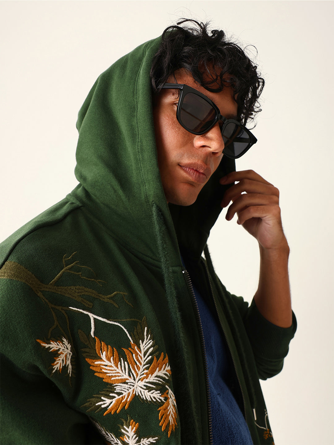 Shop Dark Green Relax Fit Hoodie with Floral Embroidery & Adjustable Drawstrings Online