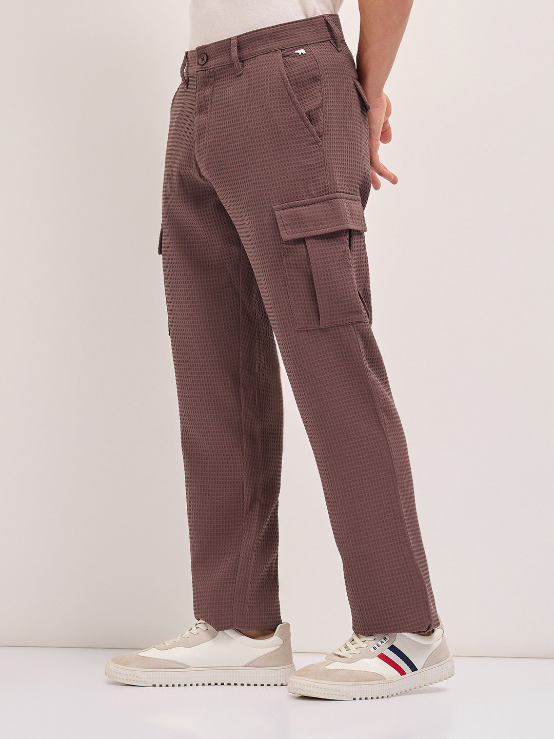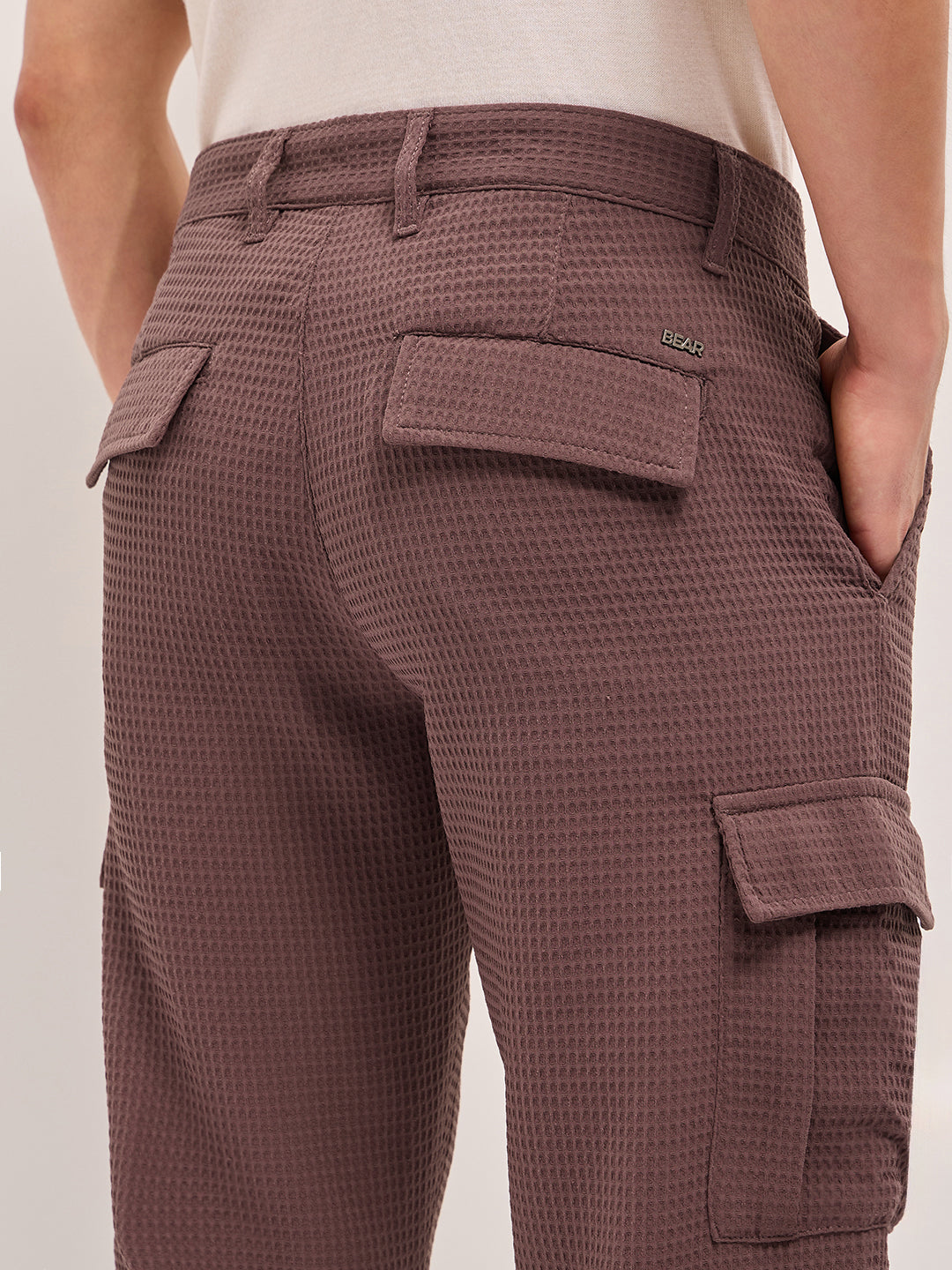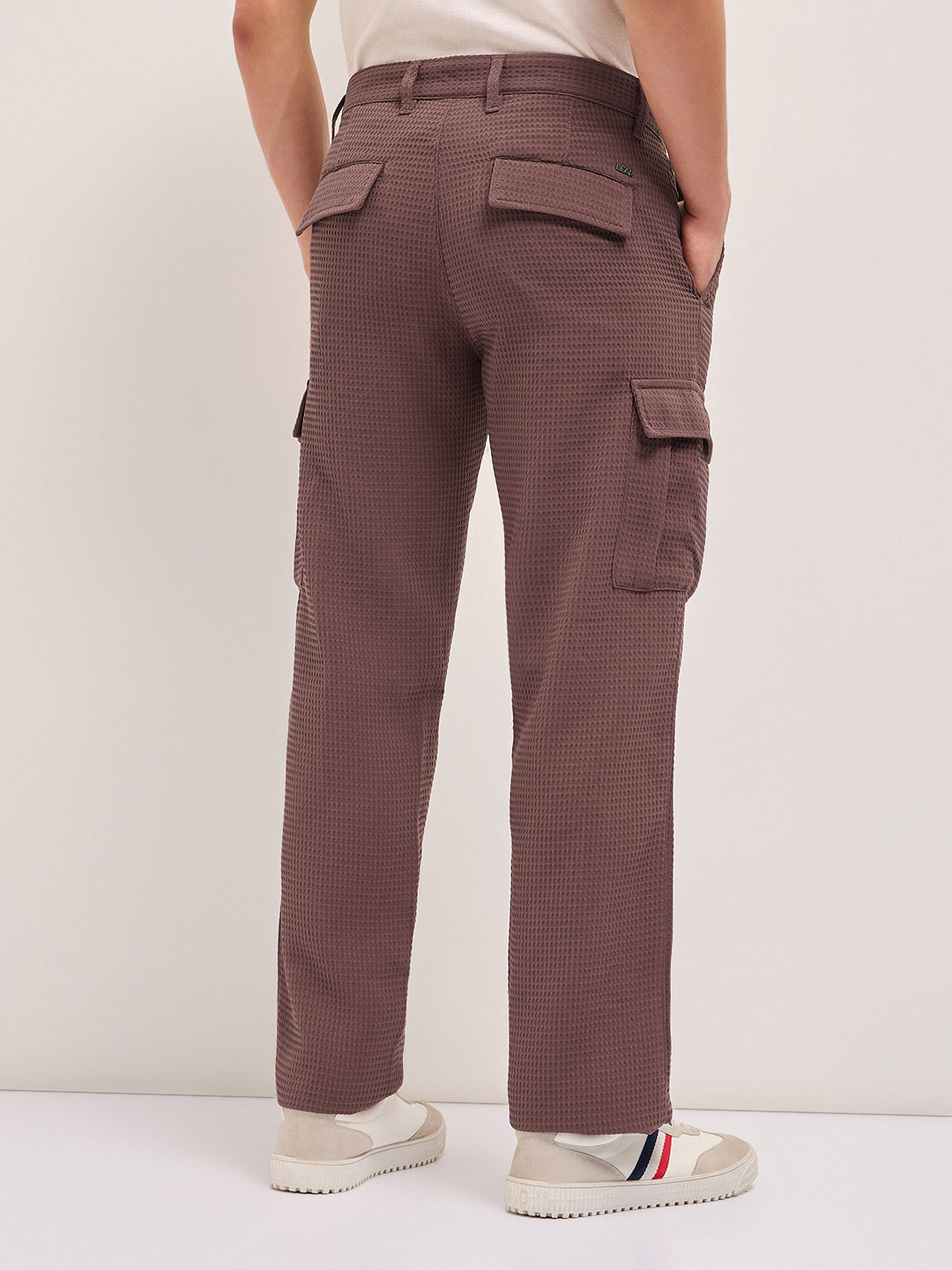 Maroon Textured Waffle Weave Straight Fit Cargo Pants with Flap Pockets