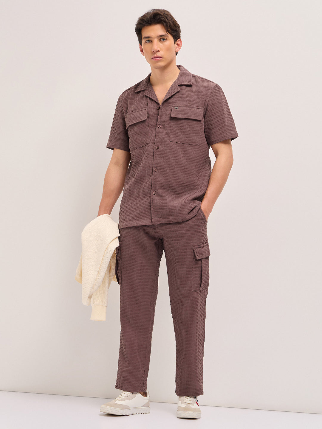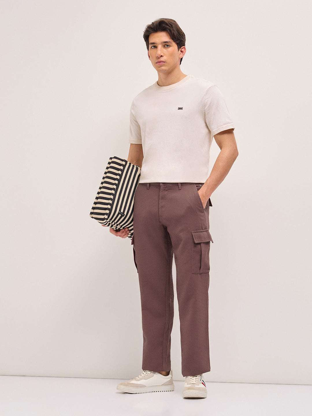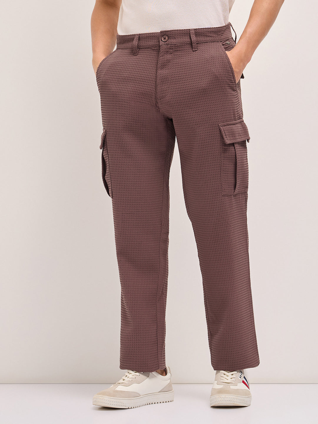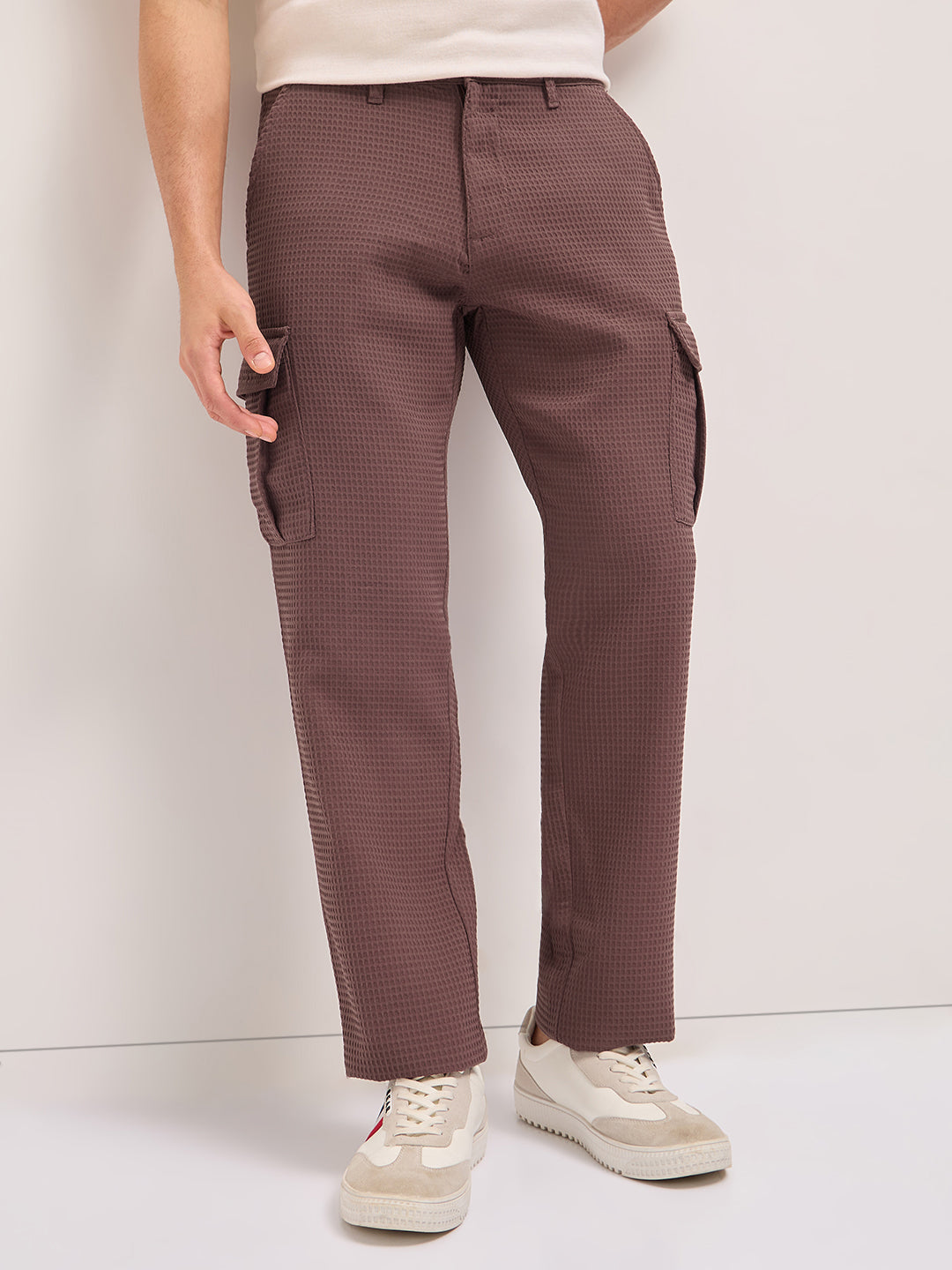 Maroon Textured Waffle Weave Straight Fit Cargo Pants with Flap Pockets