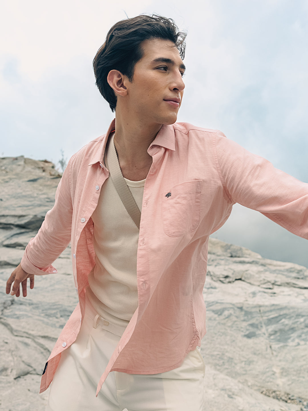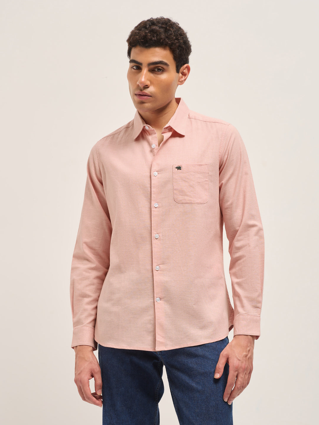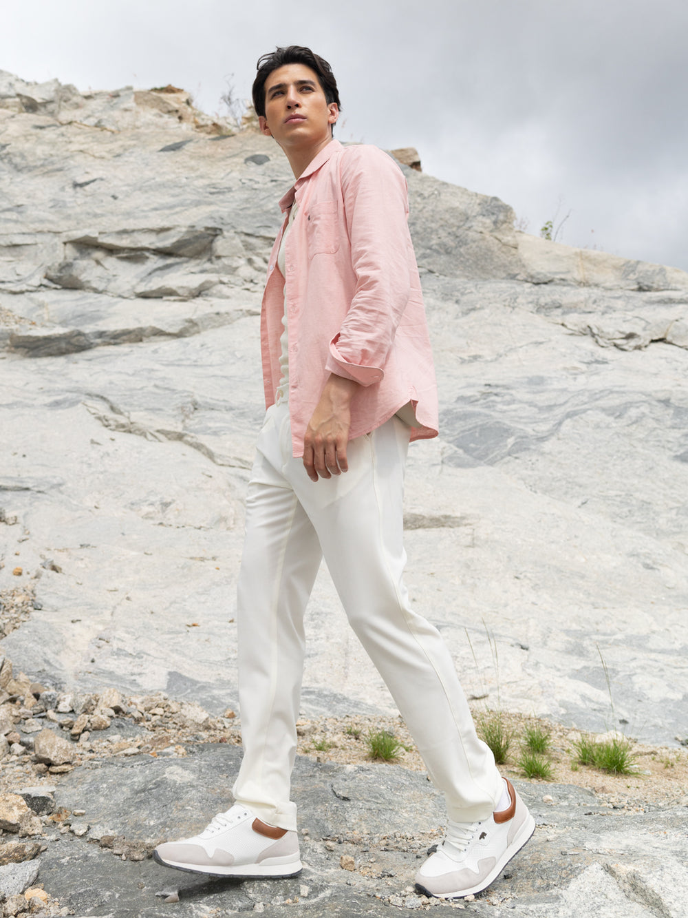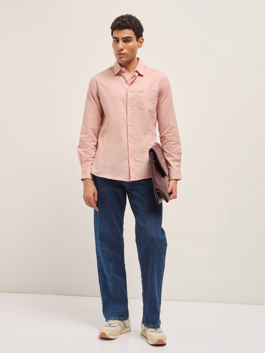 Shop Pink Cotton Linen Slim Fit Solid Casual Shirt Online.