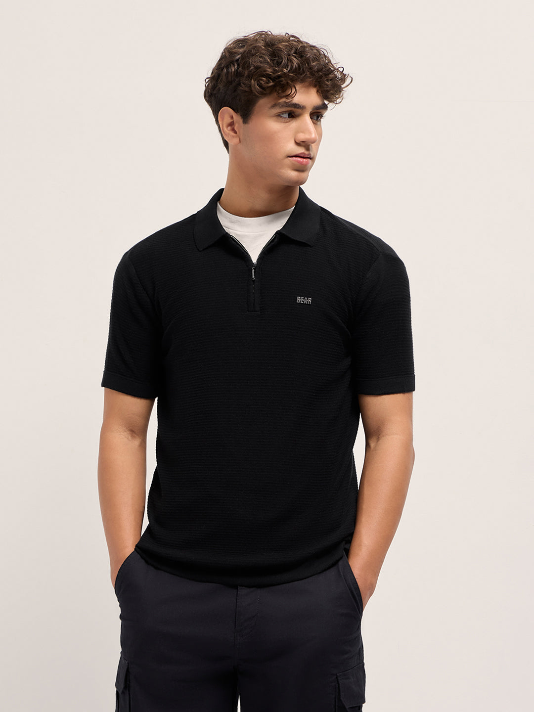Shop Black Textured Flat Knit Slim Fit Polo with Zip Placket Online.
