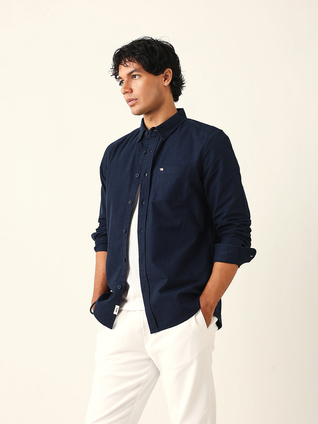 Shop Navy Blue Solid Slim-Fit Casual Shirt with Button-Down Collar Online.