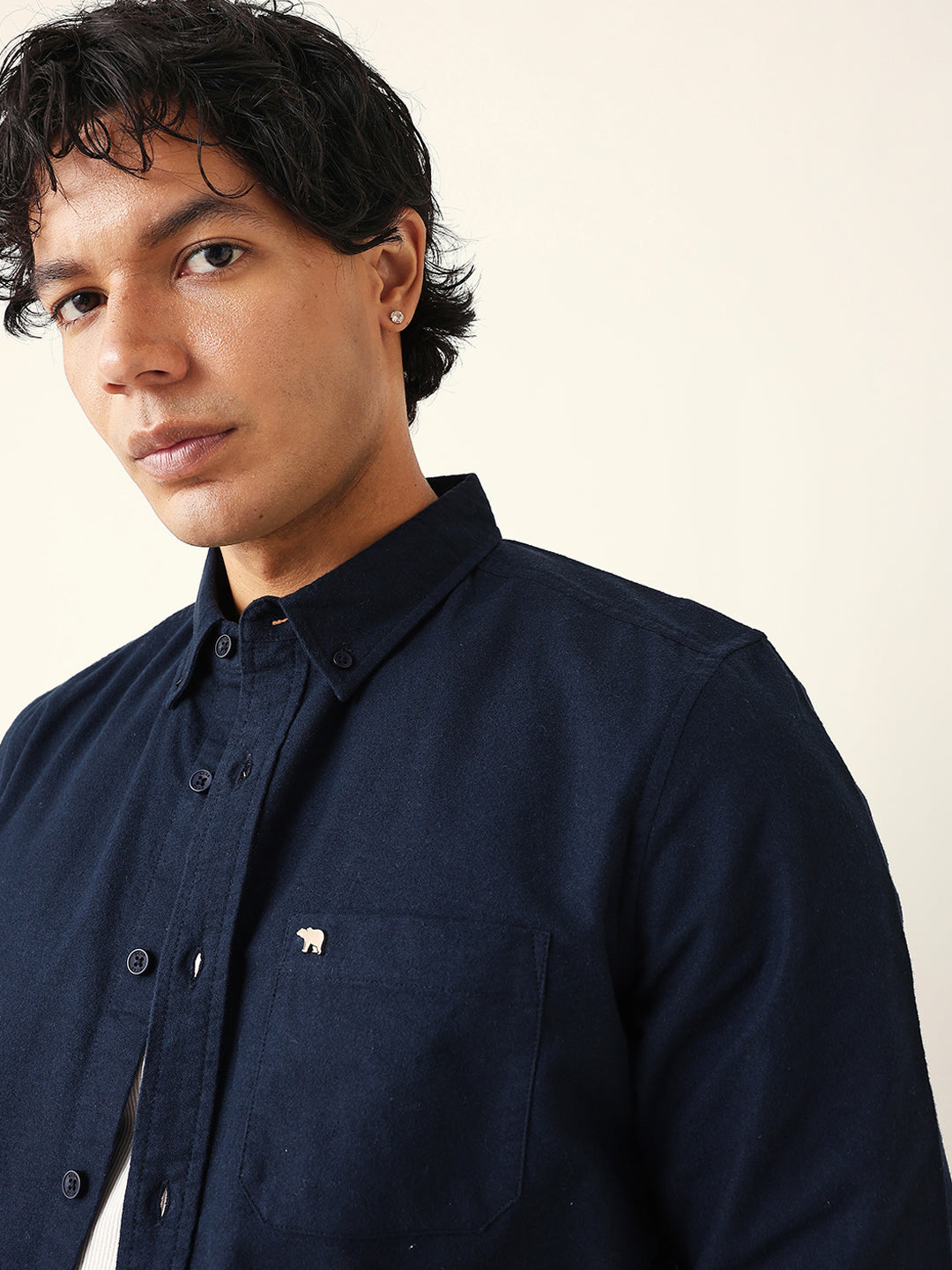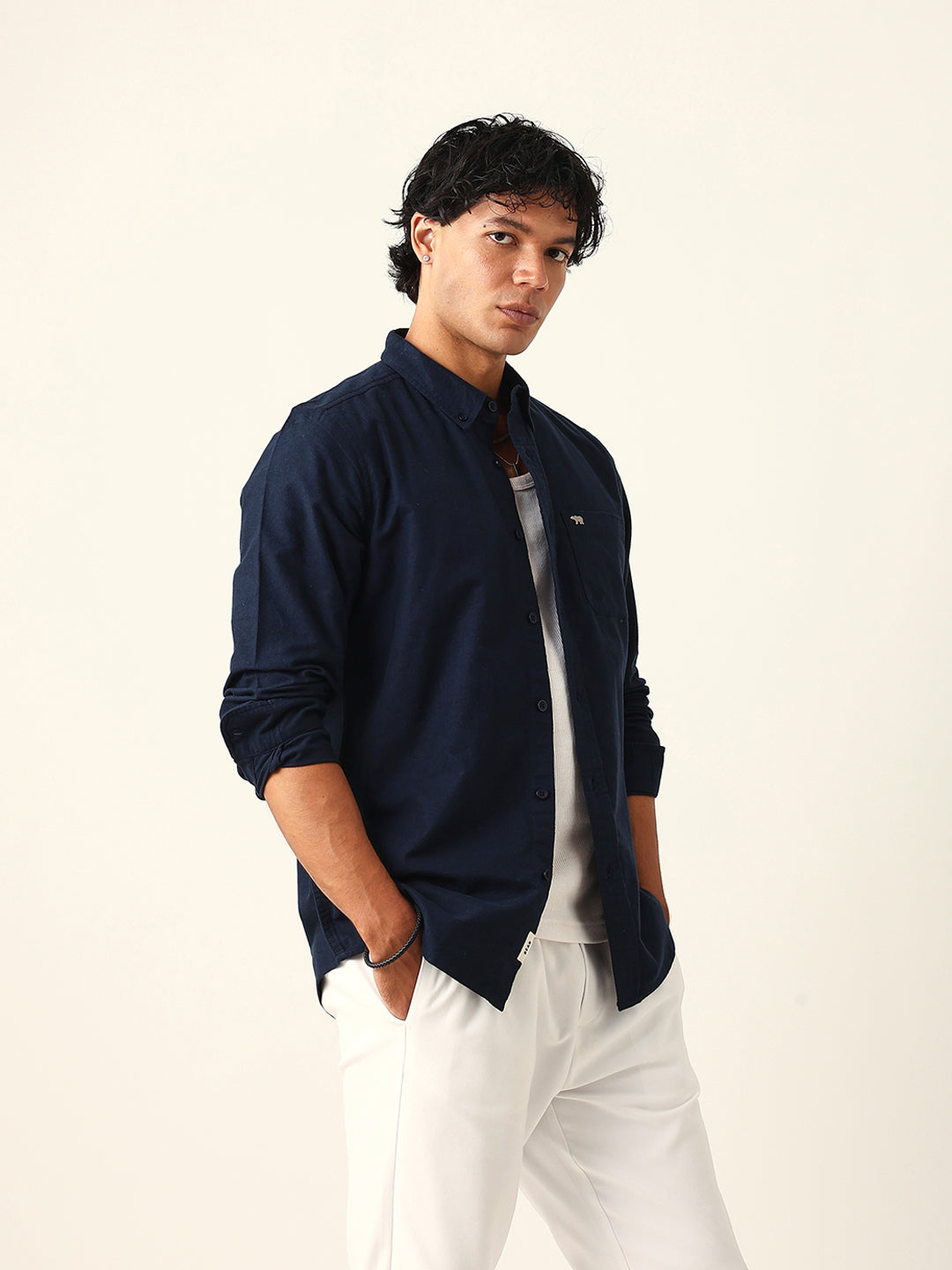 Navy Blue Solid Slim-Fit Casual Shirt with Button-Down Collar