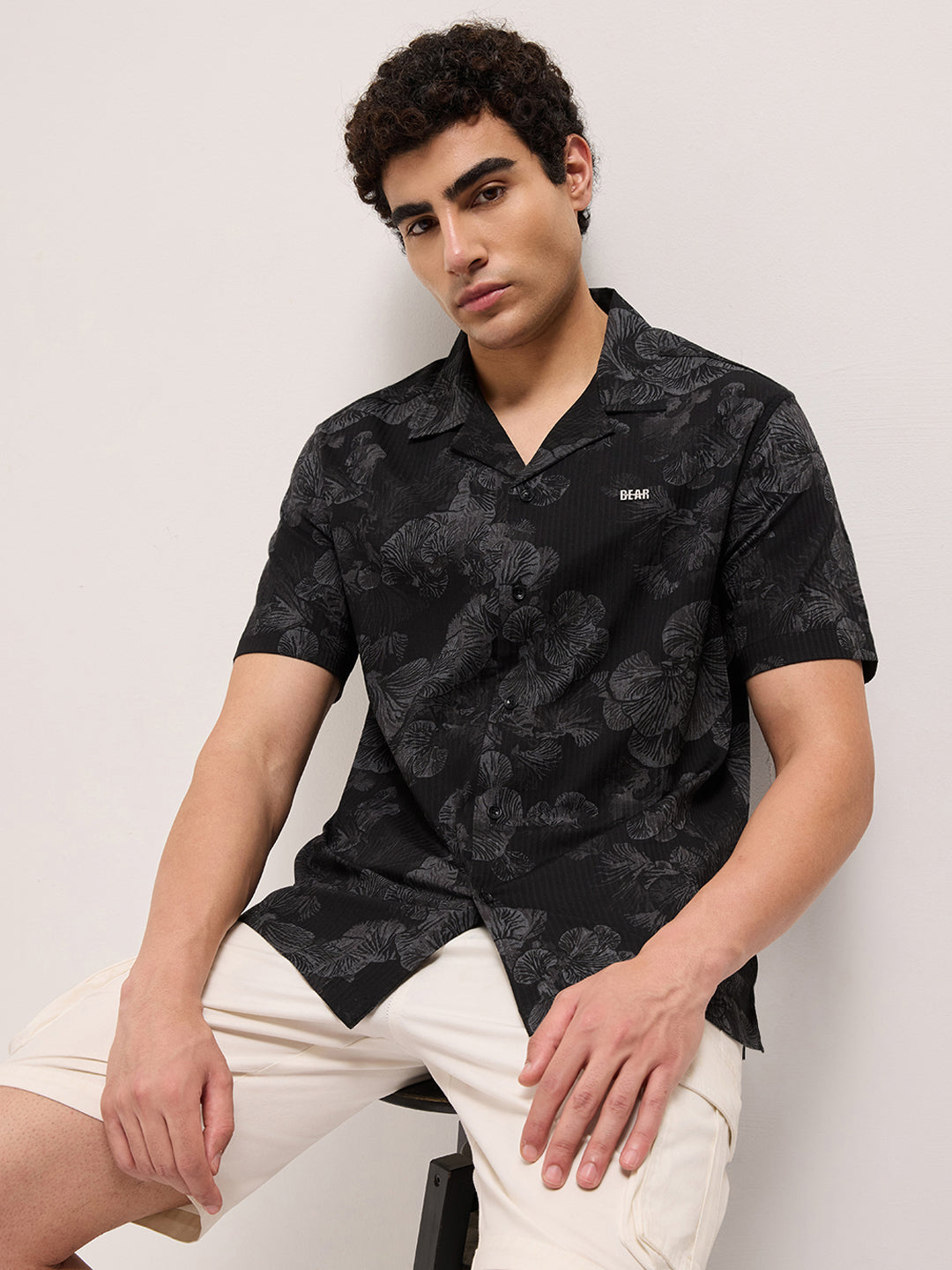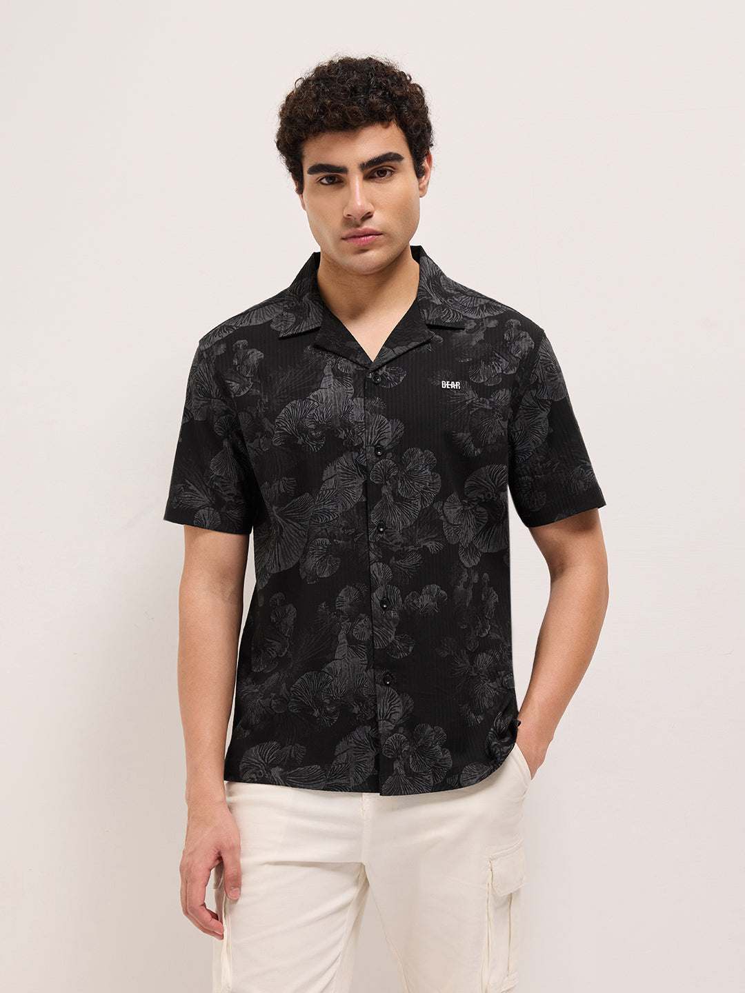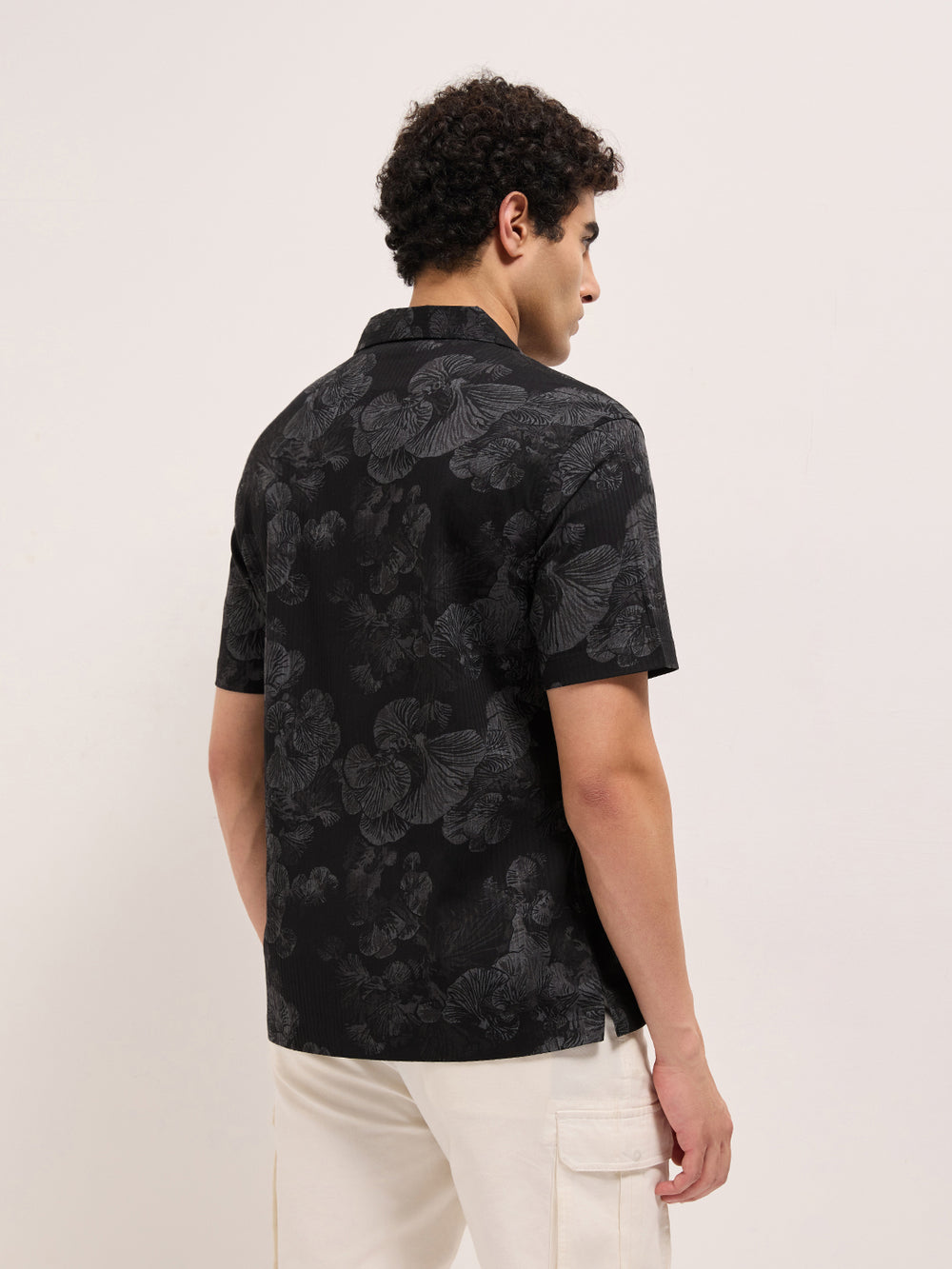 Black Tropical Floral Print Relaxed Fit Cuban Collar Shirt