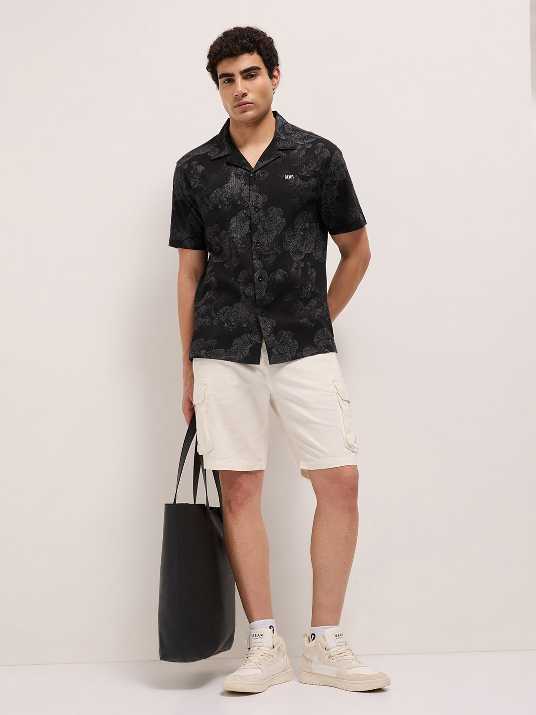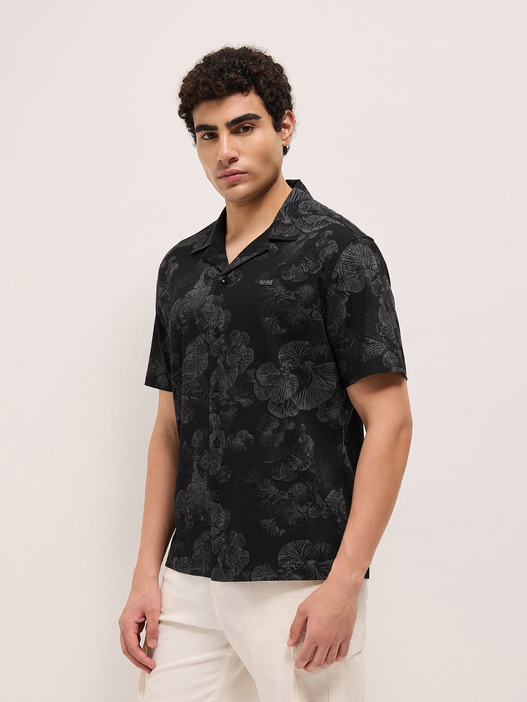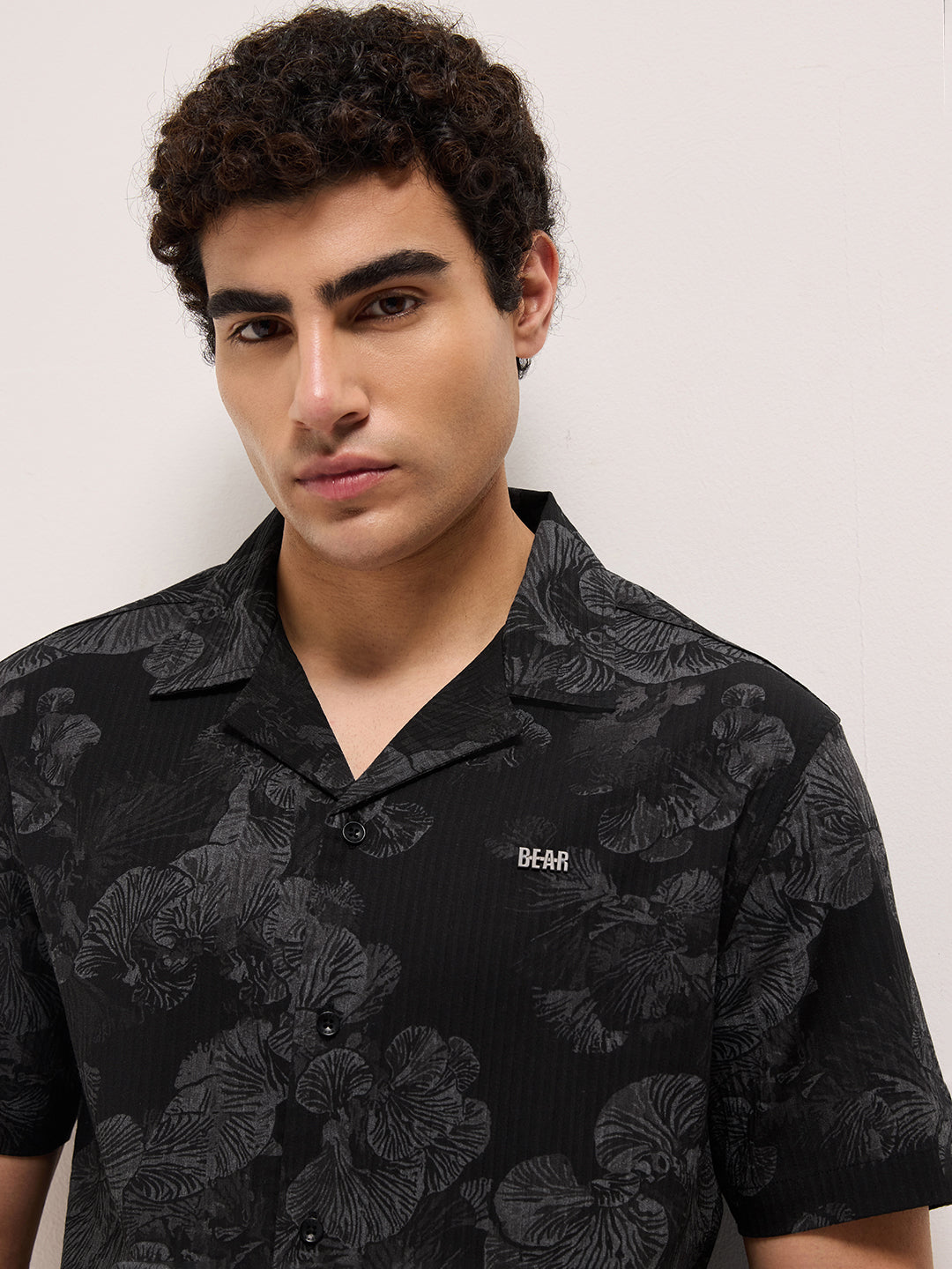 Black Tropical Floral Print Relaxed Fit Cuban Collar Shirt