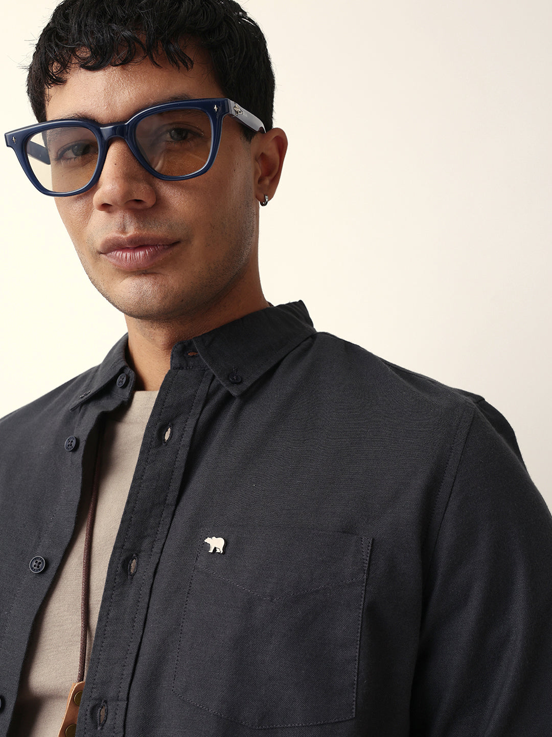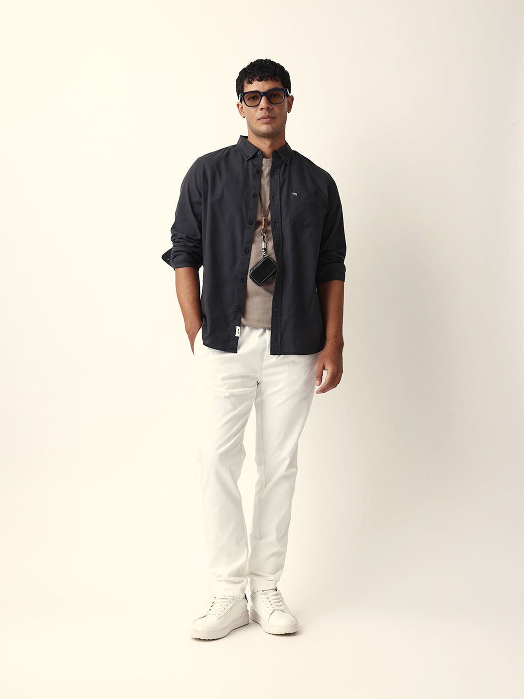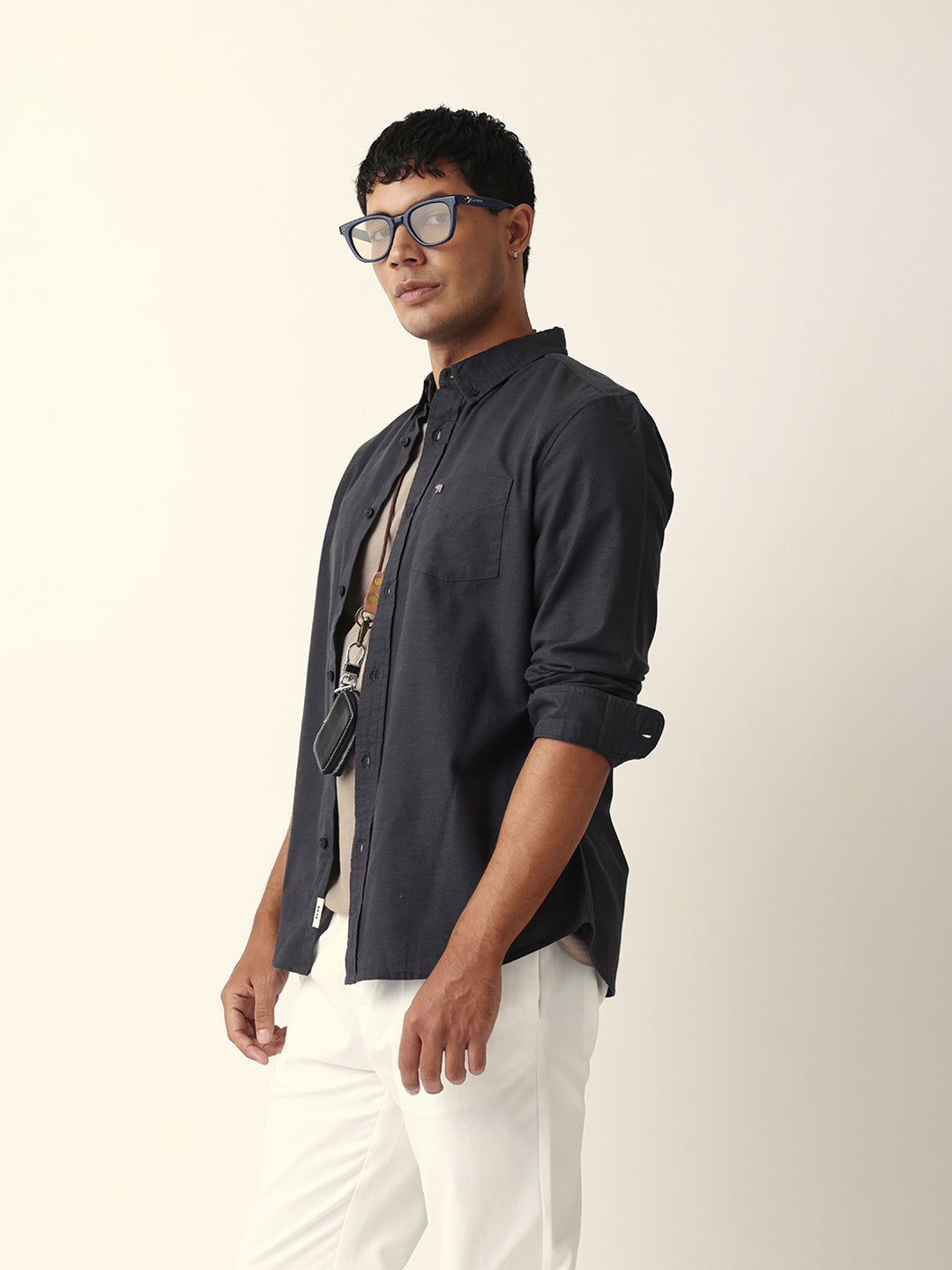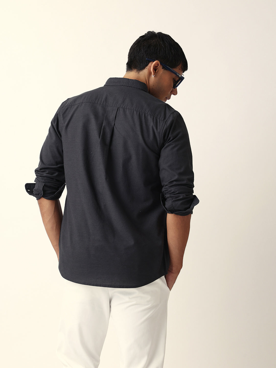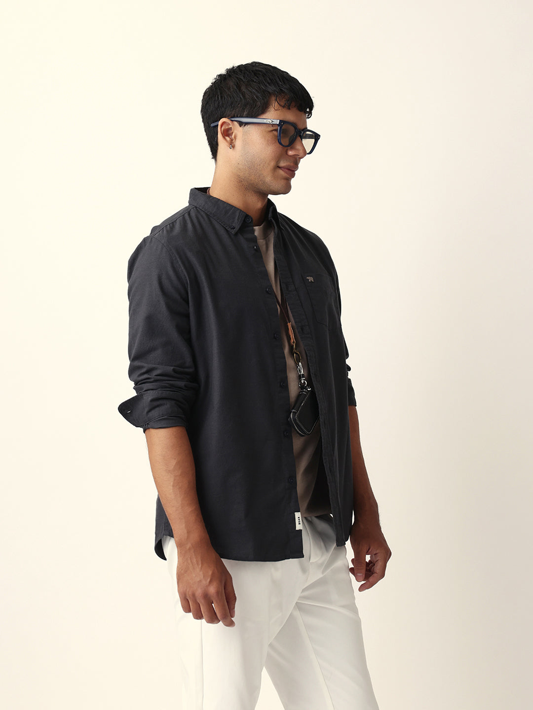 Black Solid Slim-Fit Casual Shirt with Button-Down Collar